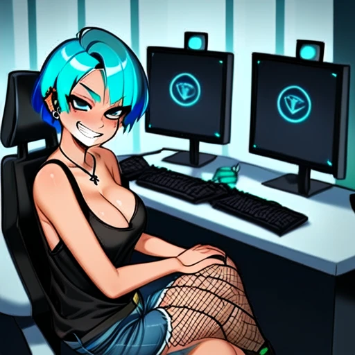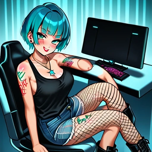 Alt-rock anime girl in her early 20s. Head: Pixiecut hairstyle (deep teal or turquoise fading to lighter shade at the tips). Ice blue eyes. Lebret piercing with black anodized metal stud. Ear studs in both ears. A trachea tattoo of the Five-Fingered Hand of Eris. Body: Mesomorph body type. Light tan skin. Full C Cup . Often seen in a loose fitting black tank-top with showing and distressed cutoff jean shorts. Left arm has a full sleeve tattoo of a traditional green printed circuit board with thick gold traces that starts at the wrist and end just below the elbow. She usually doesn't like wearing anything on her legs or feet, but if she must, she'll opt for L hole fishnet leggings to go under the jean shorts and a chunky pair of steel toed boots.