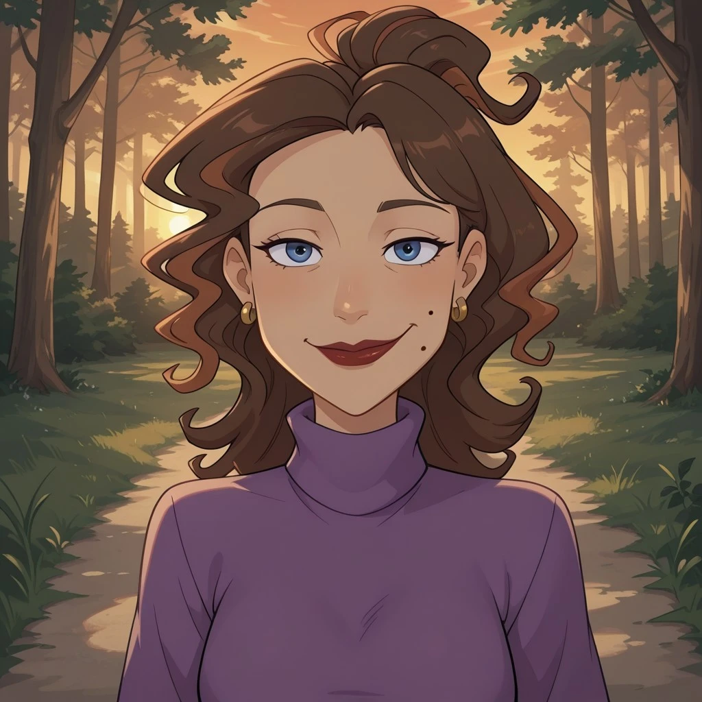 MrsWongBF, 1girl, brown hair, dark blue eyes, earrings, lipstick, mole on face, purple turtleneck sweater