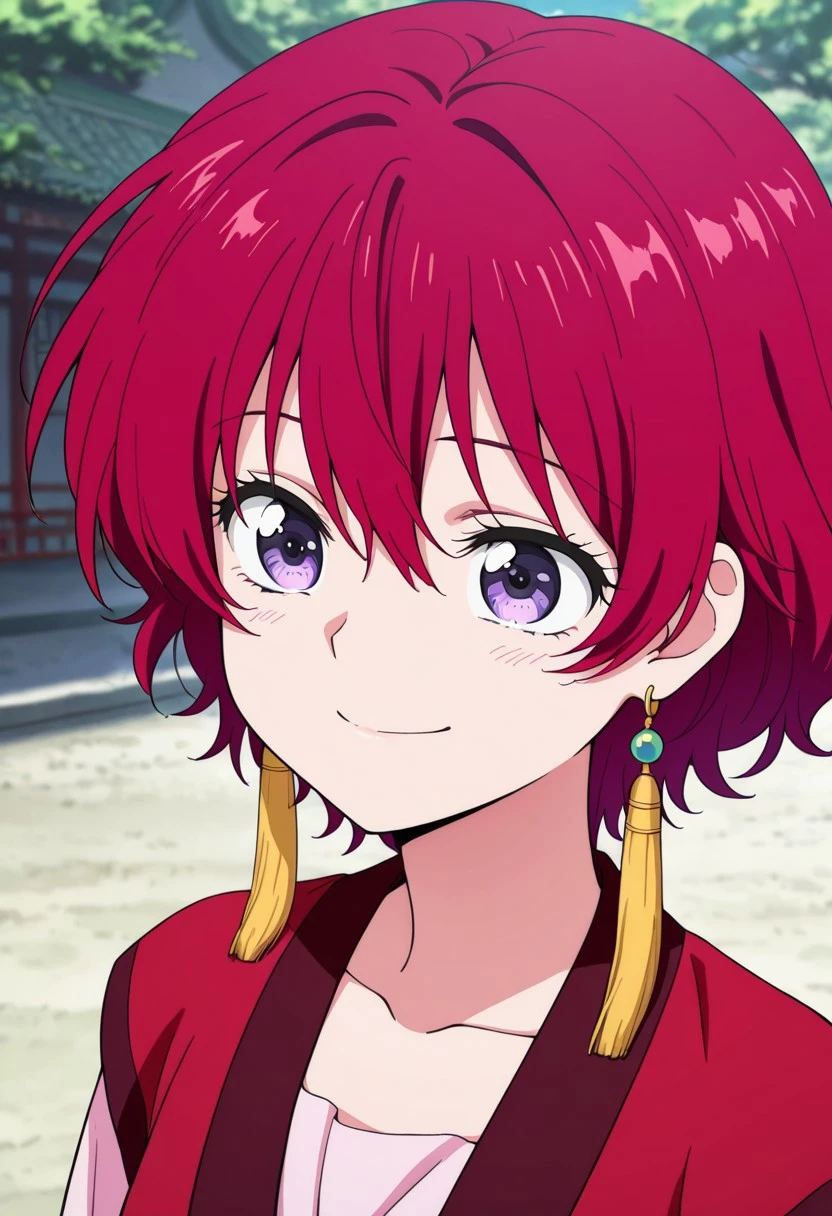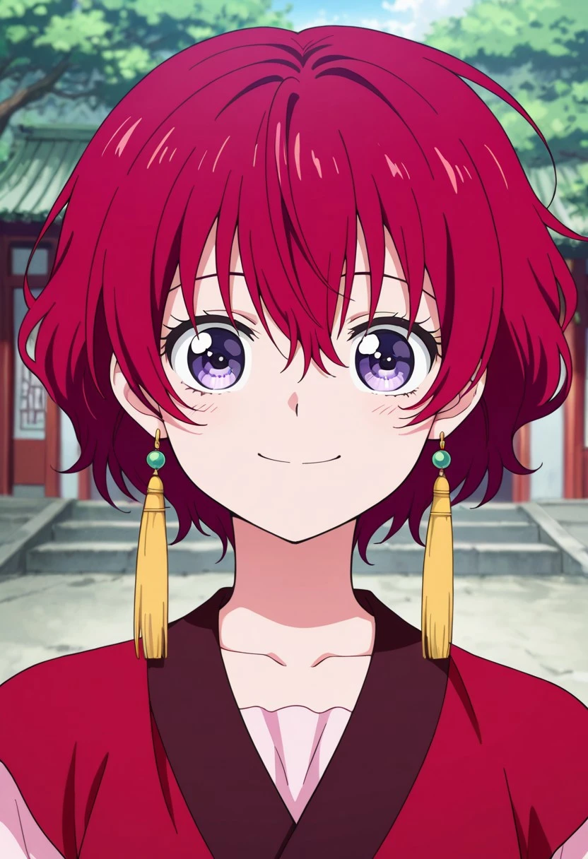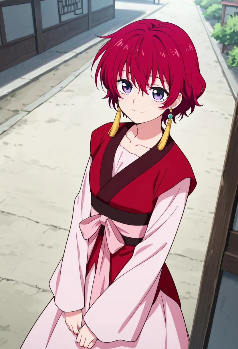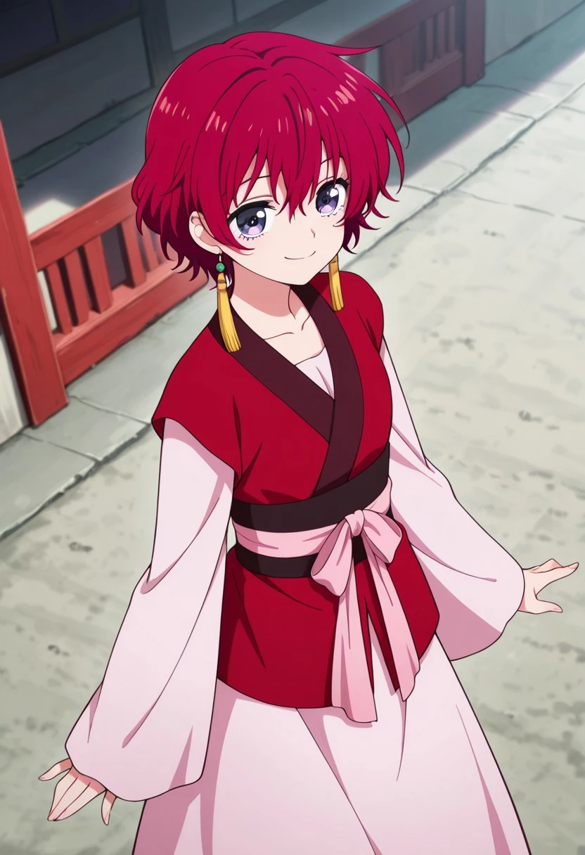 akatyon, 1girl, solo, purple eyes, red hair, short hair, tassel earrings, chinese clothes, collarbone, pink dress, long sleeves, red vest, obi,