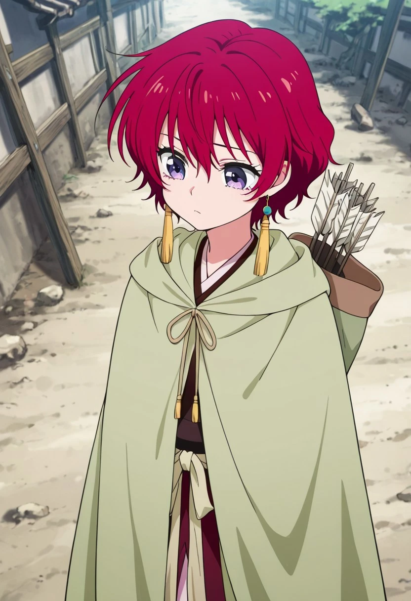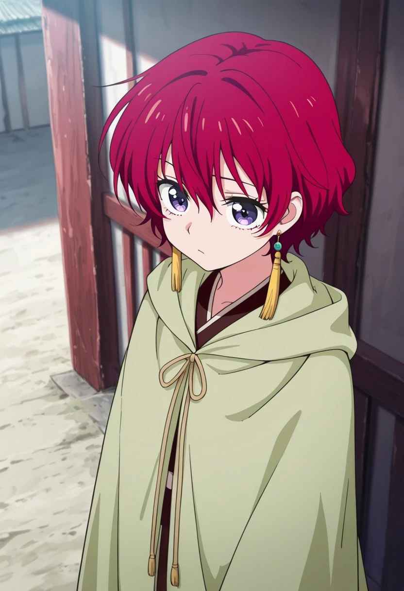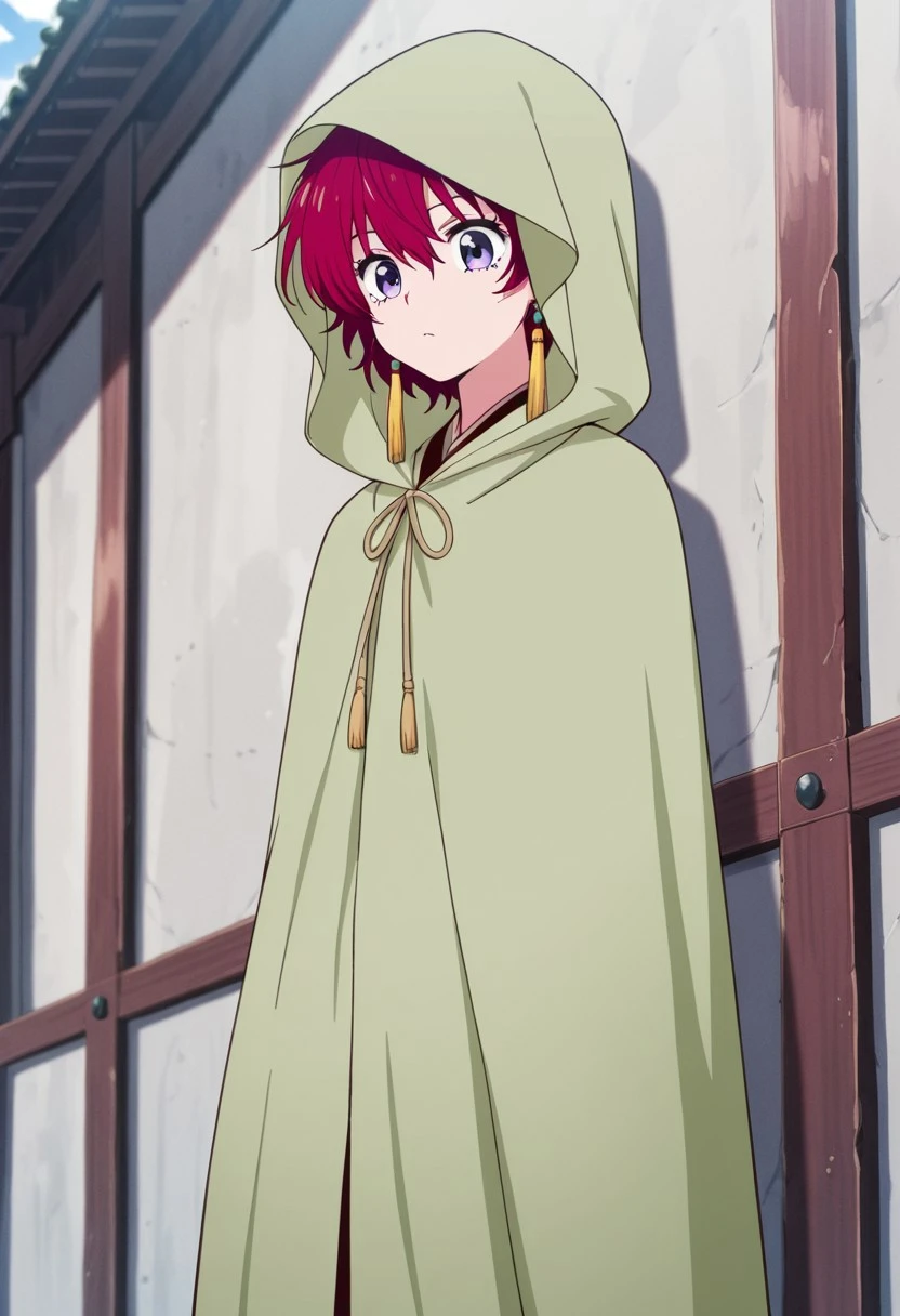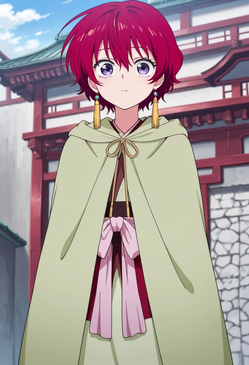 akatyon, 1girl, solo, purple eyes, red hair, short hair, tassel earrings, chinese clothes, pink dress, long sleeves, red vest, obi, green cloak, hood,