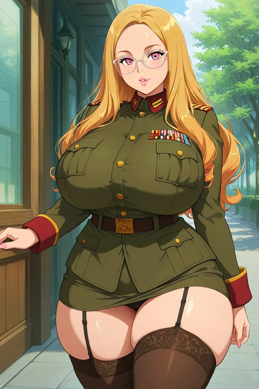 1girl, sandy, light brown_hair, long_hair, pink_eyes, glasses, glossy lips, massive_breasts, extremely sexy, curvy, wide hips, thick thighs, dress, skin tight dress, sexy figure