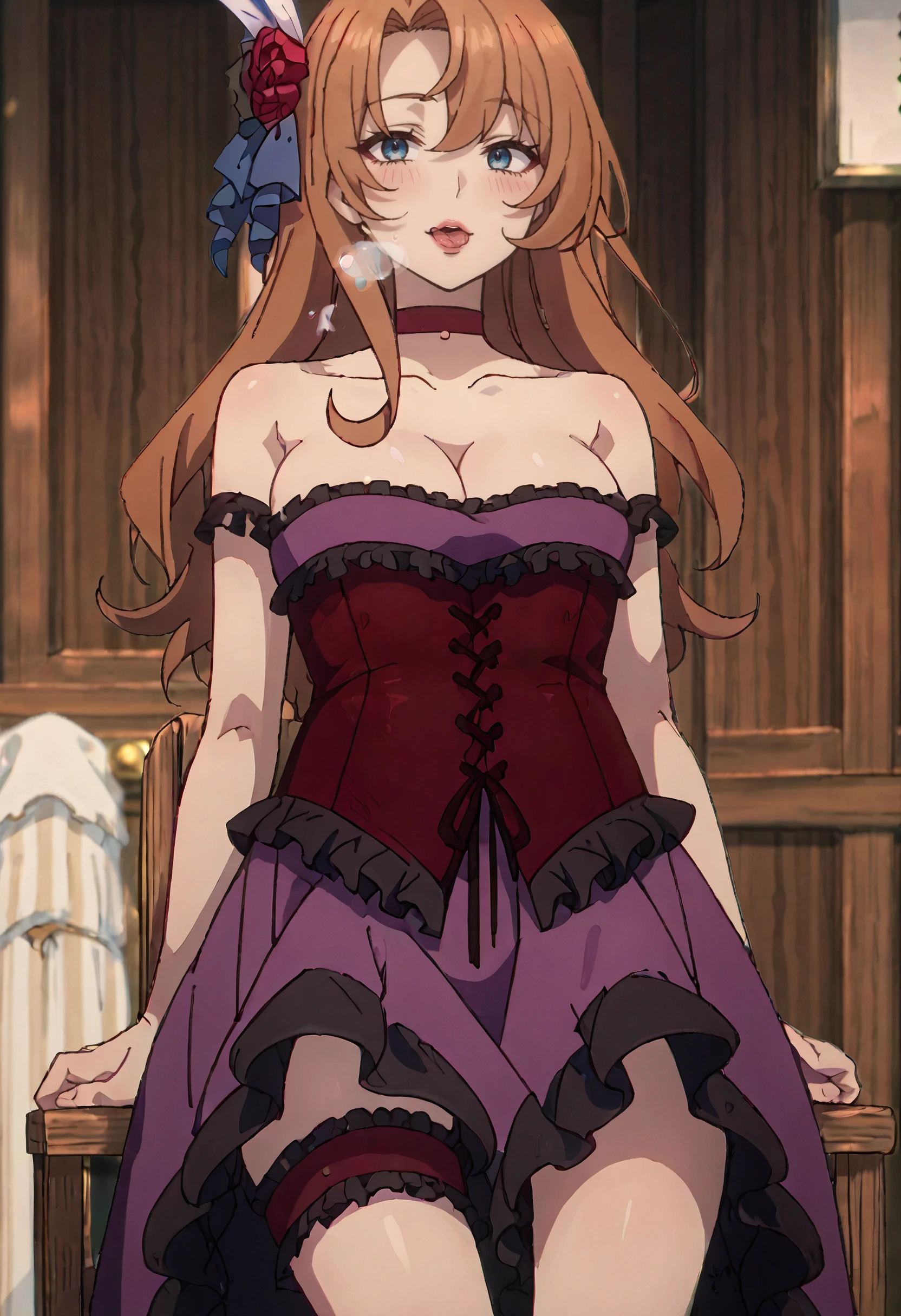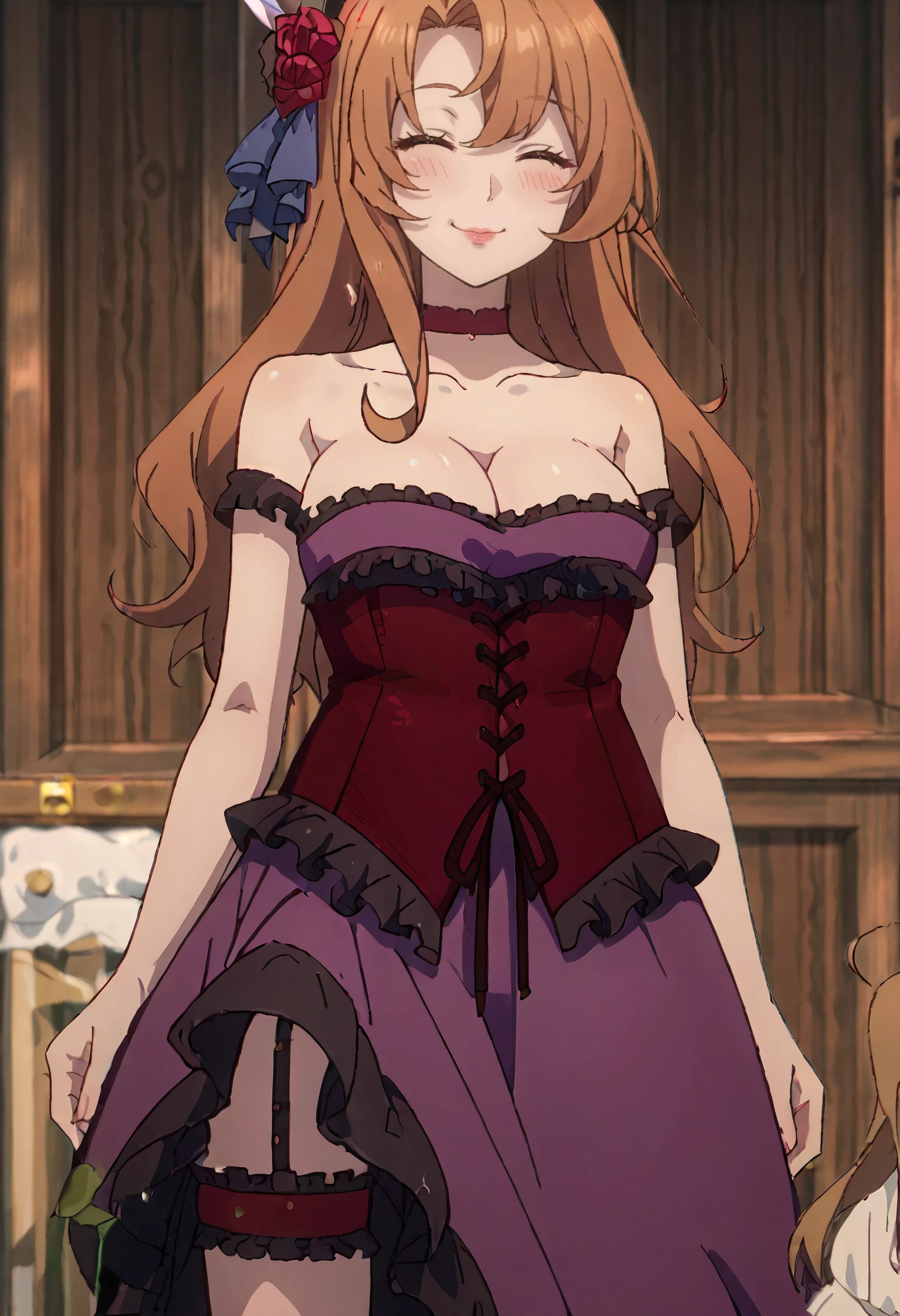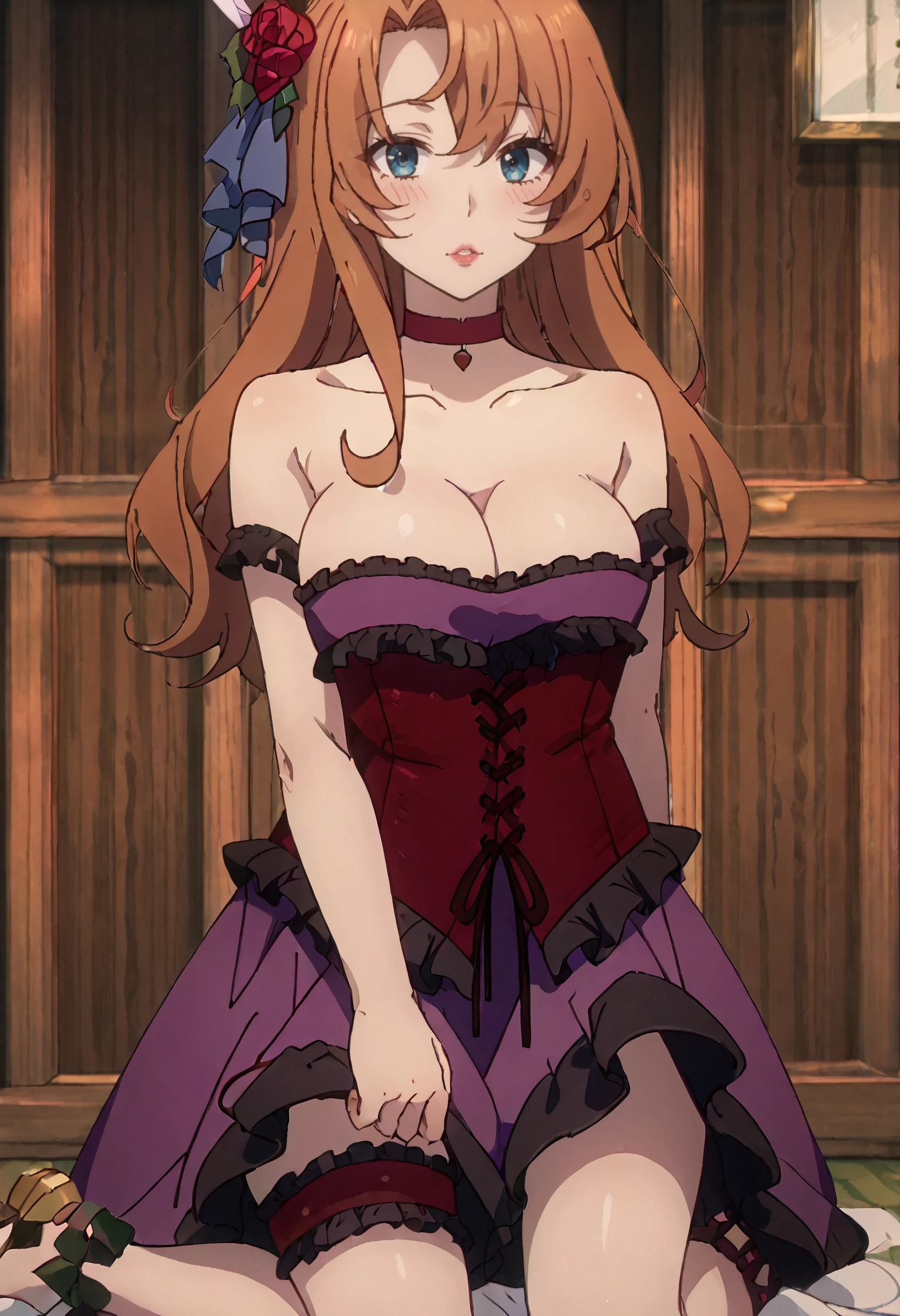 DorisOutfit, cleavage, flower, red choker, purple dress, bare shoulders, rose, frilled dress, frills, red rose, corset, red corset, thigh strap, ribbon, strapless, strapless dress, off-shoulder dress, bridal garter, sleeveless dress,