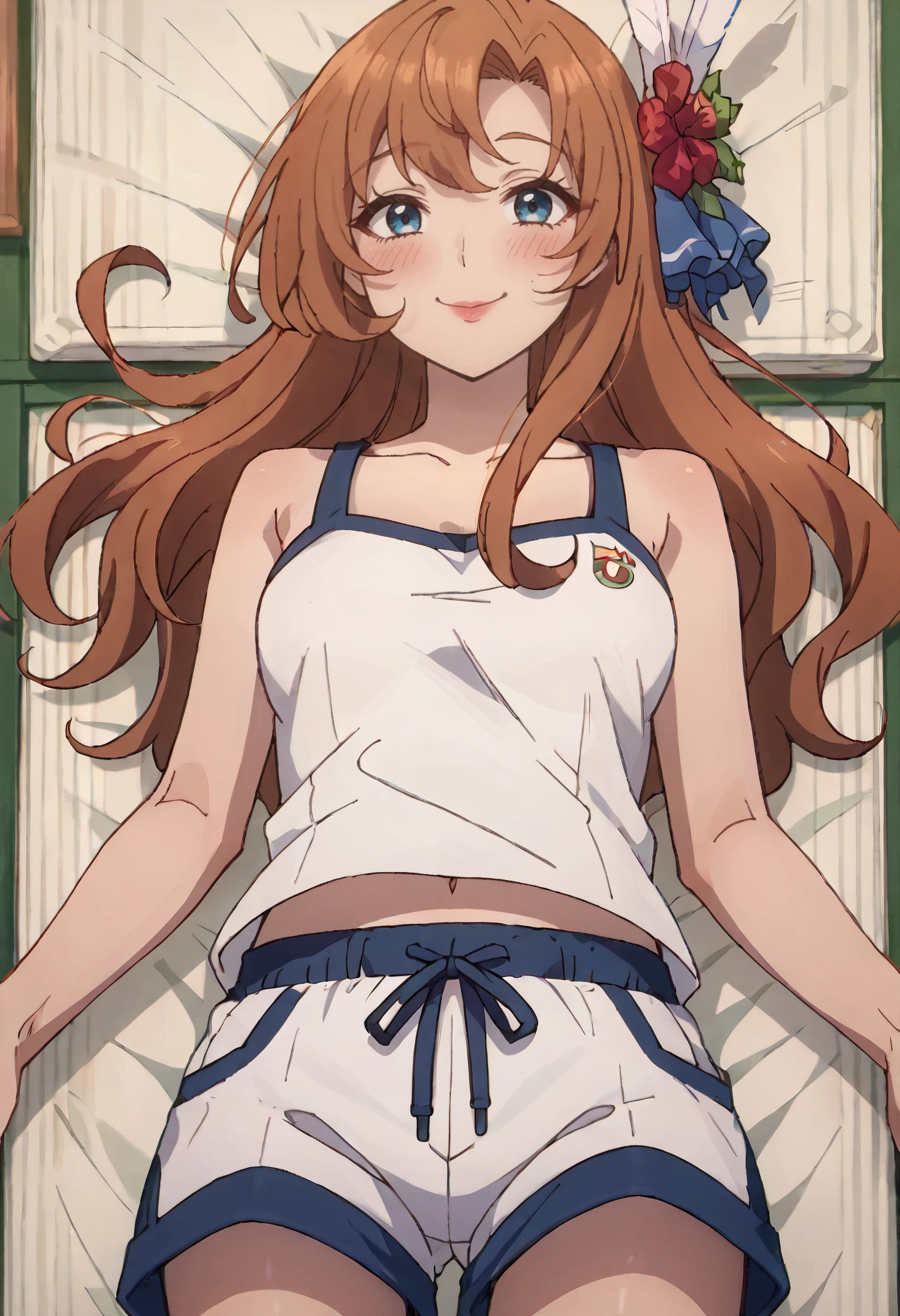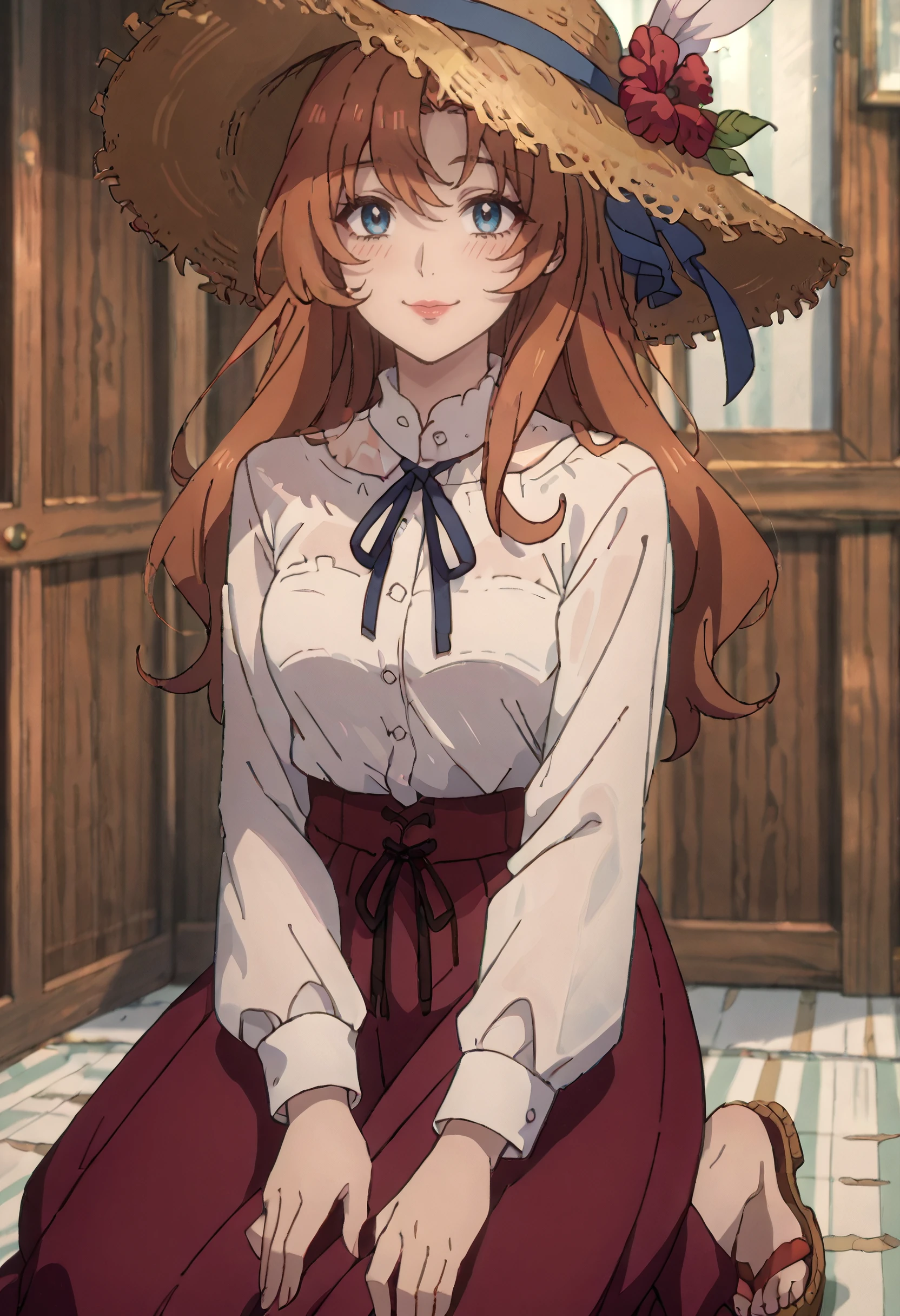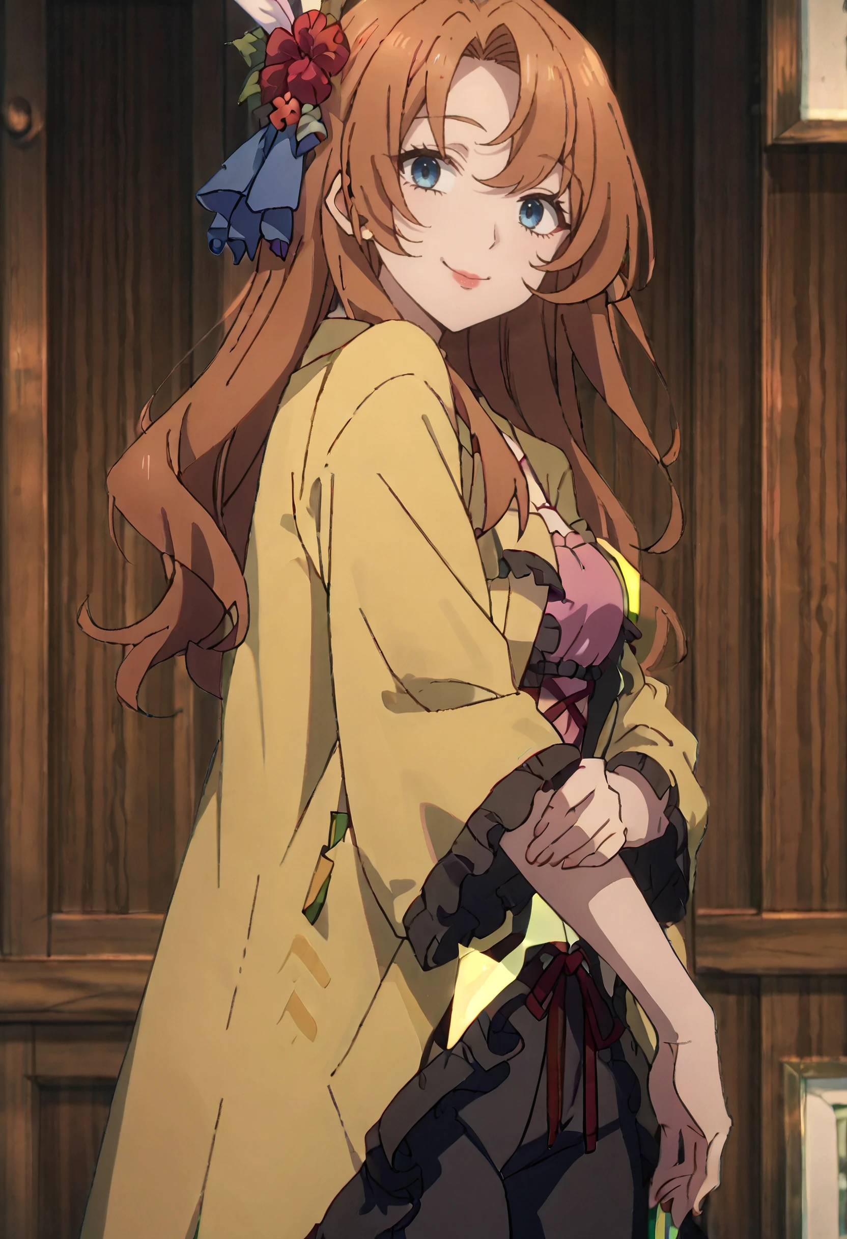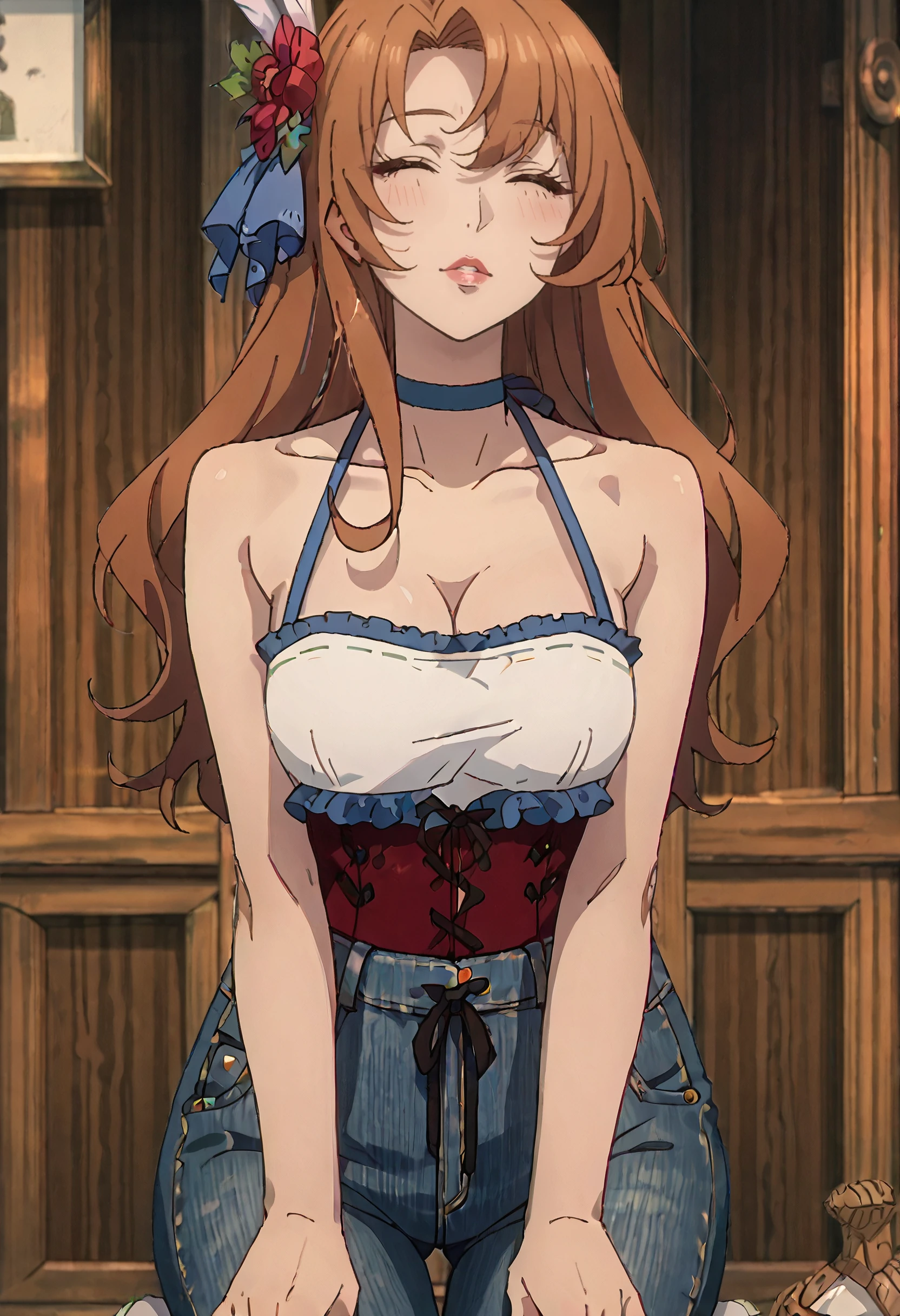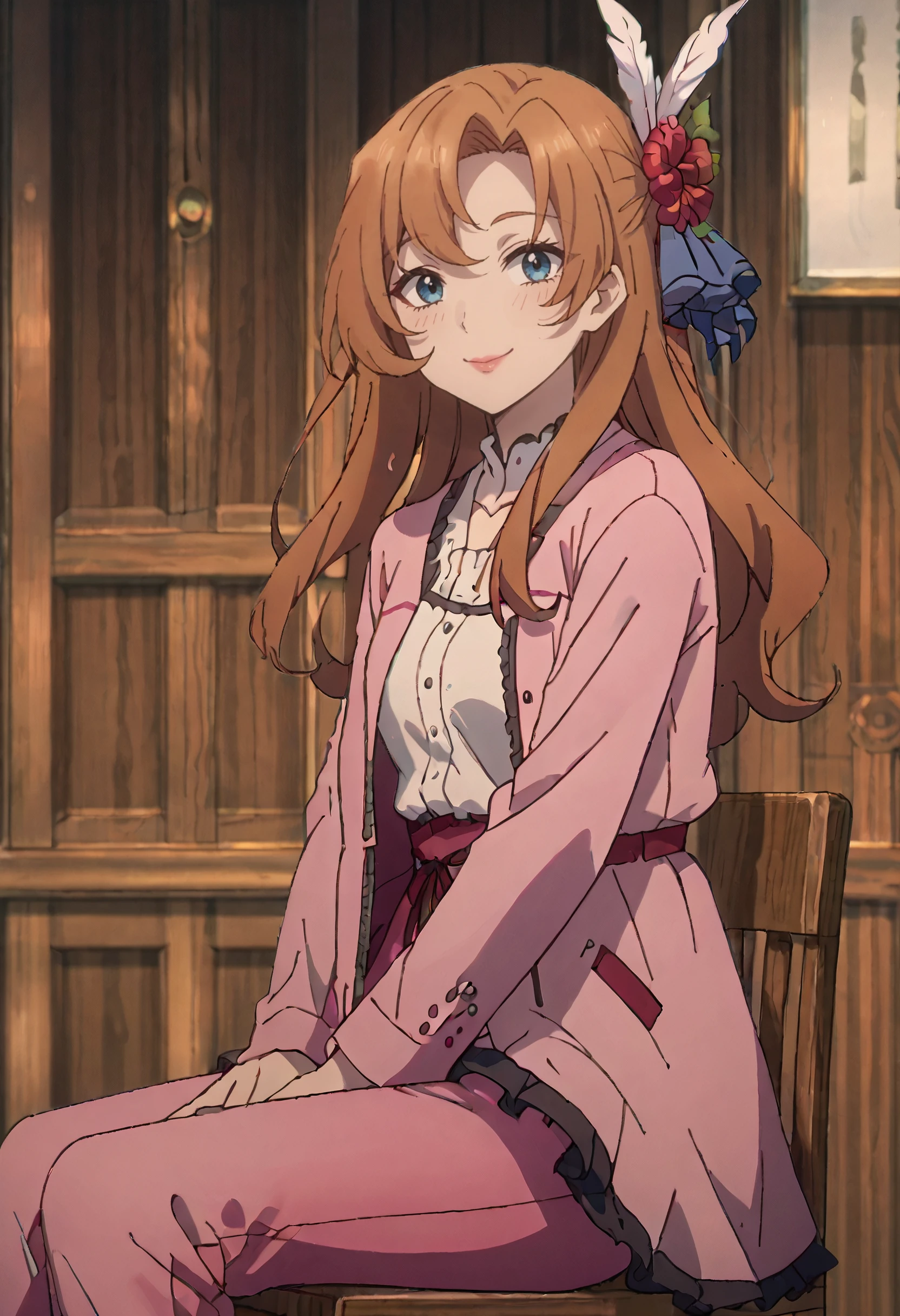 SWCDoris, hair flower, hair ornament, long hair, brown hair, blue eyes, feather hair ornament, red lips,