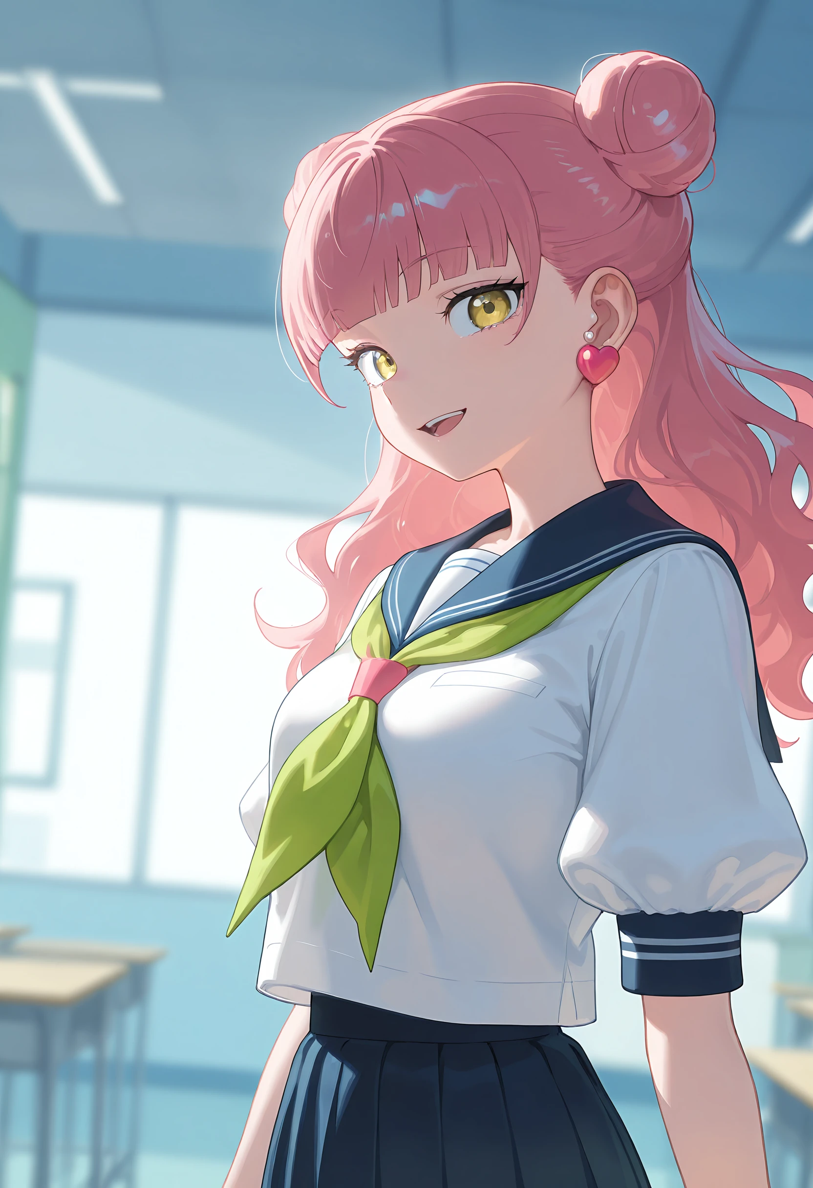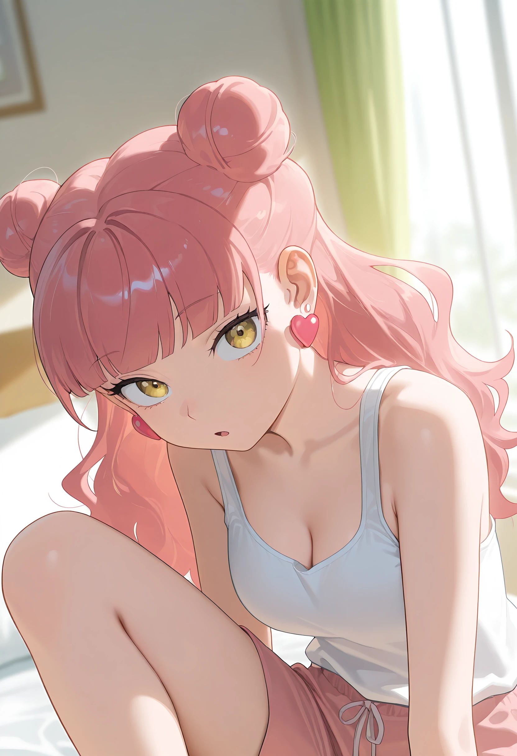 Tags for her look: 1girl, solo, medium breasts, long hair, jewelry, yellow eyes, pink hair, blunt bangs, double bun, wavy hair, heart earrings,