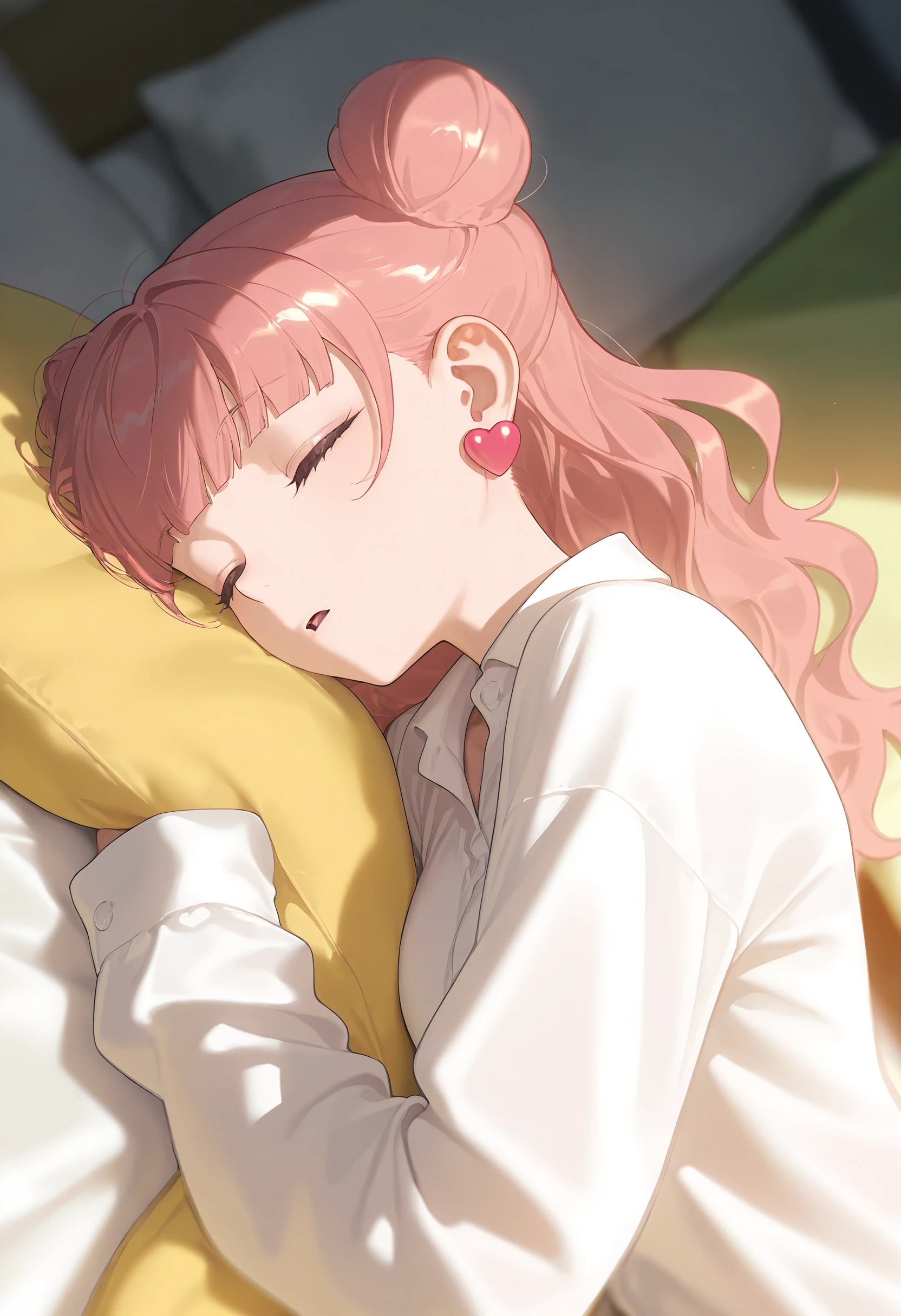 EBMiyu, 1girl, solo, medium breasts, long hair, jewelry, yellow eyes, pink hair, blunt bangs, double bun, wavy hair, heart earrings,