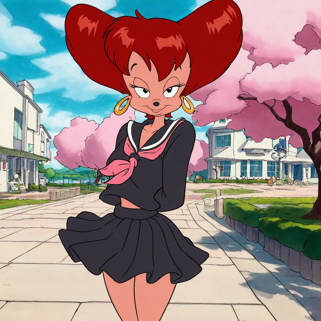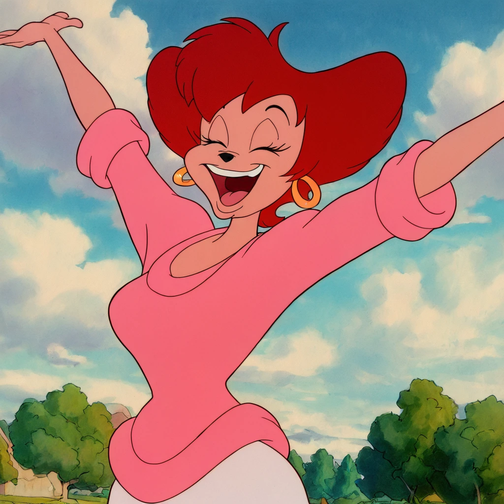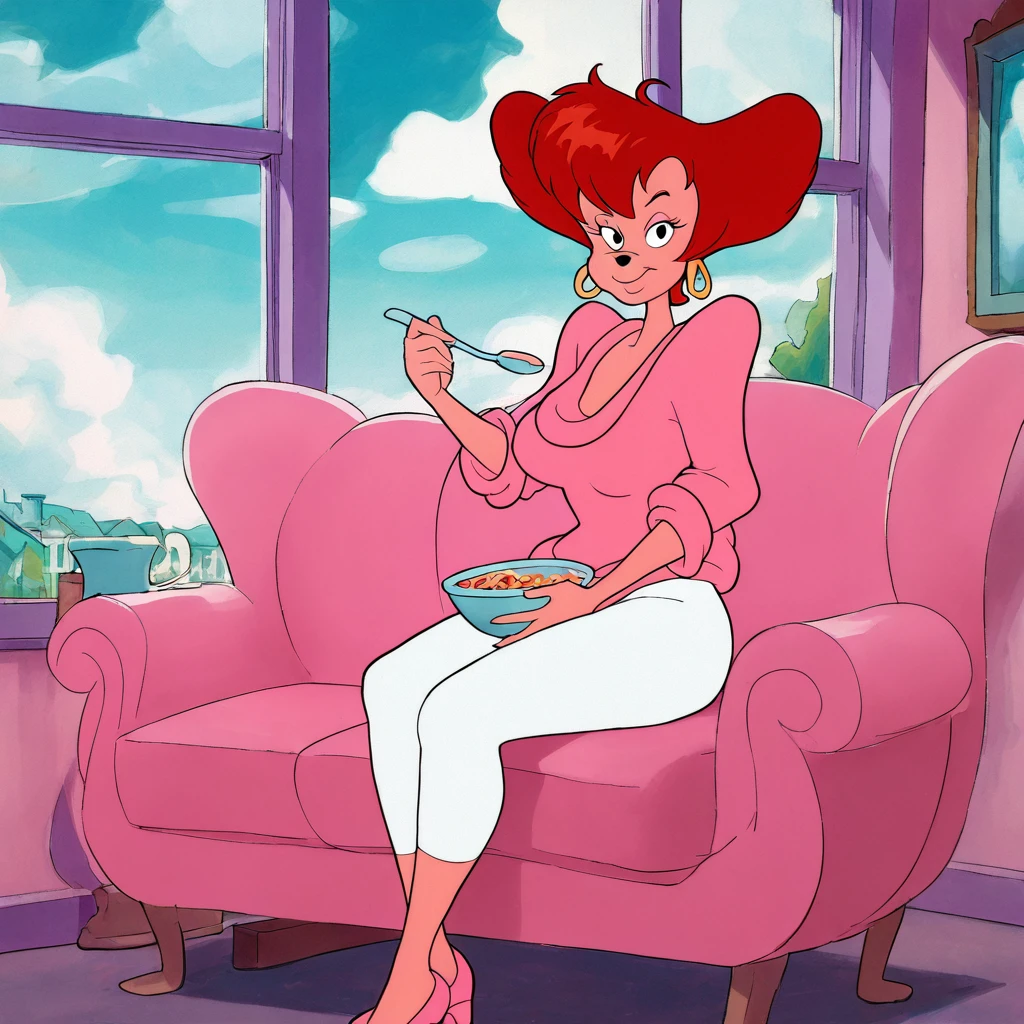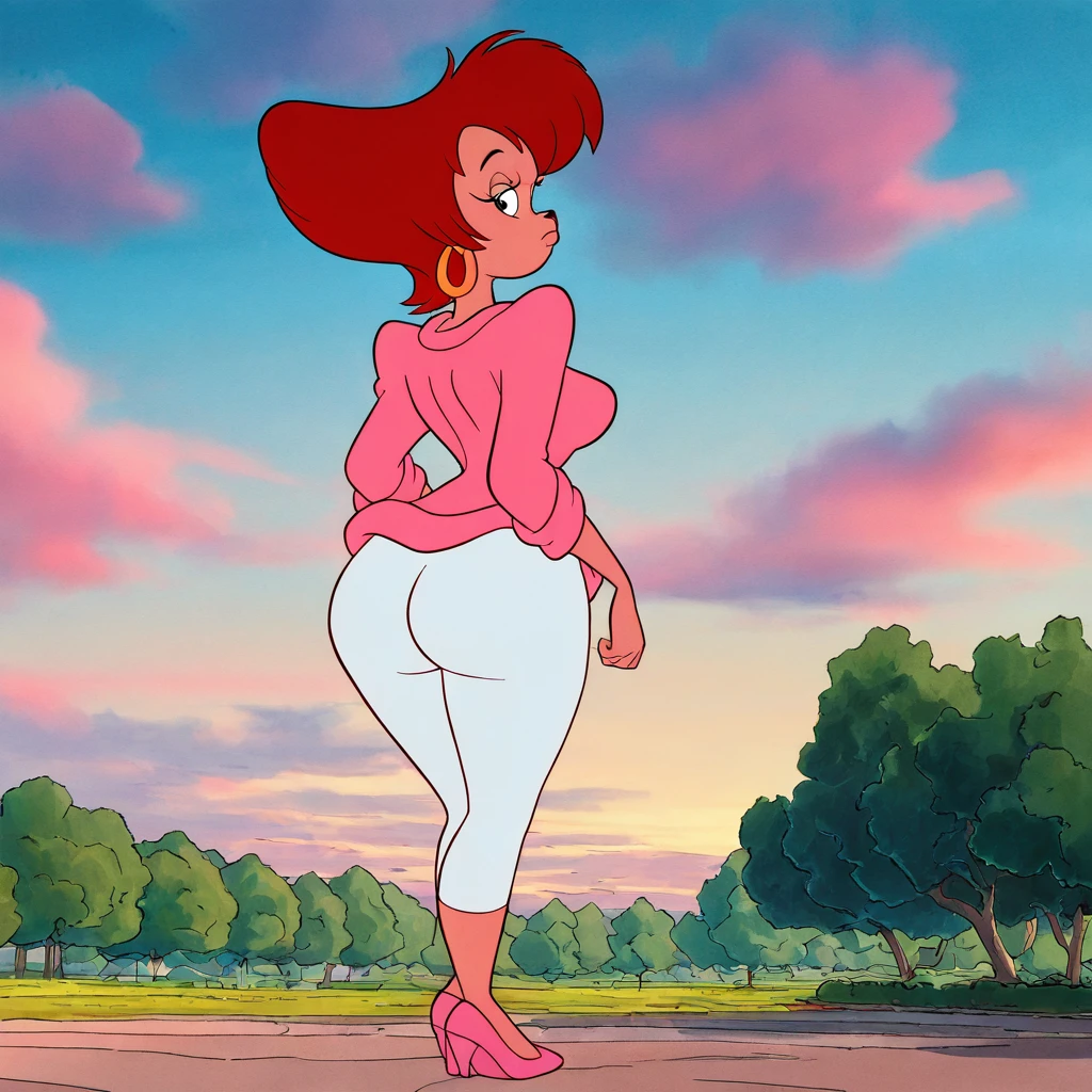 1girl, dark-skinned female, loose pink blouse, red hair, white leggings, rolled-up sleeves, low-heeled pink shoes, voluminous red bob haircut, large hoop earrings, hourglass figure, black nose