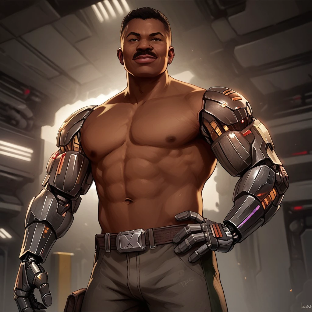 JaxBriggs, dark-skinned male, metal arms, beard, vest,
