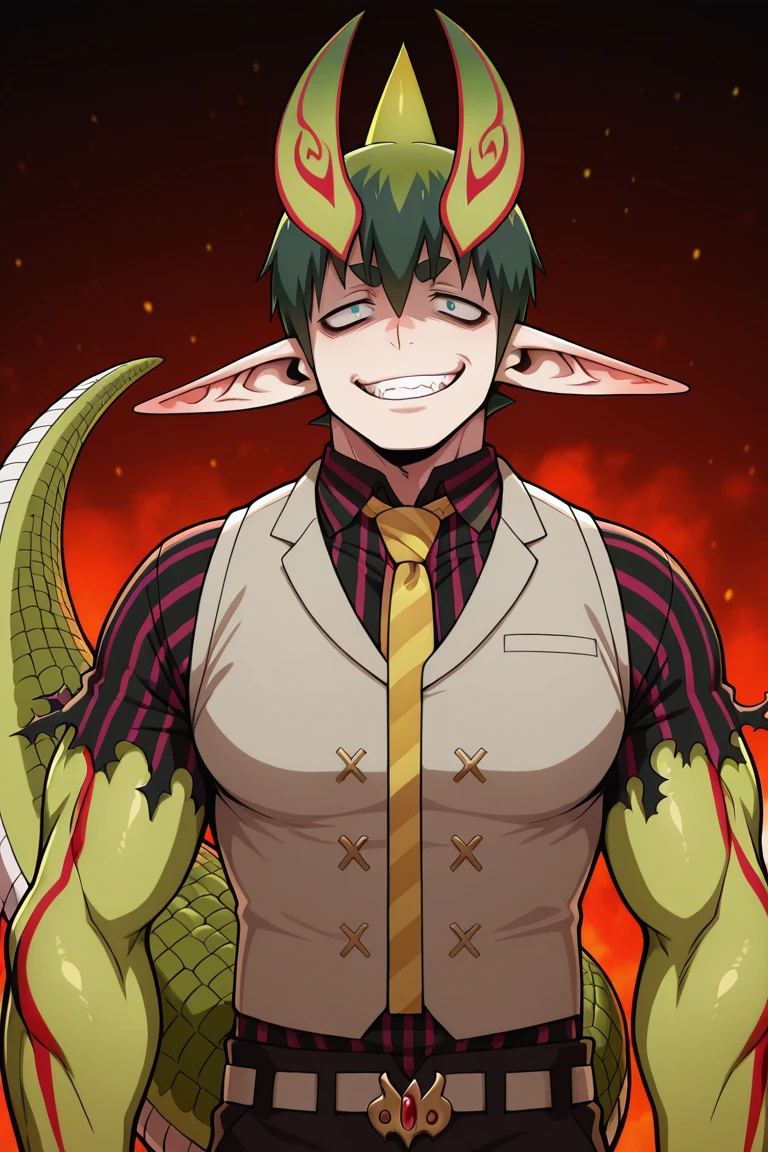 Amaimon, Demon form, solo, 1boy, spike hair, dark green hair, green eyes, white sclera, green pupils, pointy ears, long nails, black nails, long ears, two horns on his head, alligator tail, muscular arms, green arms, red markings black and pink shirt, short sleeves shirt, ripped sleeves, grey vest, yellow necktie, maroon pants, ripped pants, green socks, long socks, green shoes