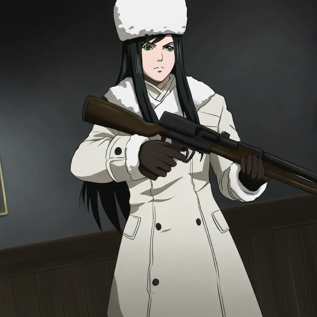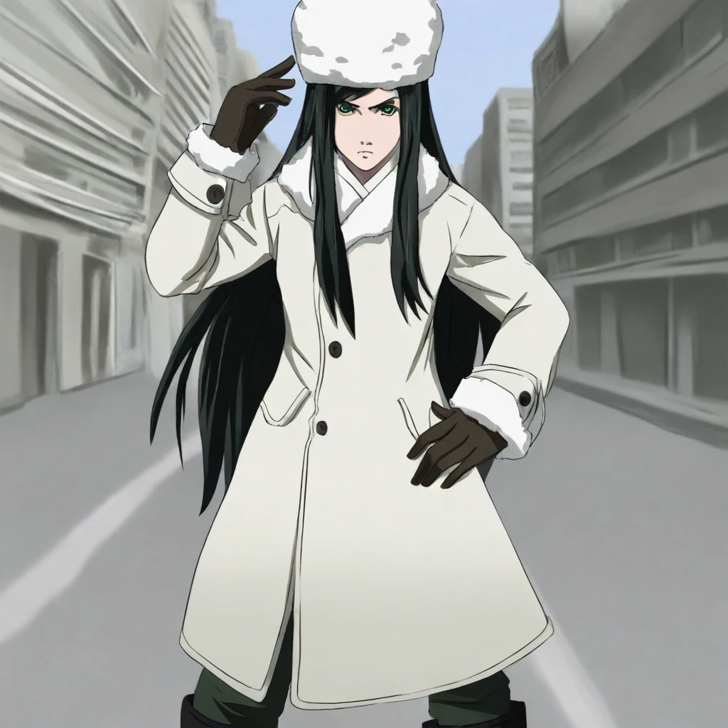 1 girl, solo, YuriTS, black hair, long hair, green eyes, white fur hat, long white coat, fur trim, brown gloves, black boots