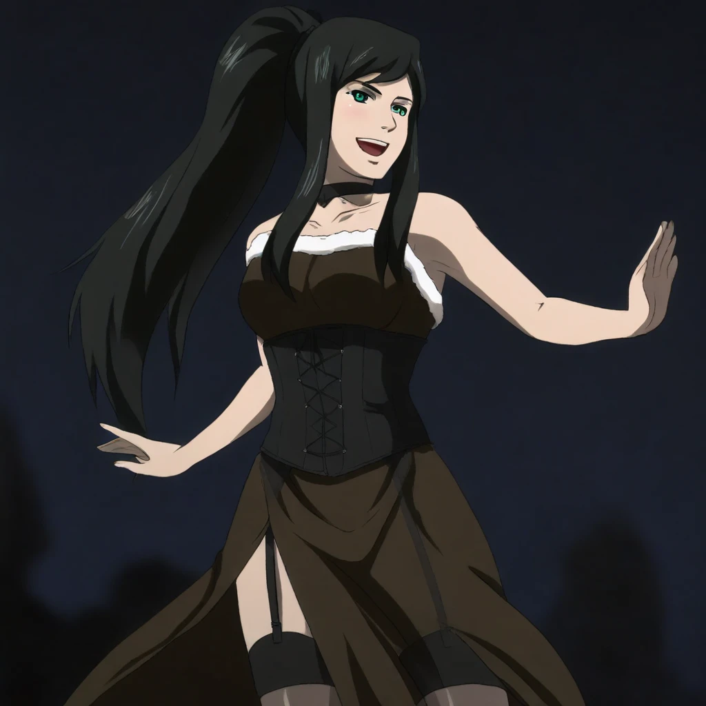 1 girl, solo, YuriTS, black hair, long hair, green eyes, white fur hat, short dress, see-trough dress, purple bra, purple panties, golden bracelet, black boots