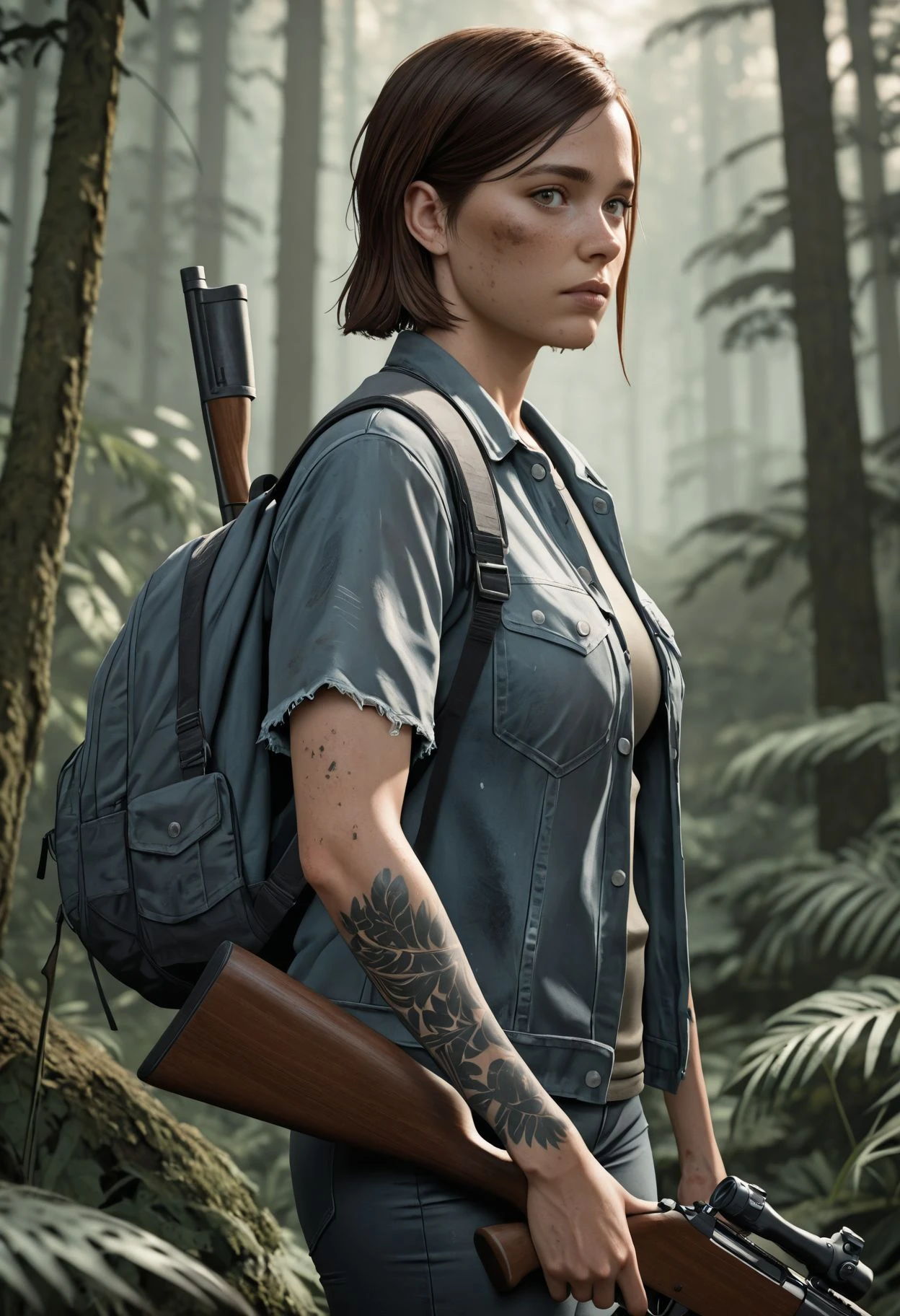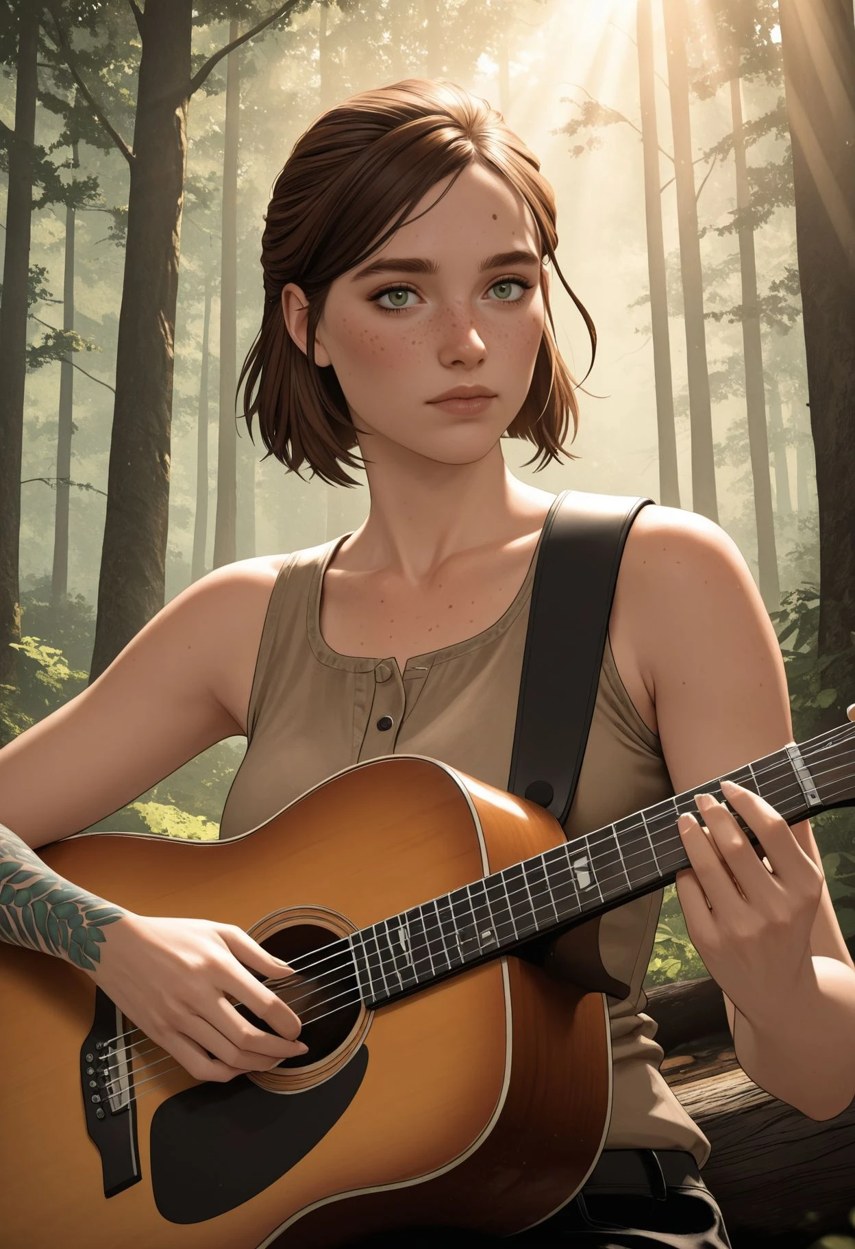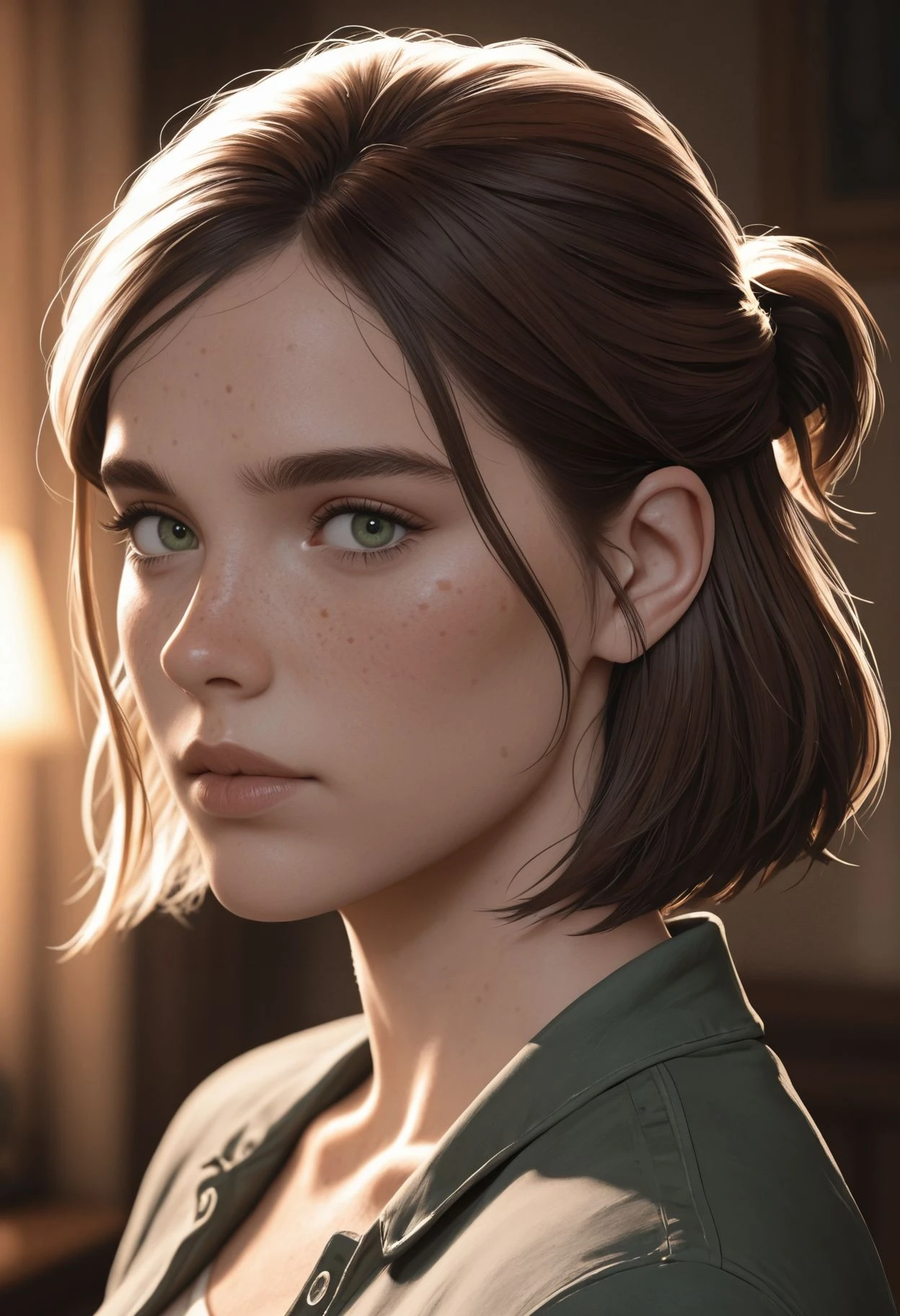 TLOU2Ellie, 1girl, freckles, brown hair, green eyes, short hair, half updo