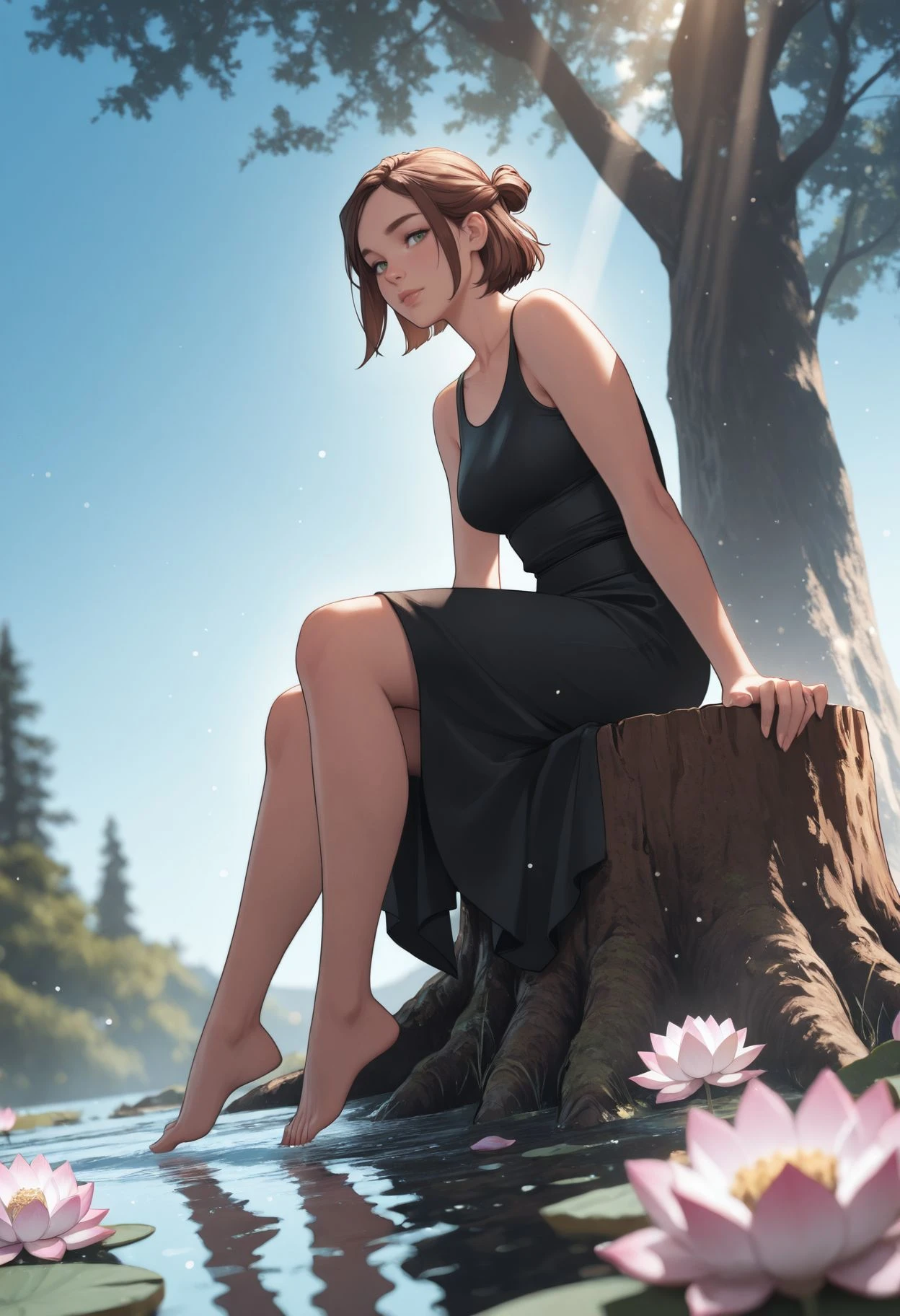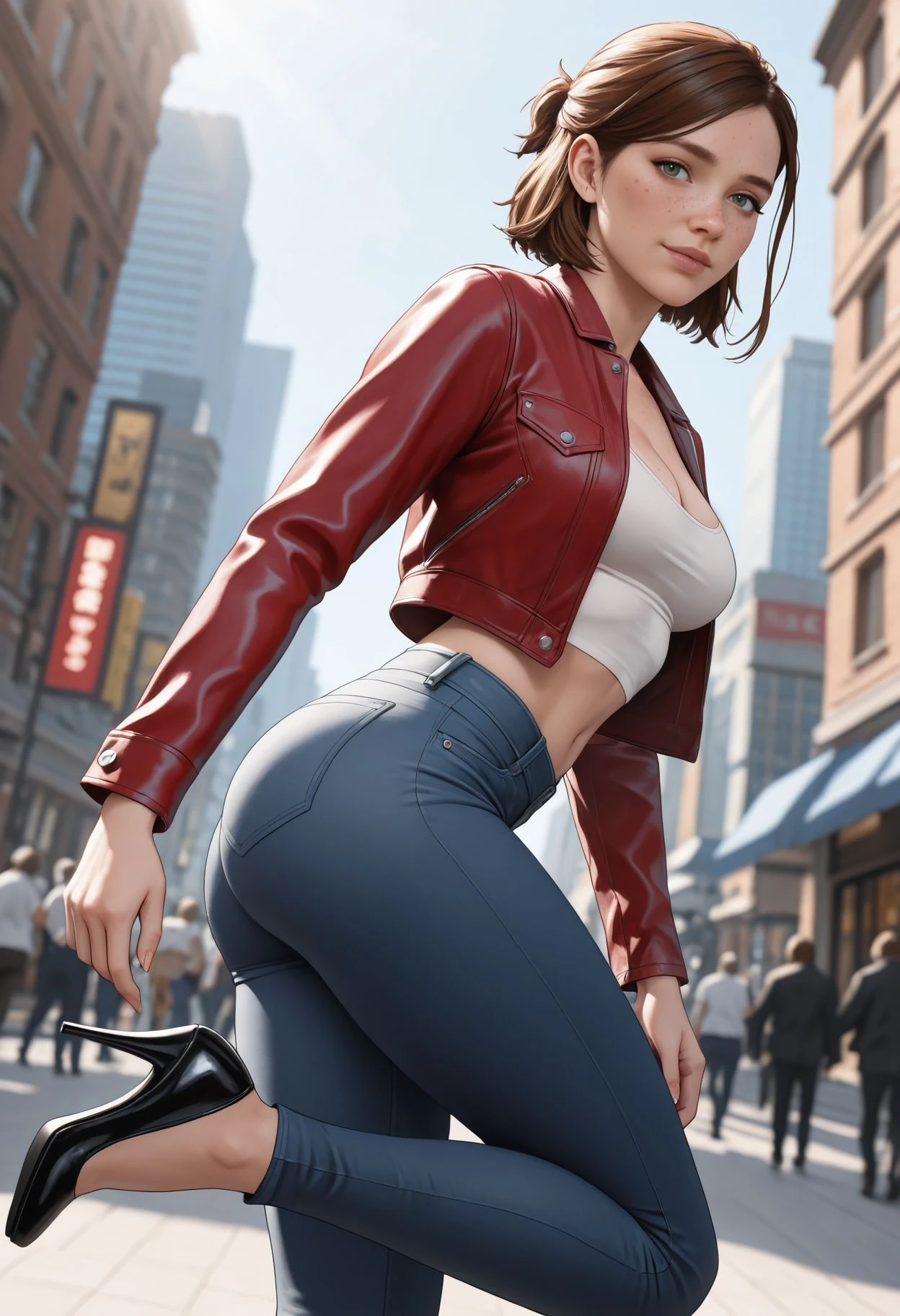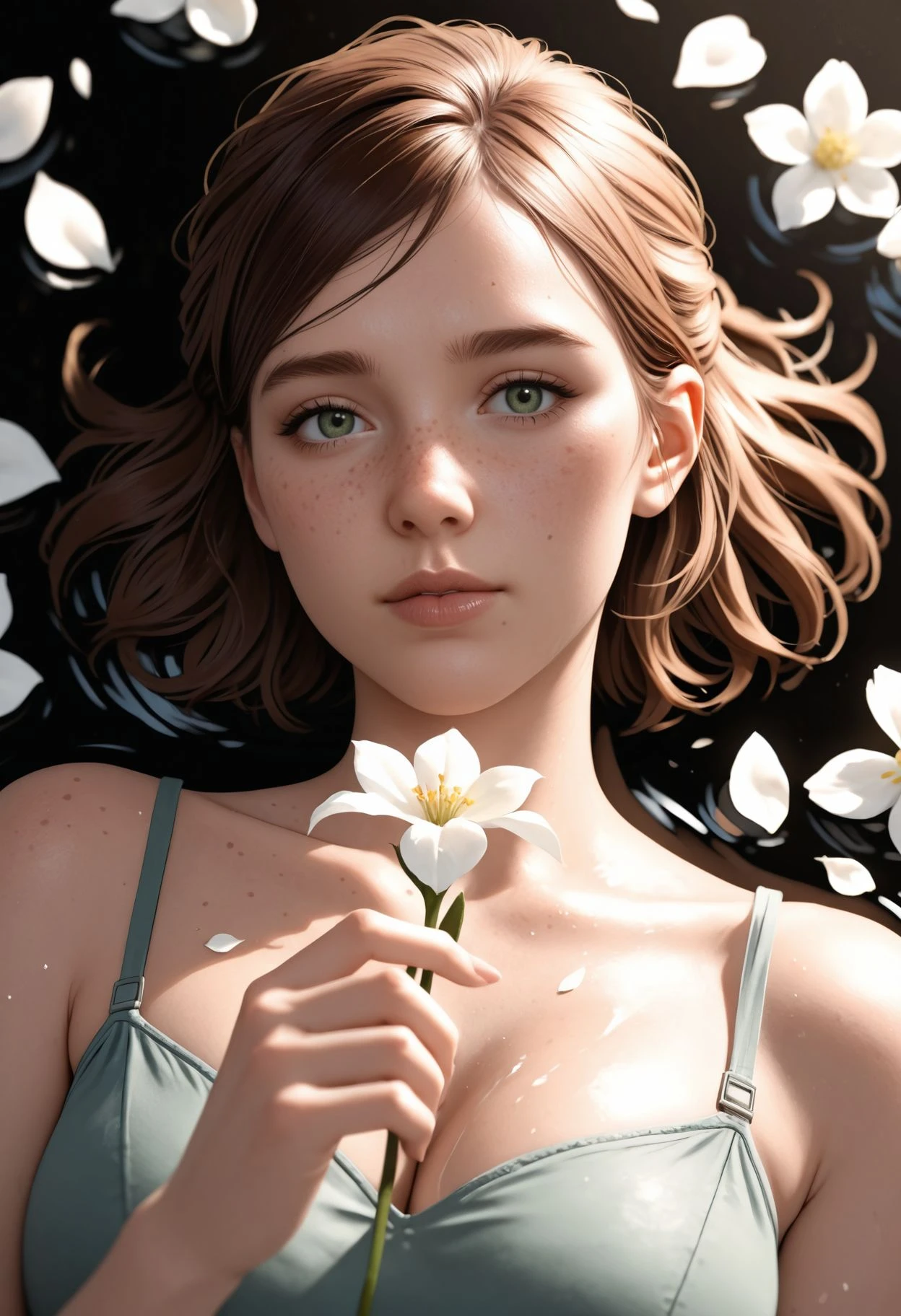 TLOU2Ellie, 1girl, freckles, brown hair, green eyes, short hair, half updo