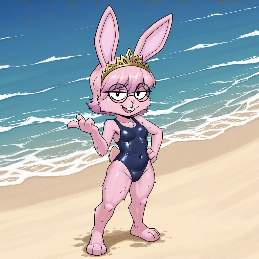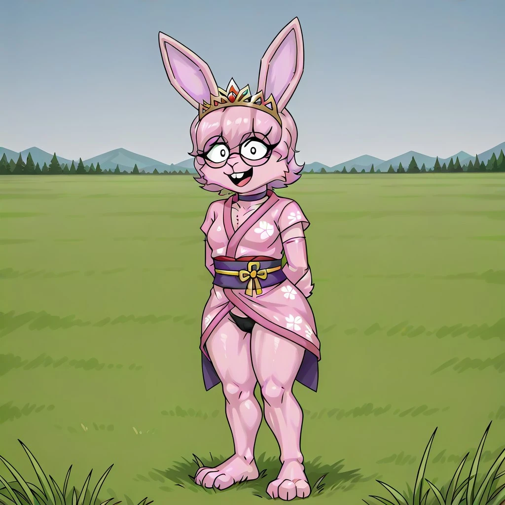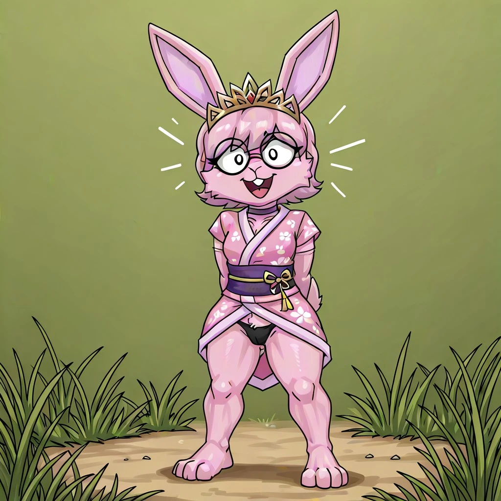 rabbit, rabbit girl, pink fur, pink hair, short hair, black eyes, bucktooth, rabbit ears, rabbit tail, shortstack, small , round glasses, gold tiara,