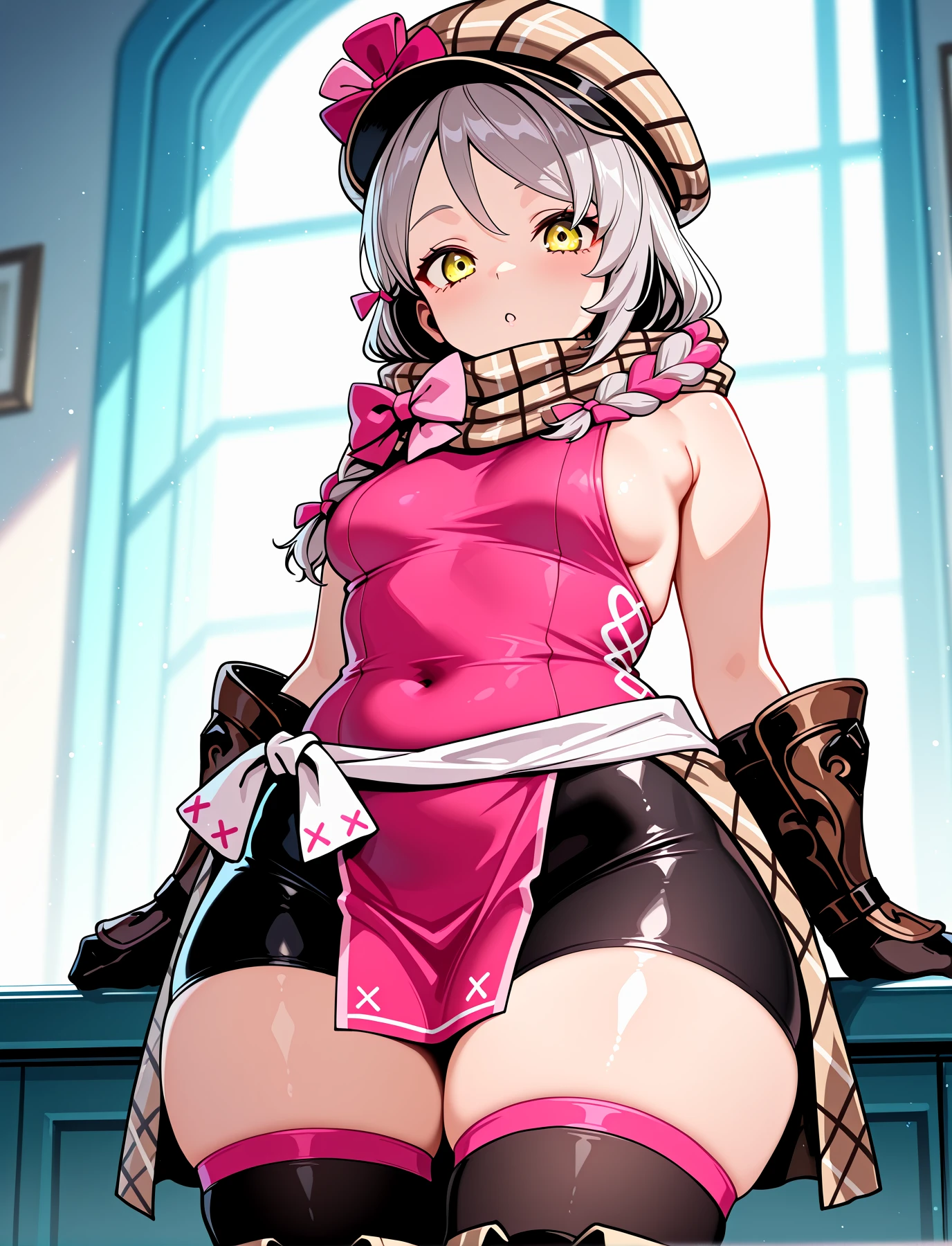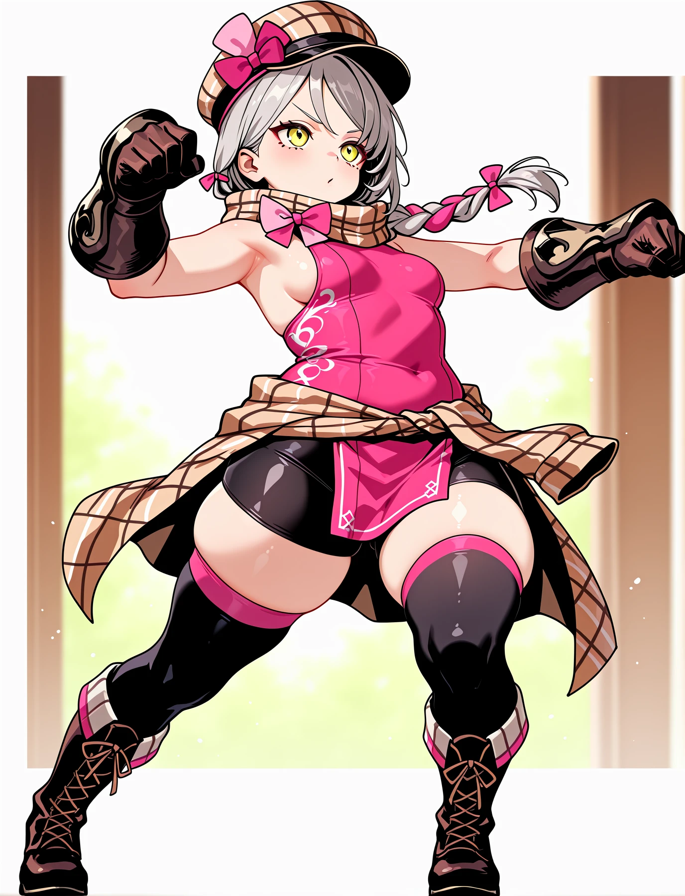 plaid scarf, hot pink sleeveless top, sideboob, bare shoulders, black gloves, brown gauntlets, pelvic curtain, plaid sweater around waist, bike shorts, pink trim, black thighhighs, brown knee boots, plaid brown hat,