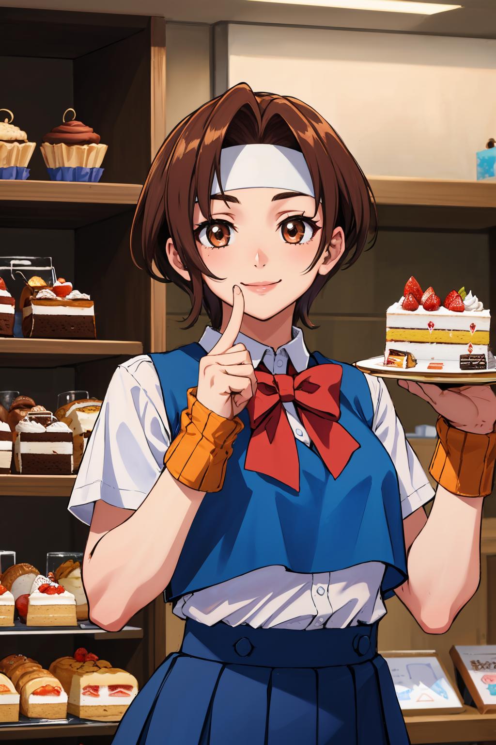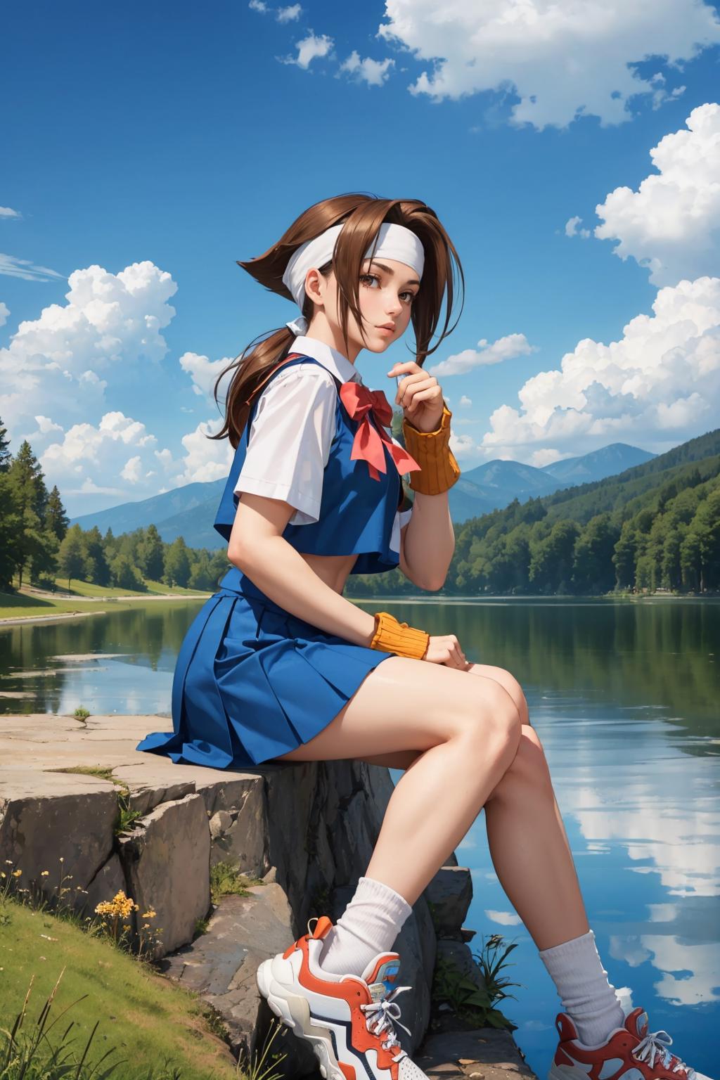 Add "headband, white shirt, bow, blue vest, pleated skirt, fingerless gloves, socks" for her typical look.