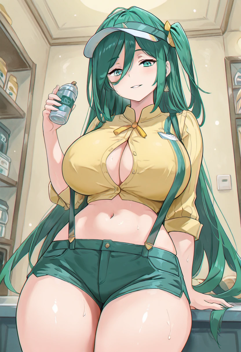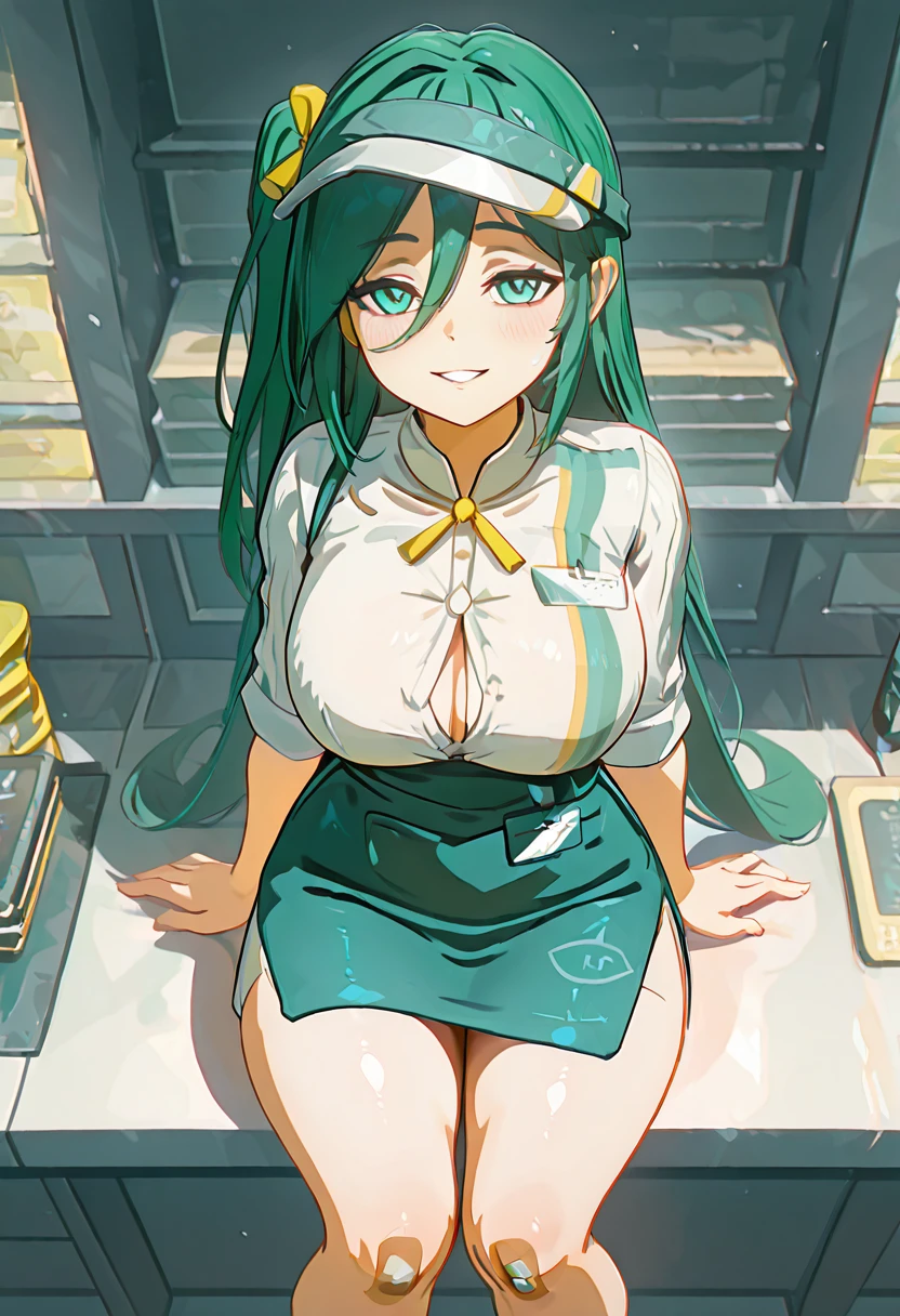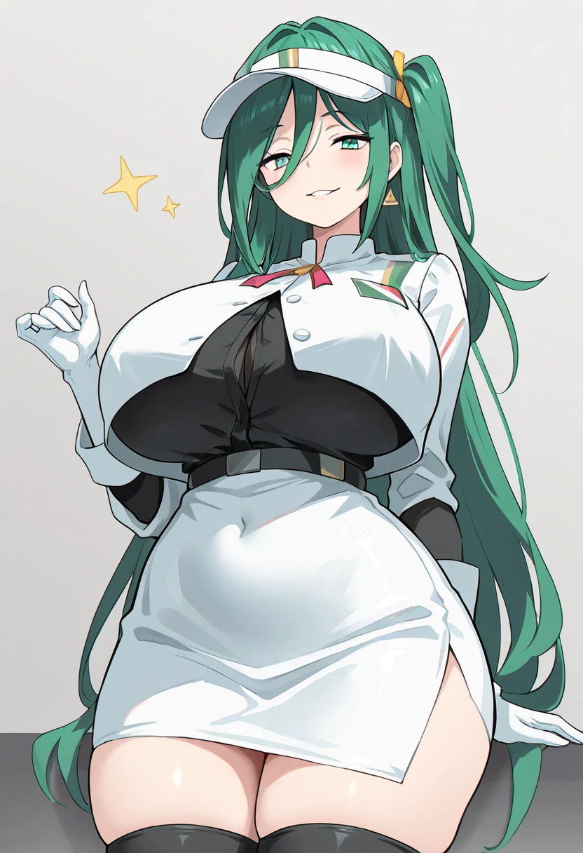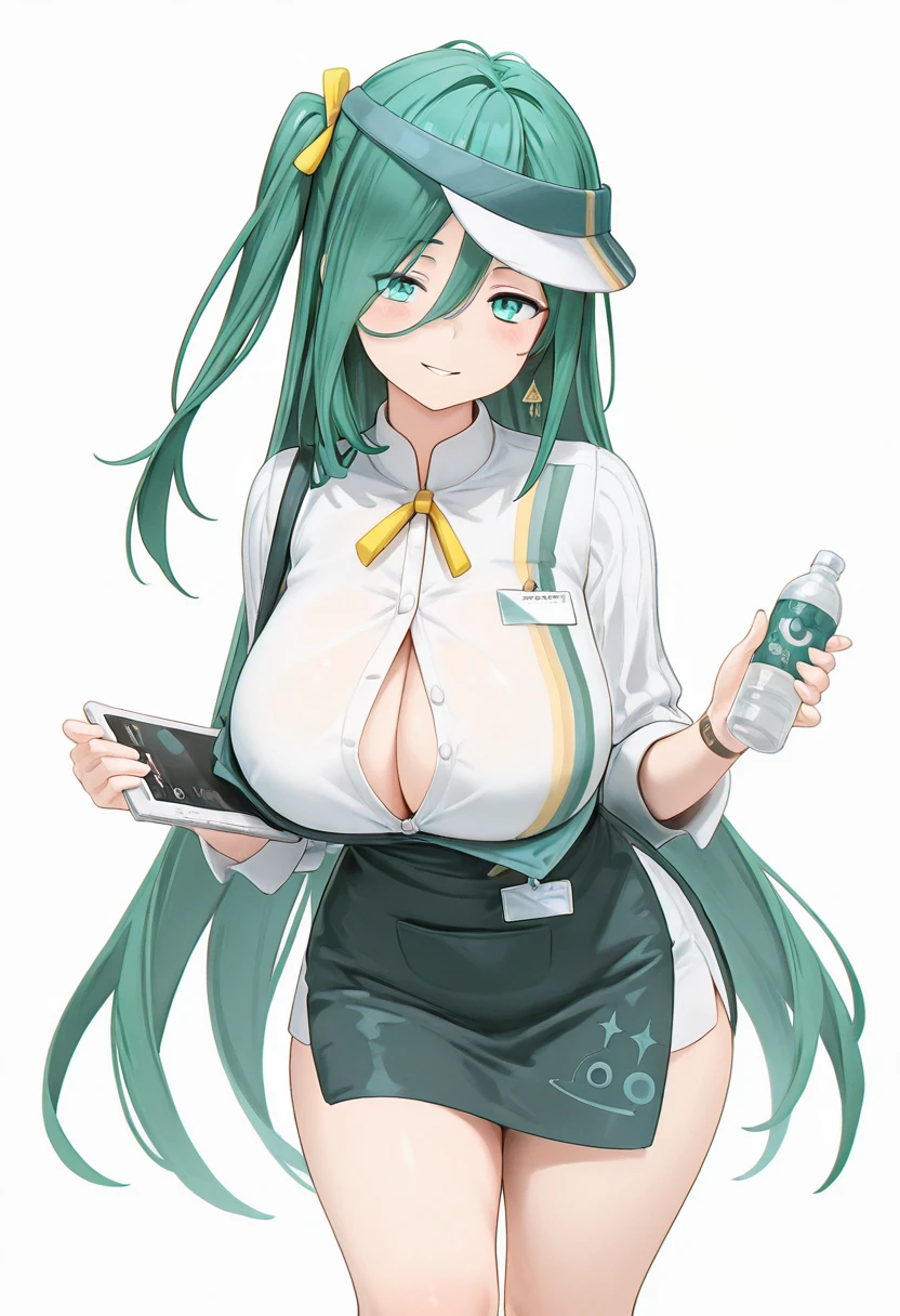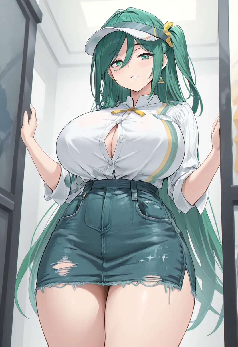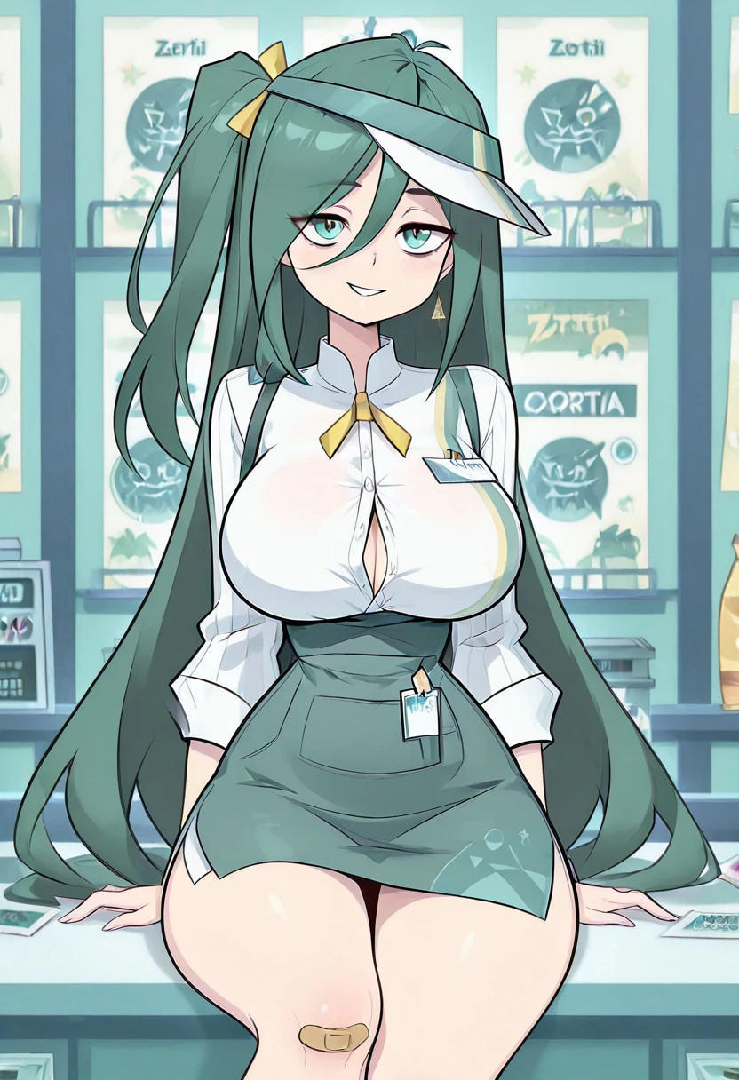 zzPortia, green eyes, hair between eyes, green hair, long hair, one side up, visor cap, skirt, white shirt, neck ribbon, lanyard, bandaid on knee,