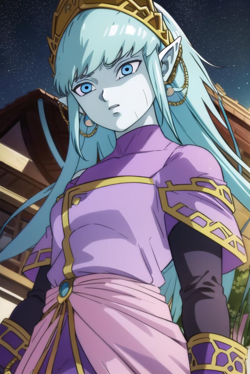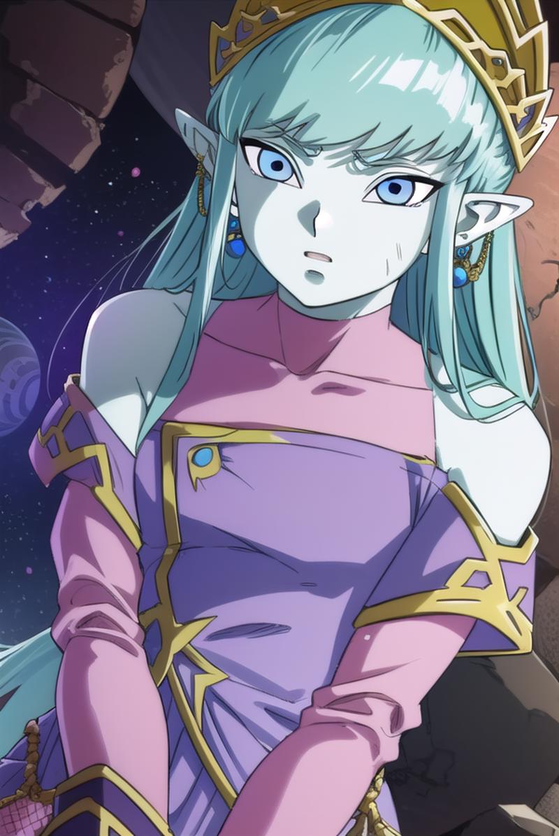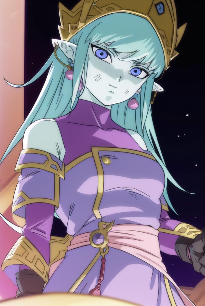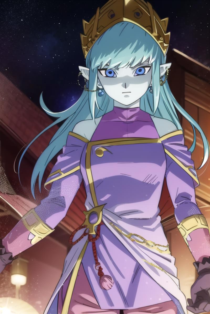 aeos formtwo, long hair, gloves, jewelry, blue hair, earrings, pointy ears, pants, aqua hair, (colored skin:1.5), baggy pants, dress, (purple dress:1.5), leotard, (pink leotard:1.5),