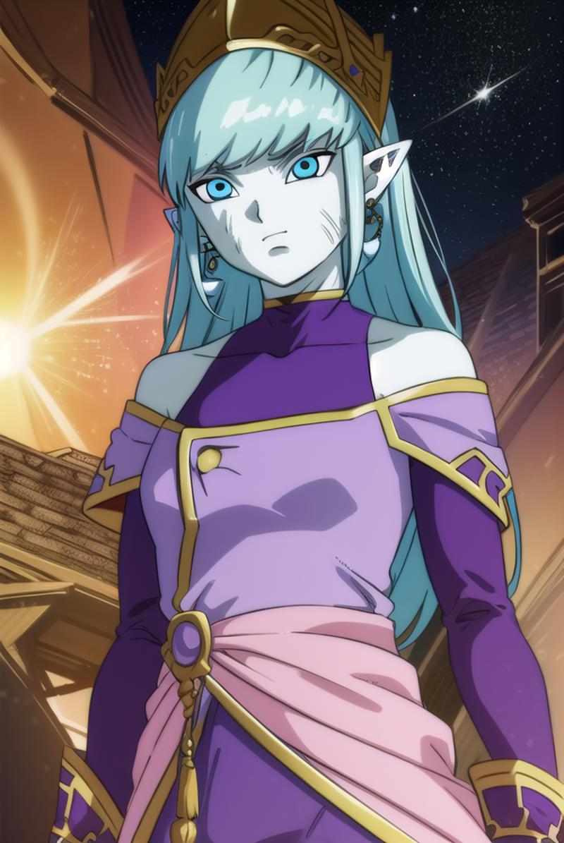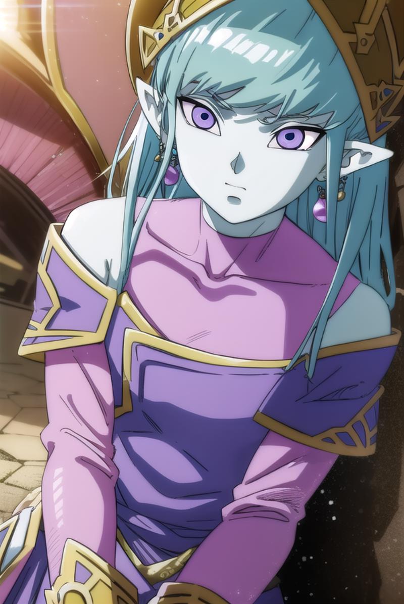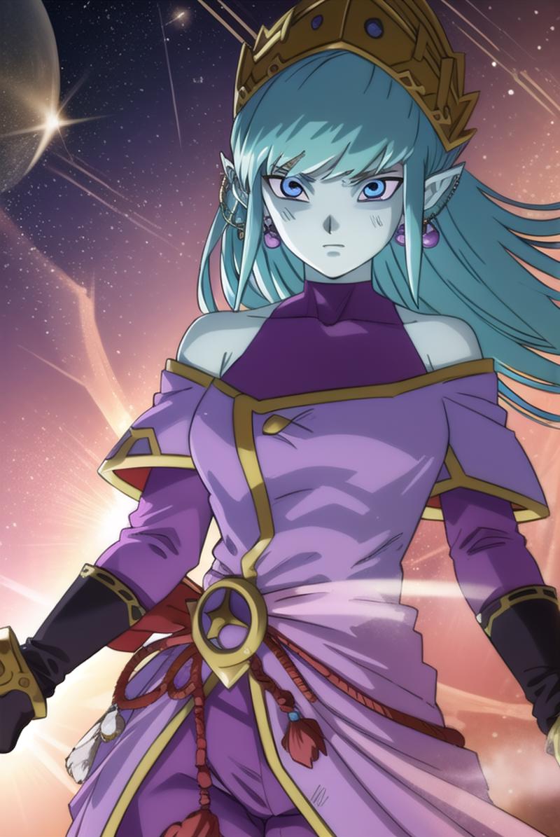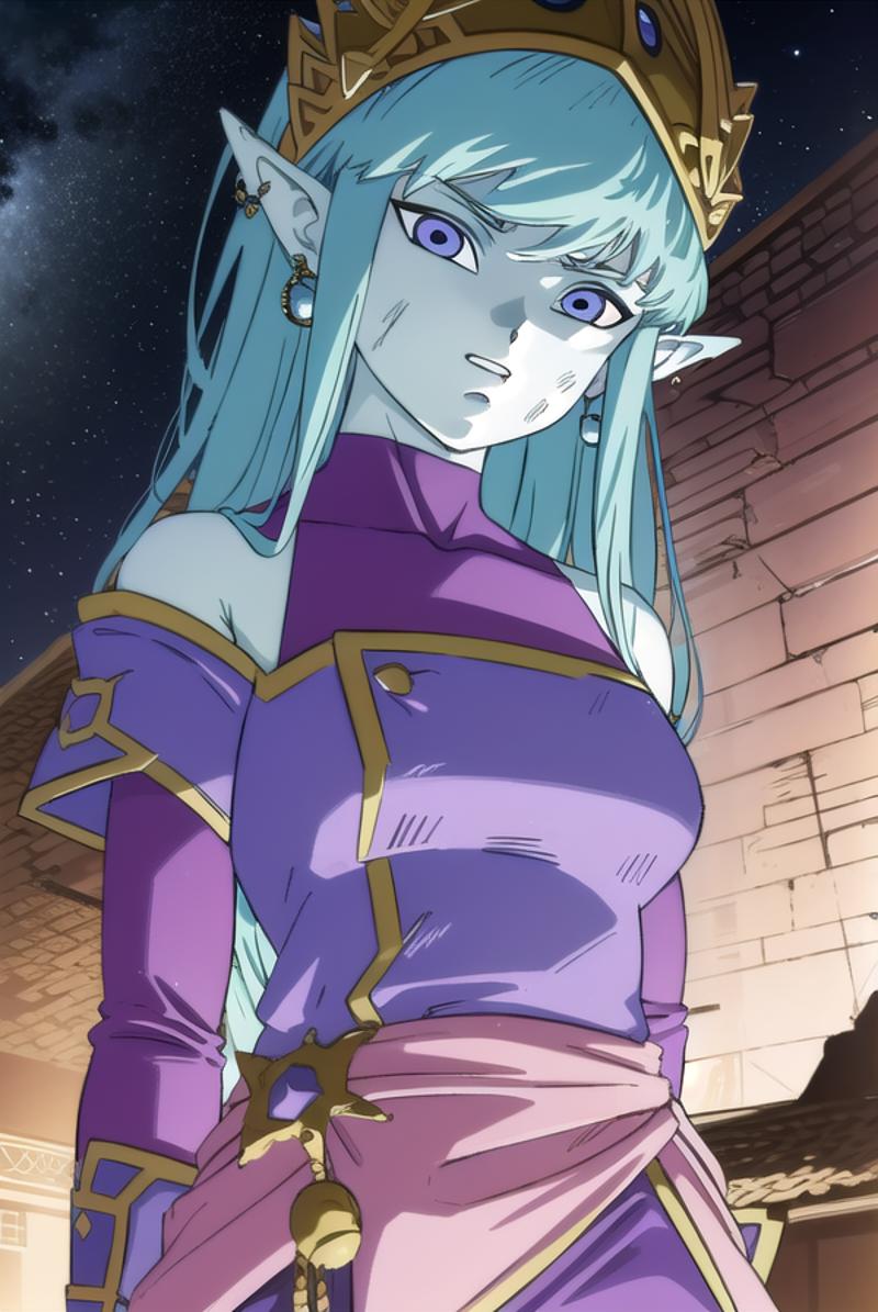 aeos formtwo, long hair, gloves, jewelry, blue hair, earrings, pointy ears, pants, aqua hair, (colored skin:1.5), baggy pants, dress, (purple dress:1.5), leotard, (pink leotard:1.5),