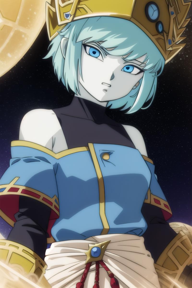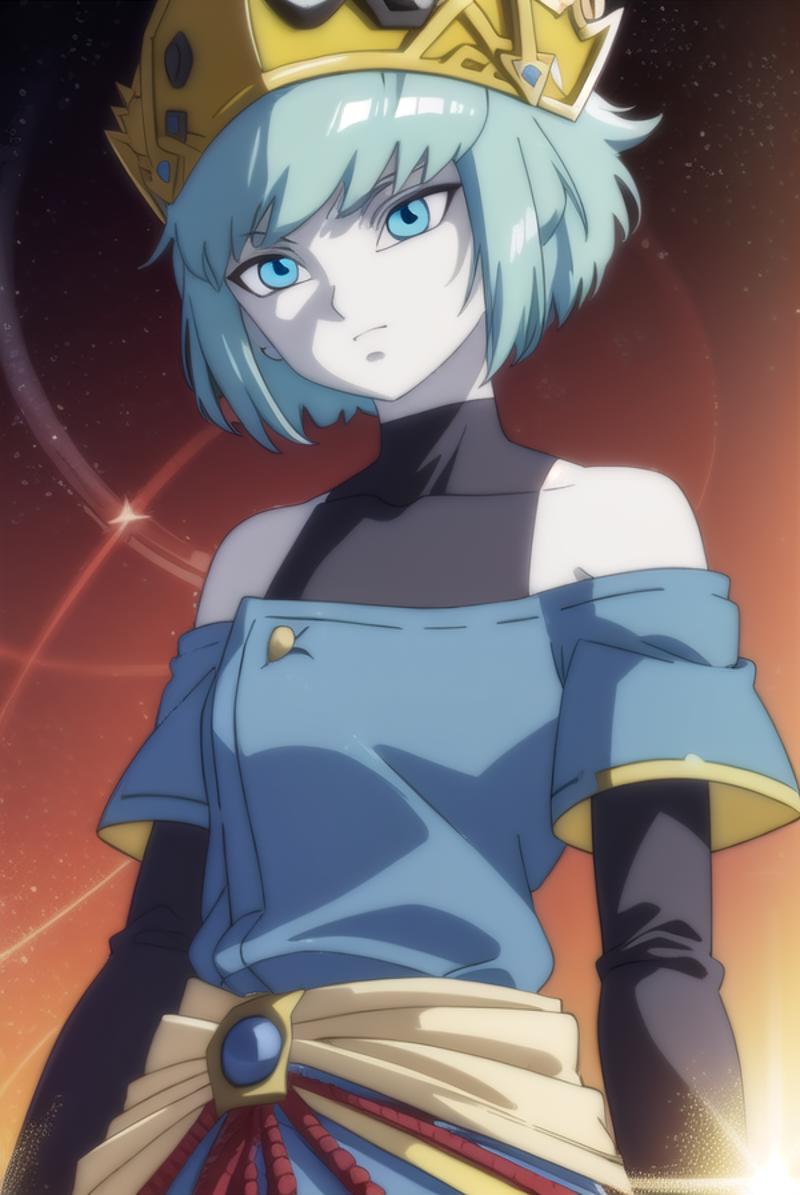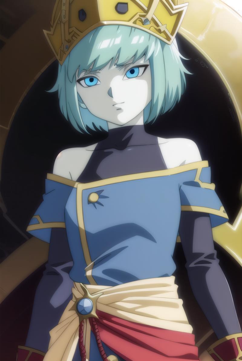 aeos formone, short hair, gloves, long sleeves, hat, bare shoulders, blue hair, pants, white gloves, off shoulder, colored skin, turtleneck, crown, covered collarbone,