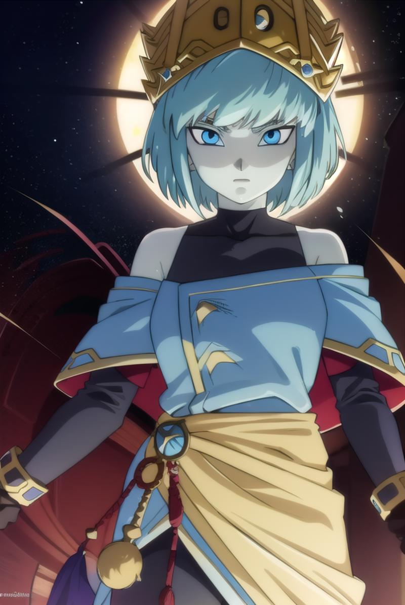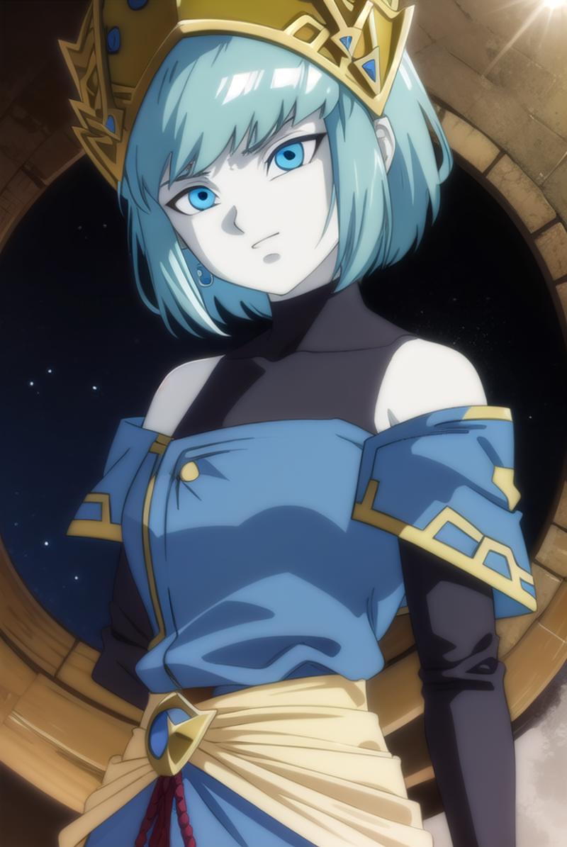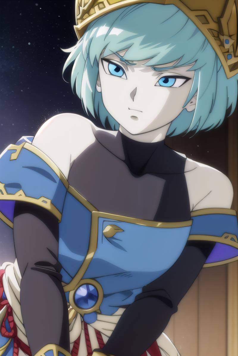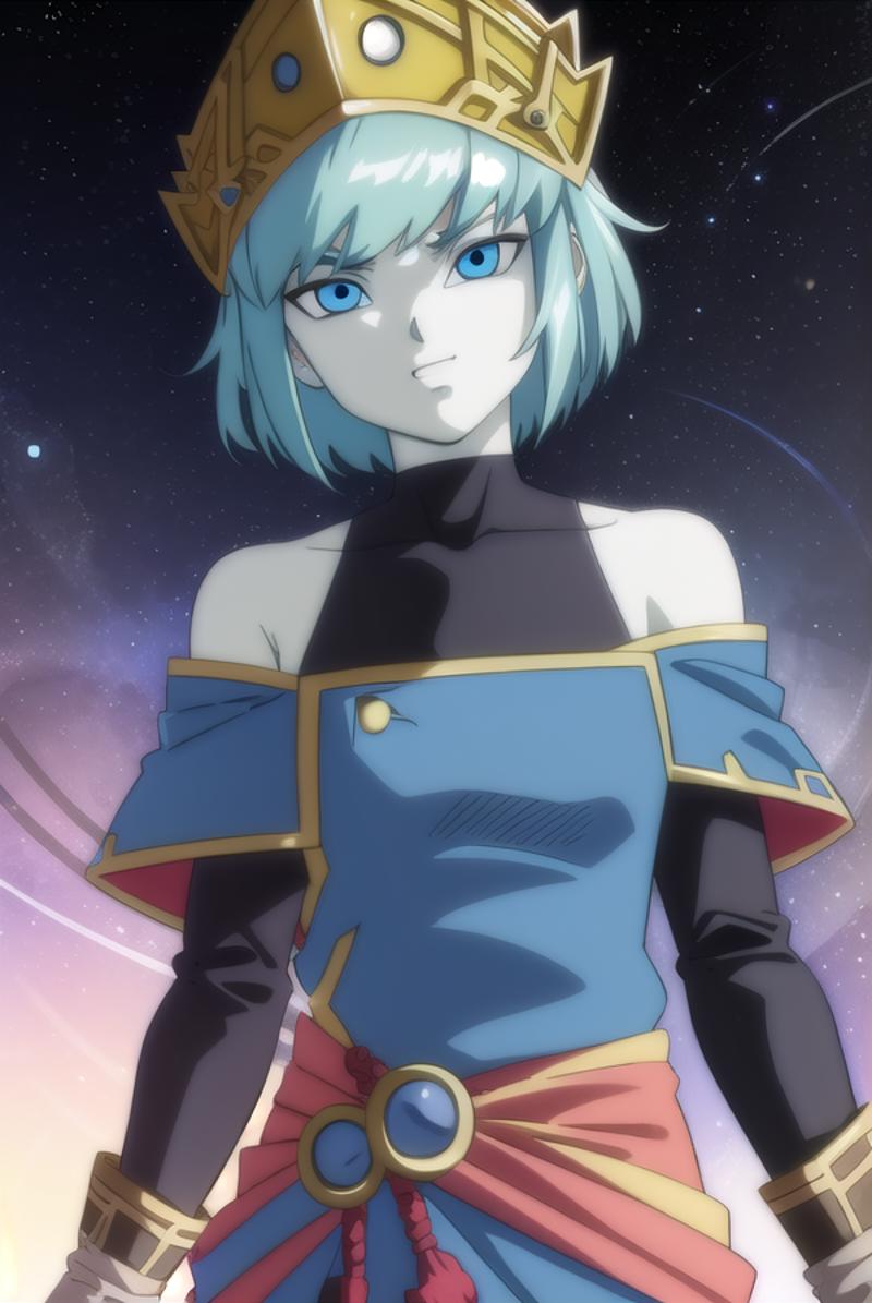 aeos formone, short hair, gloves, long sleeves, hat, bare shoulders, blue hair, pants, white gloves, off shoulder, colored skin, turtleneck, crown, covered collarbone,