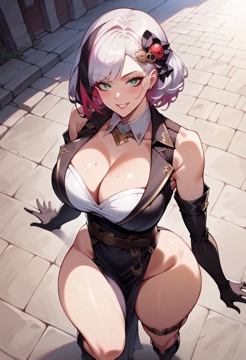 Promts: TopazNk, white hair, multicolored hair, green eyes, clothing cutout, short hair, hair ornament, black jacket, white collared shirt, cleavage, detached sleeves, black elbow gloves, belt, black knee boots, tattoos,wide hips,