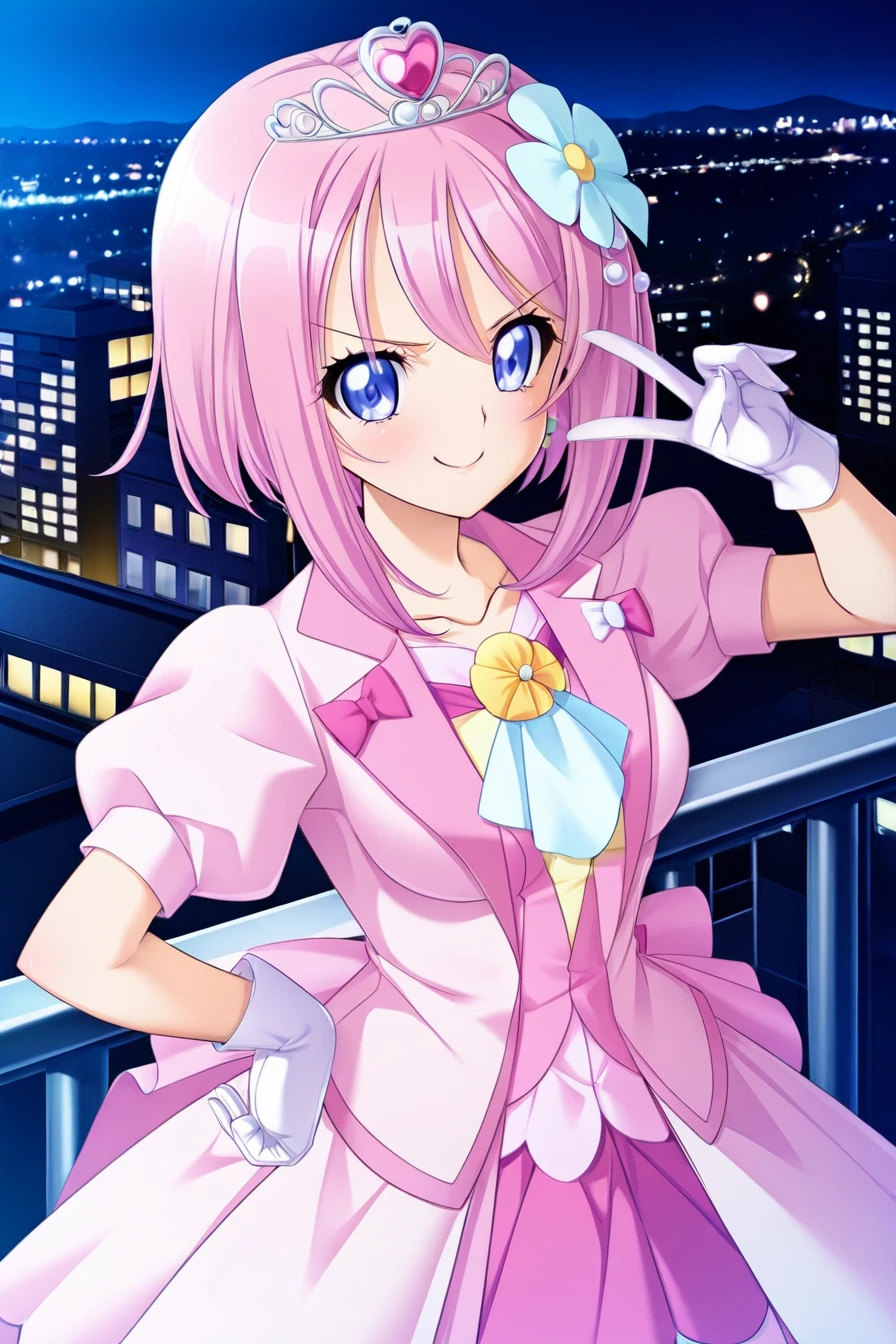 Appearence : pink hair,bangs,short hair,multiple hair bows,blue eyes,medium breasts