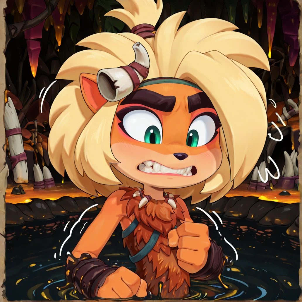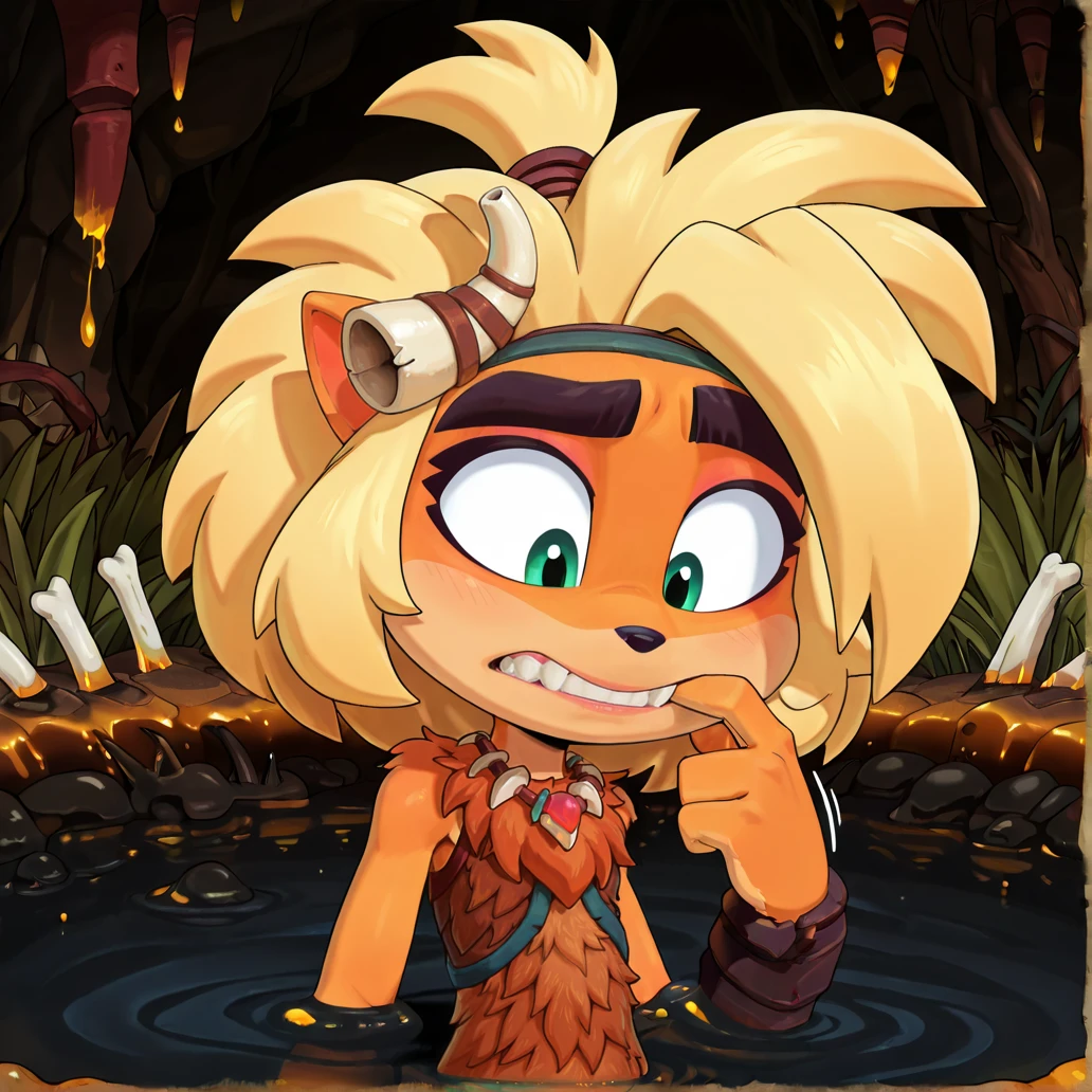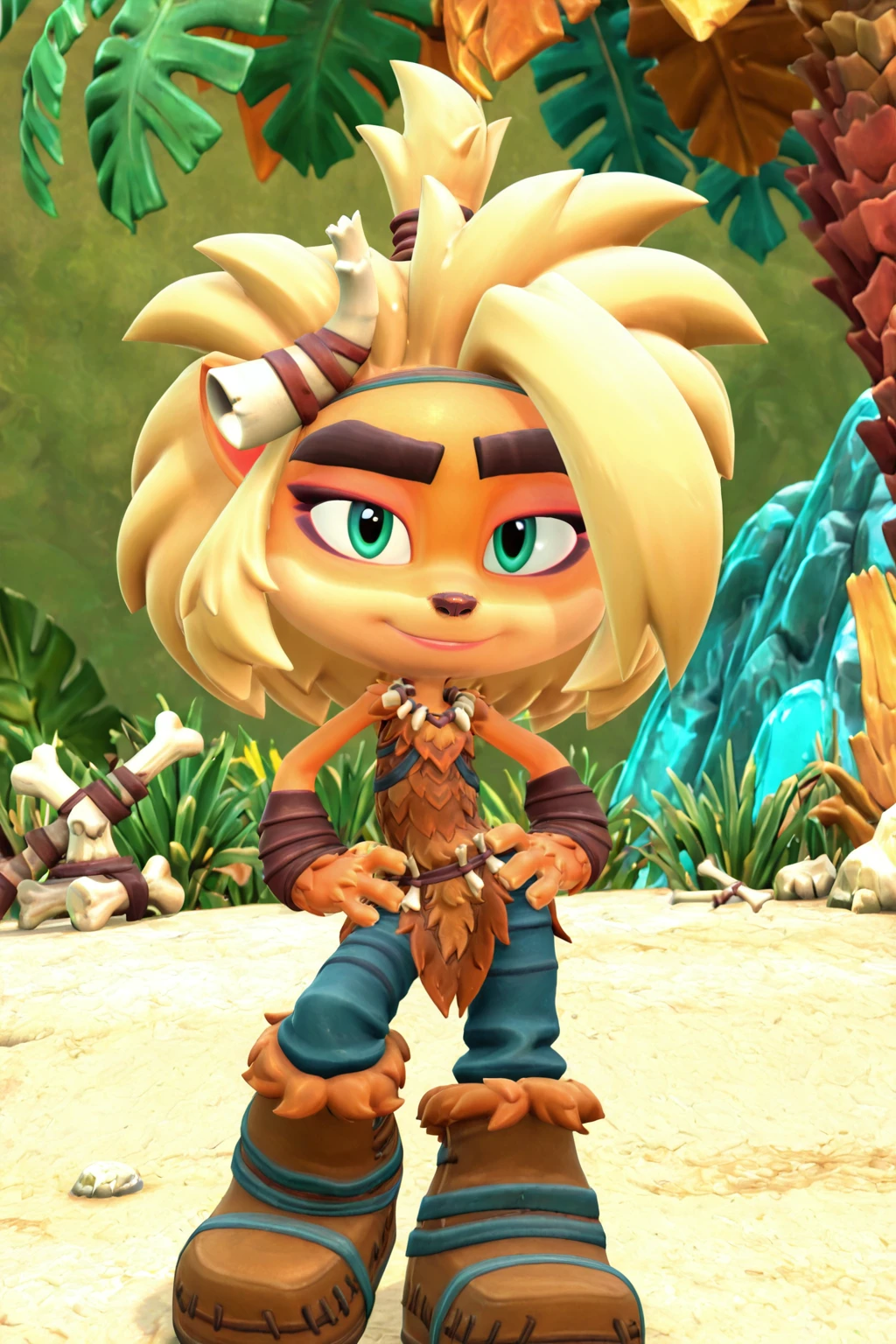 Coco Bandicoot, cavewomen, green eyes, thick eyebrows, bone horn hair ornament, topknot, headband, wild blonde hair, tooth necklace, sleeveless fur top, bone belt, blue pants, fur lining brown boot, wristbands