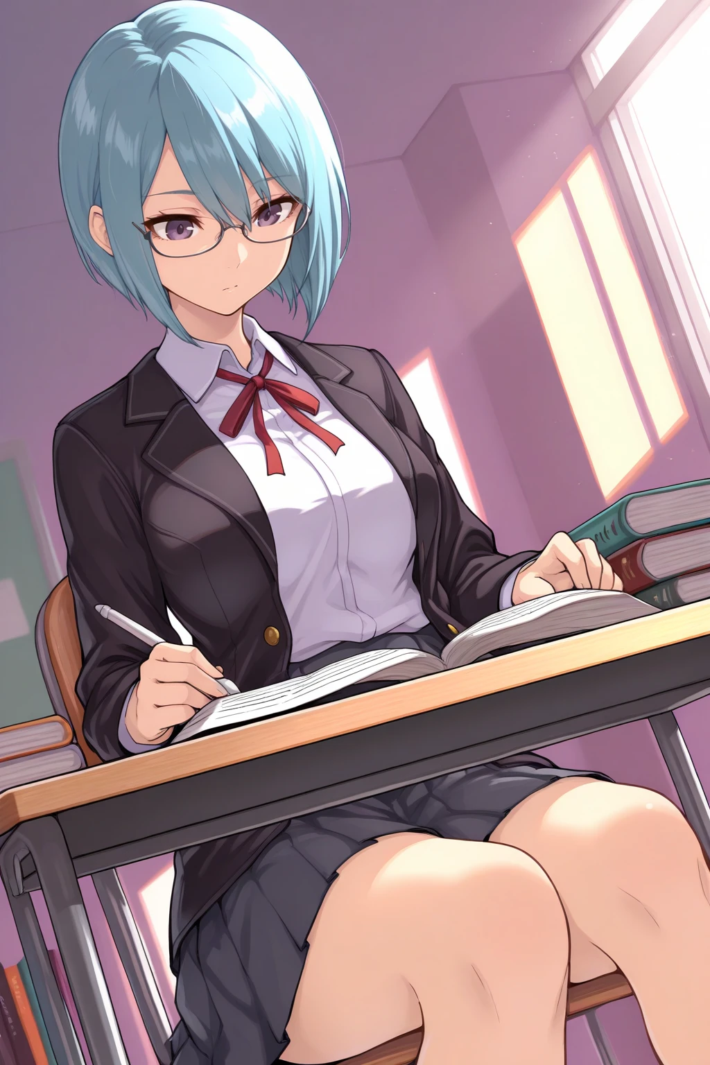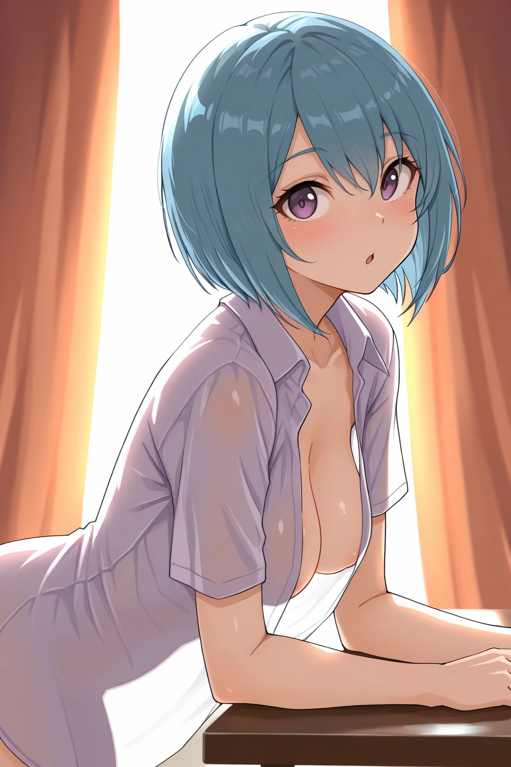 Appearance : b3ruk4, medium breasts, purple eyes, blue hair, hair between eyes, short hair