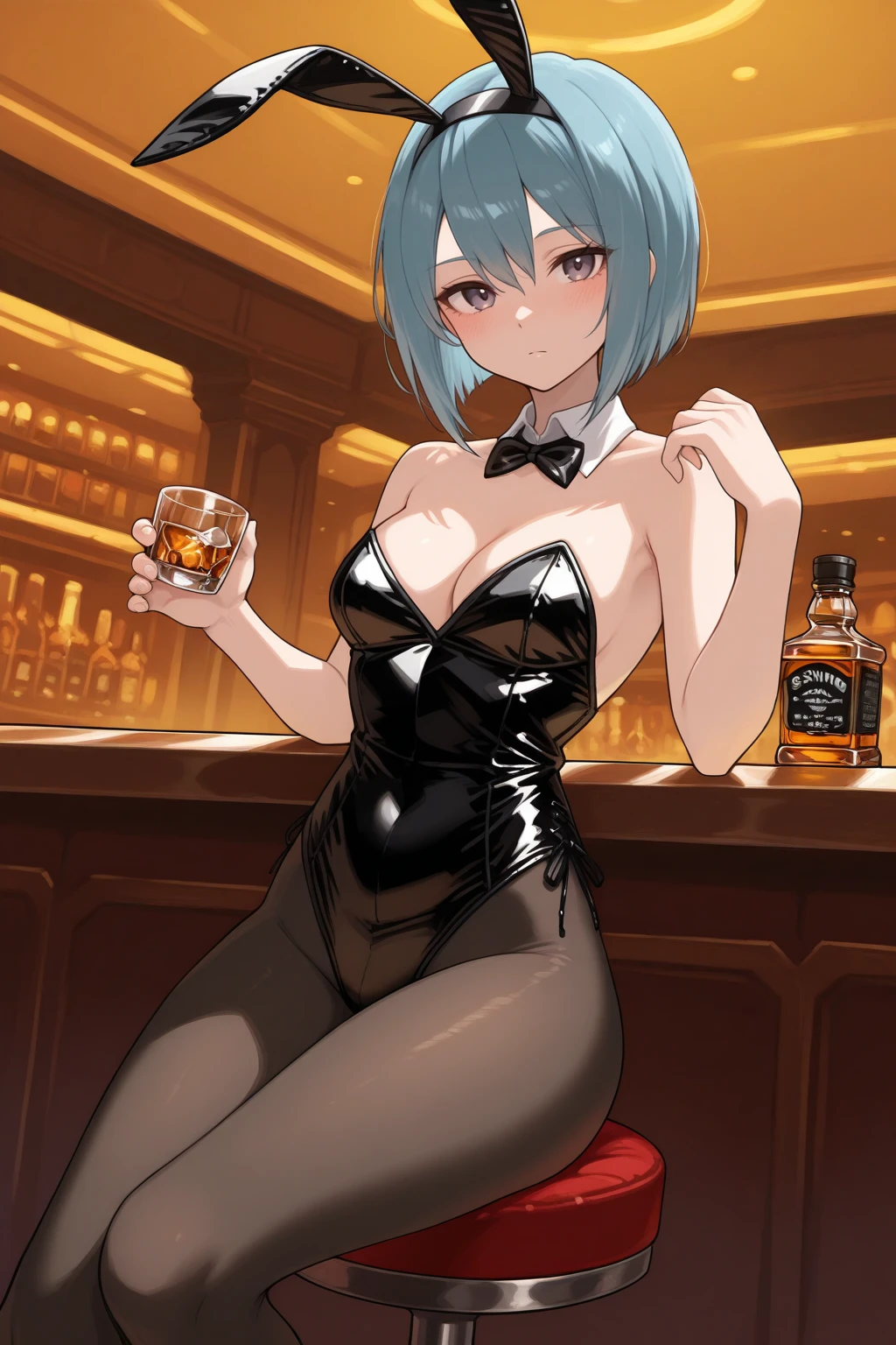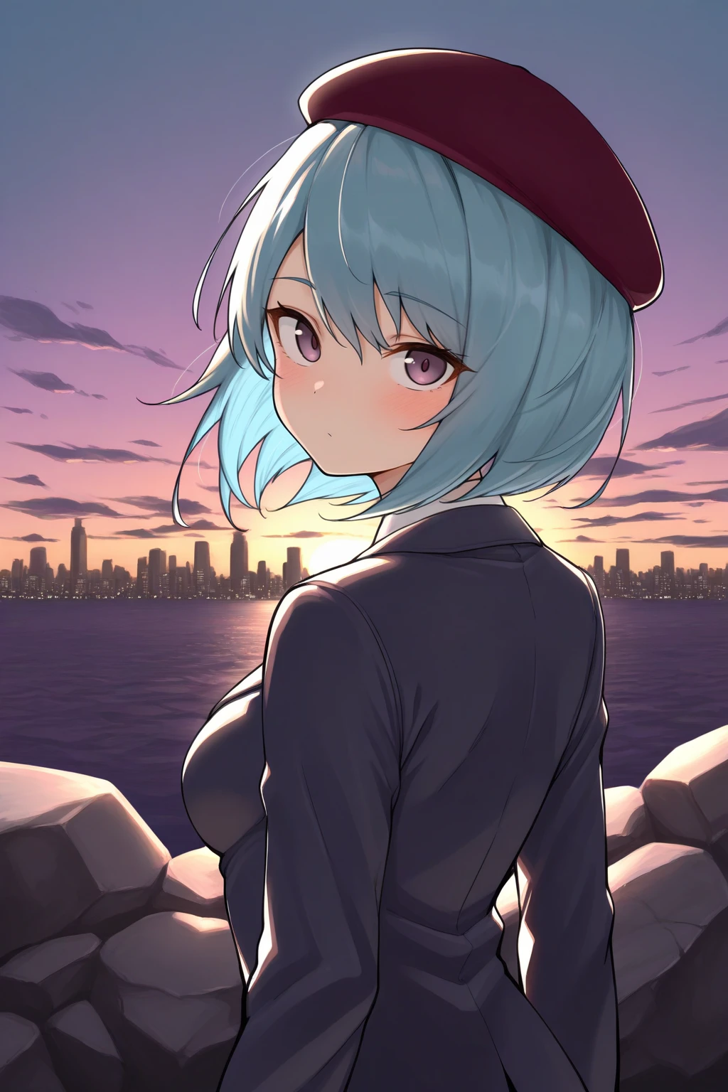 b3ruk4, medium breasts, purple eyes, blue hair, hair between eyes, short hair
