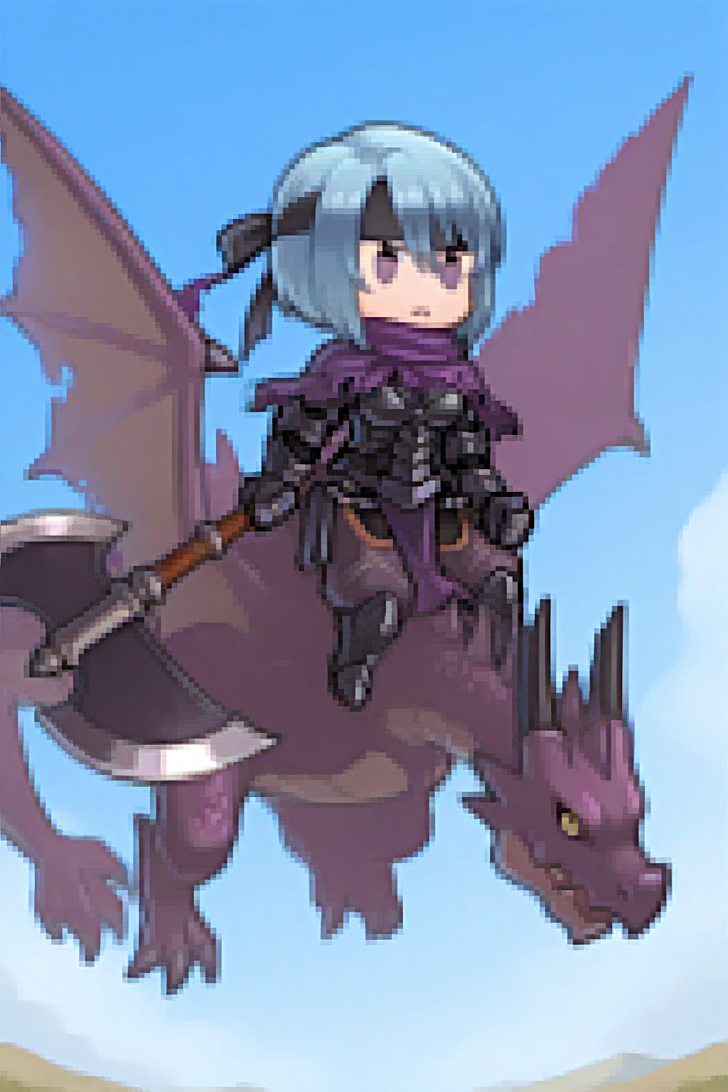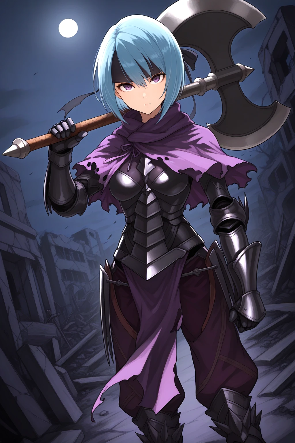 Outfit : black headband, purple capelet, torn capelet, black cuirass, black gauntlets, pelvic curtain, purple pants, puffy pants, knee boots, armored boots, black boots