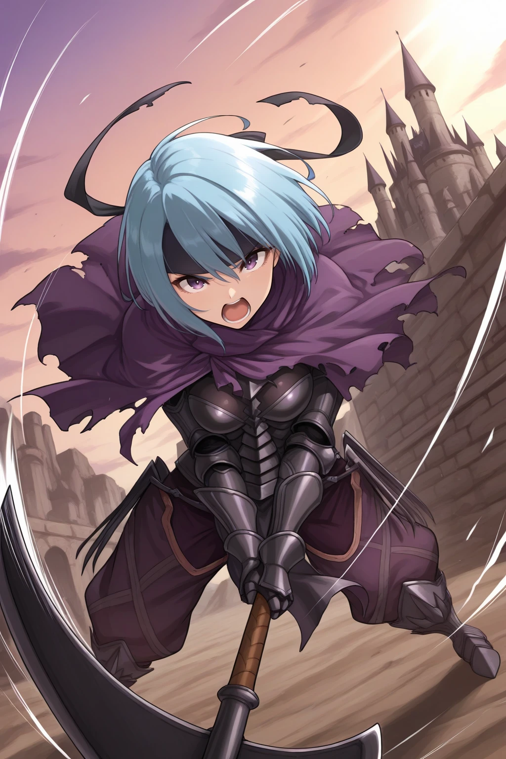 black headband, purple capelet, torn capelet, black cuirass, black gauntlets, pelvic curtain, purple pants, puffy pants, knee boots, armored boots, black boots