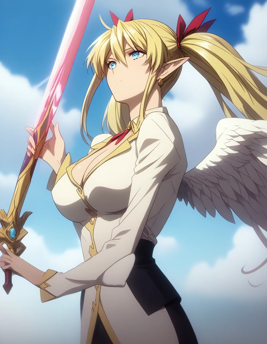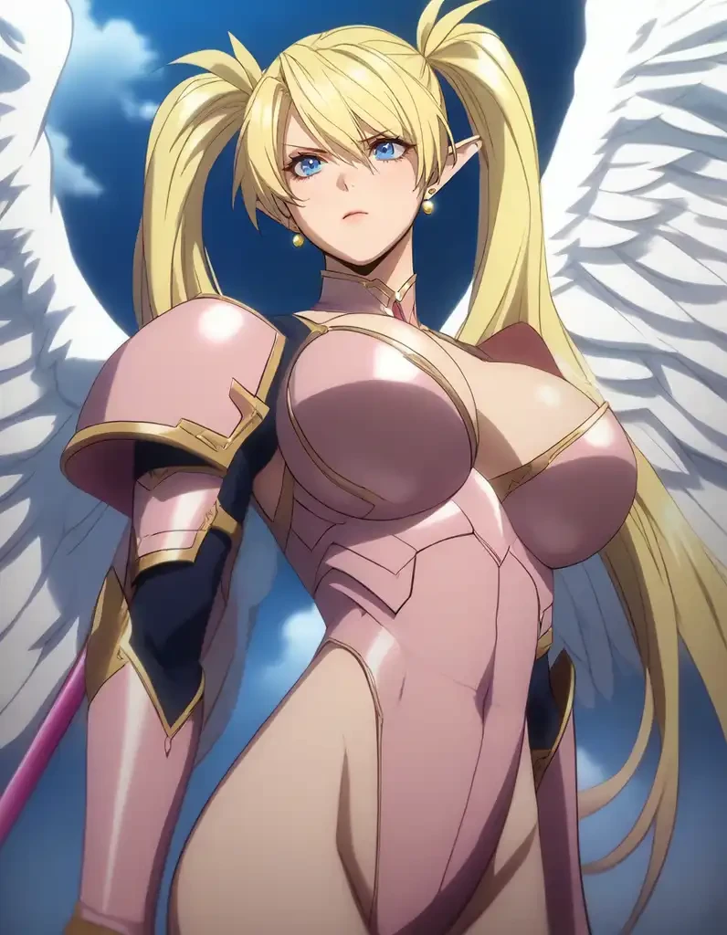 Seraphia Stellanova, blue eyes, sharp eyes, blonde hair, twin tails, long hair, massive breasts, slim, thin, slender, elf ears, thighs/hips shown, faintly shown abs, detailed face, naked, pink nipples showing, collarbone showing, toned body,