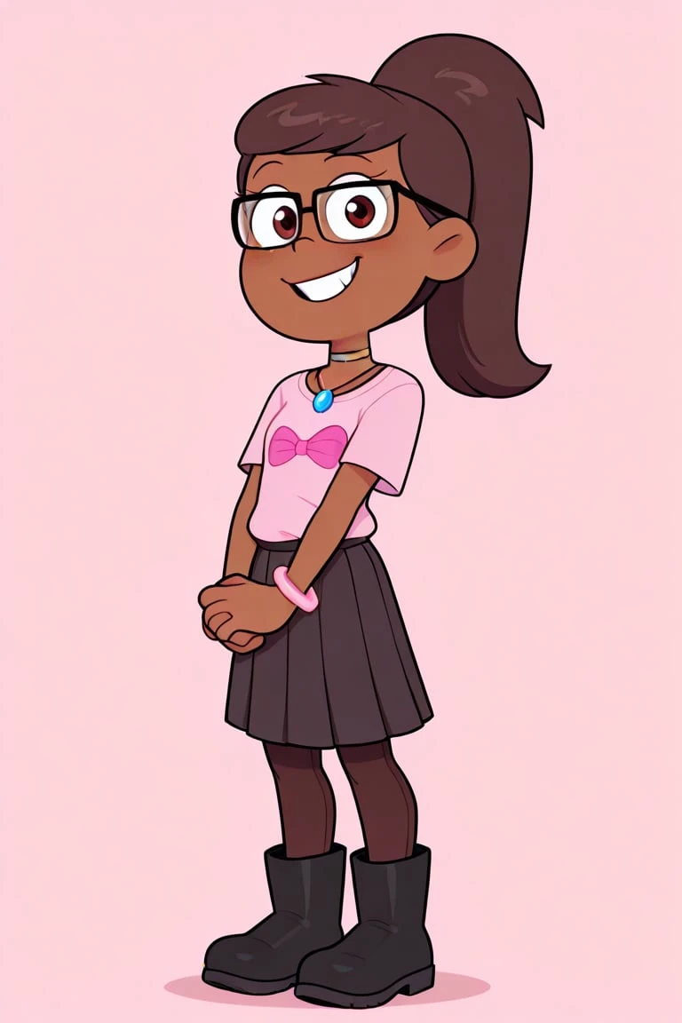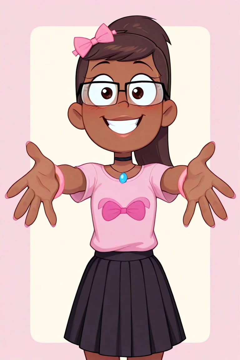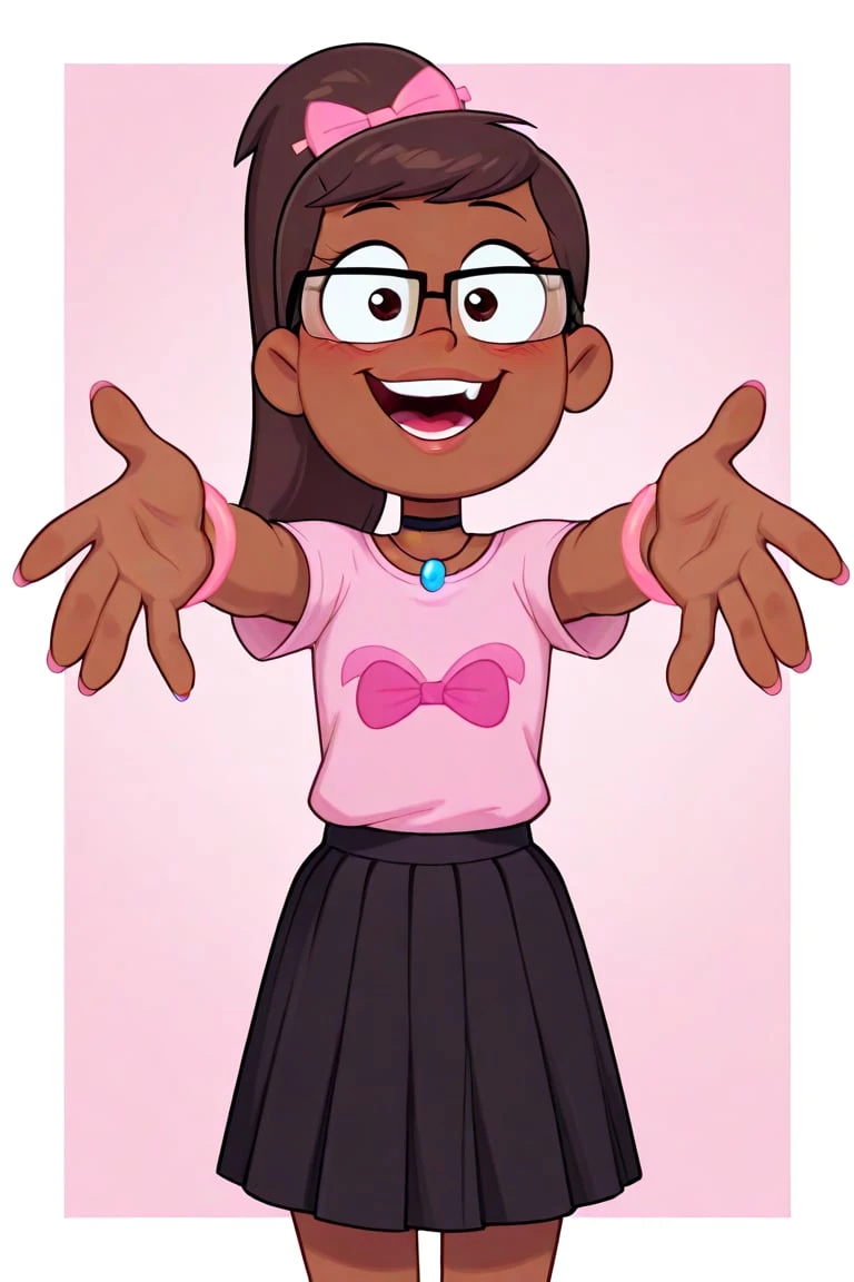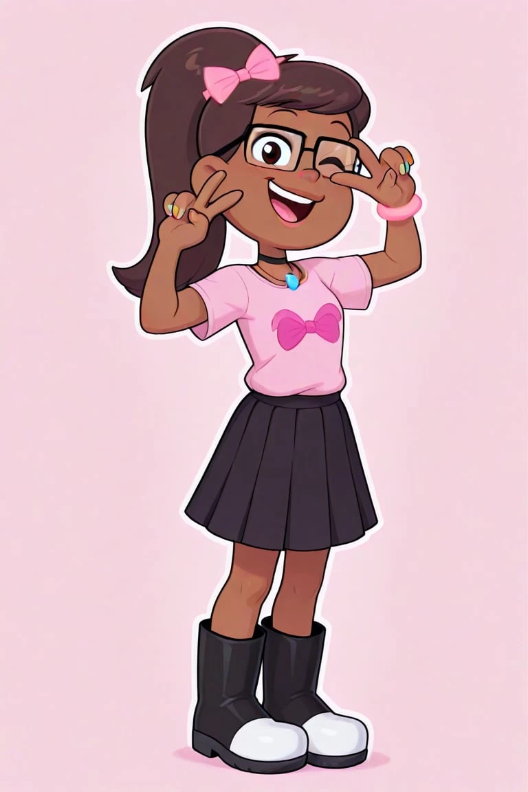 Teenage girl, african-american, brown skin, full lips, dark brown hair, swept bangs, long ponytail, large pink bow on top of head, brown eyes, rectangular glasses, light pink t-shirt with prominent pink bow design, pink bracelet on her wrist, black skirt, black choker with blue pendant necklace, chunky black boots