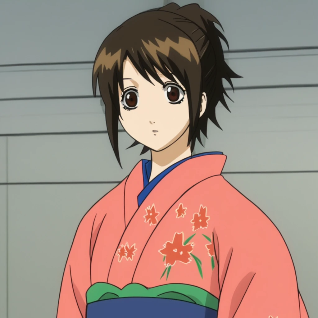 Promt: pink kimono, brown eyes, sash, japanese clothes, brown hair, short ponytail