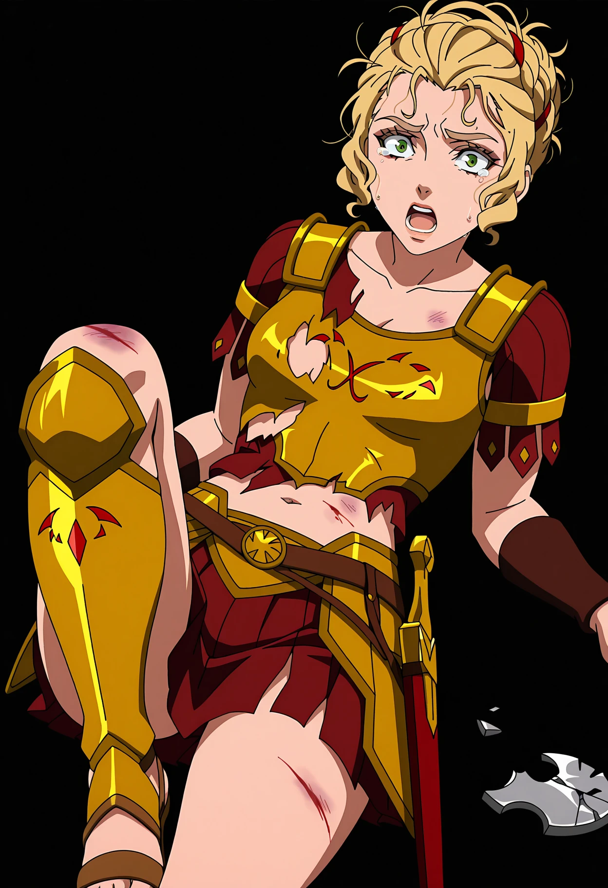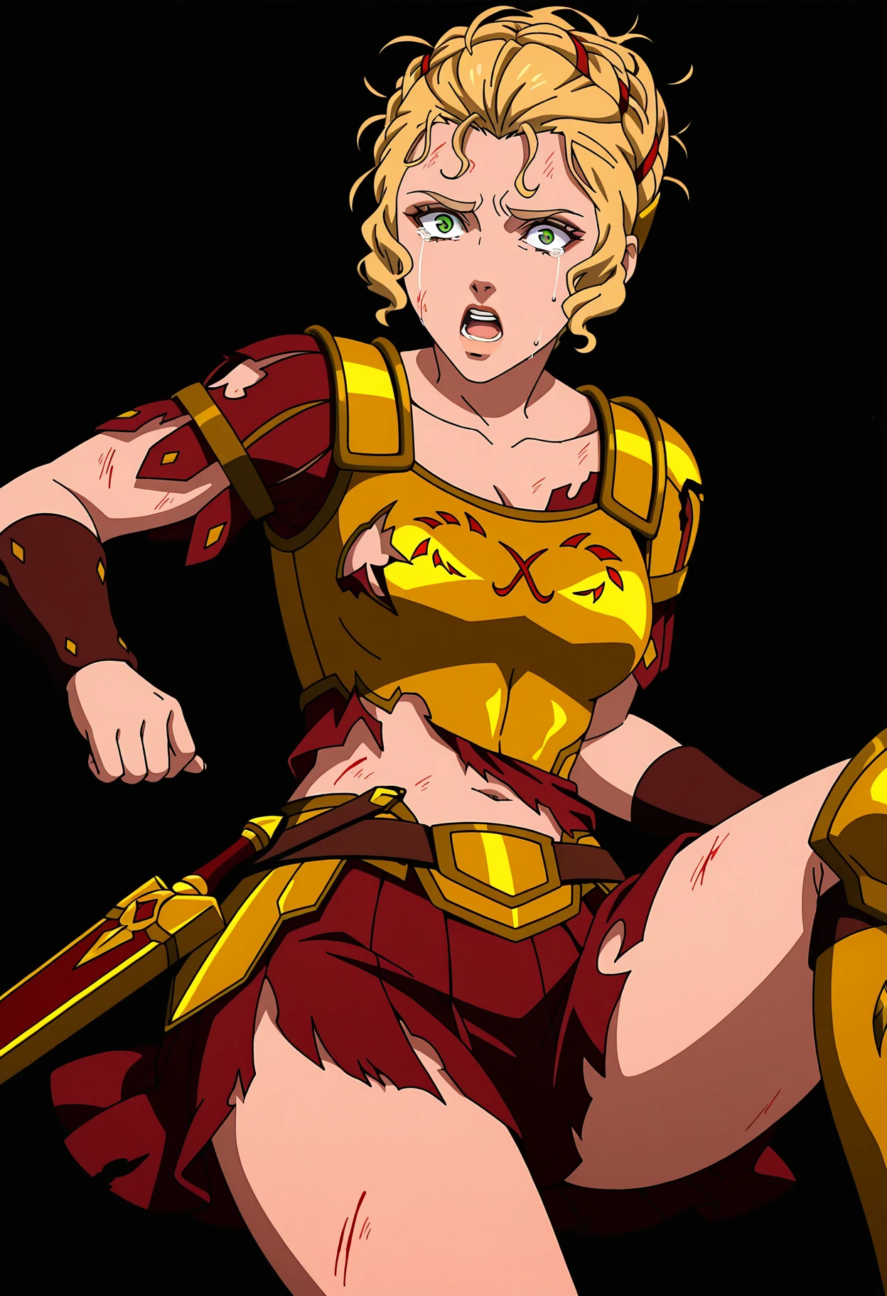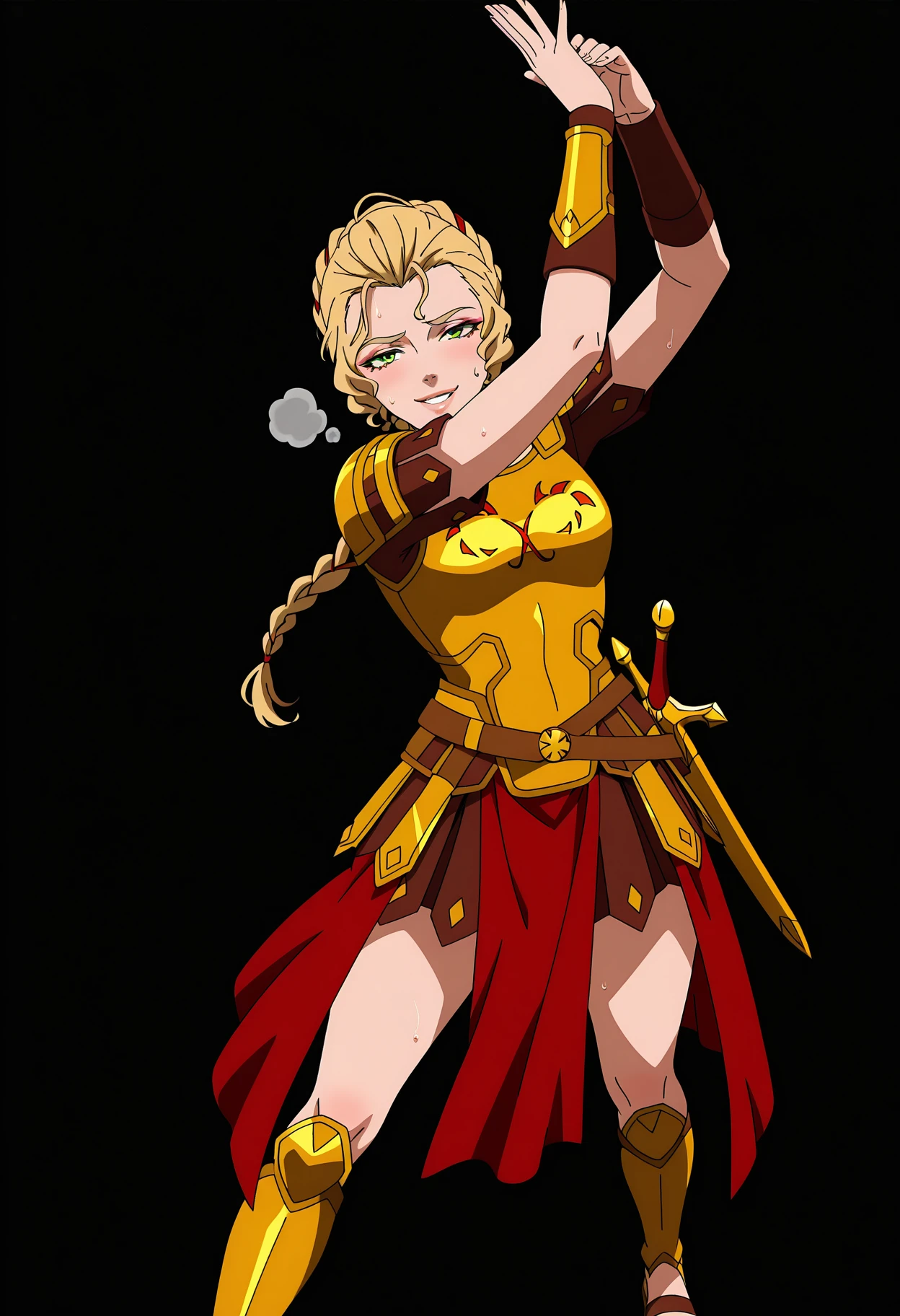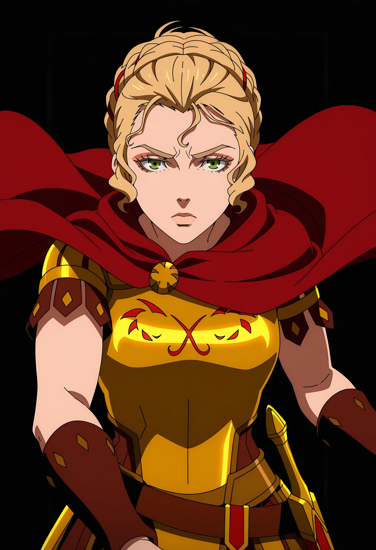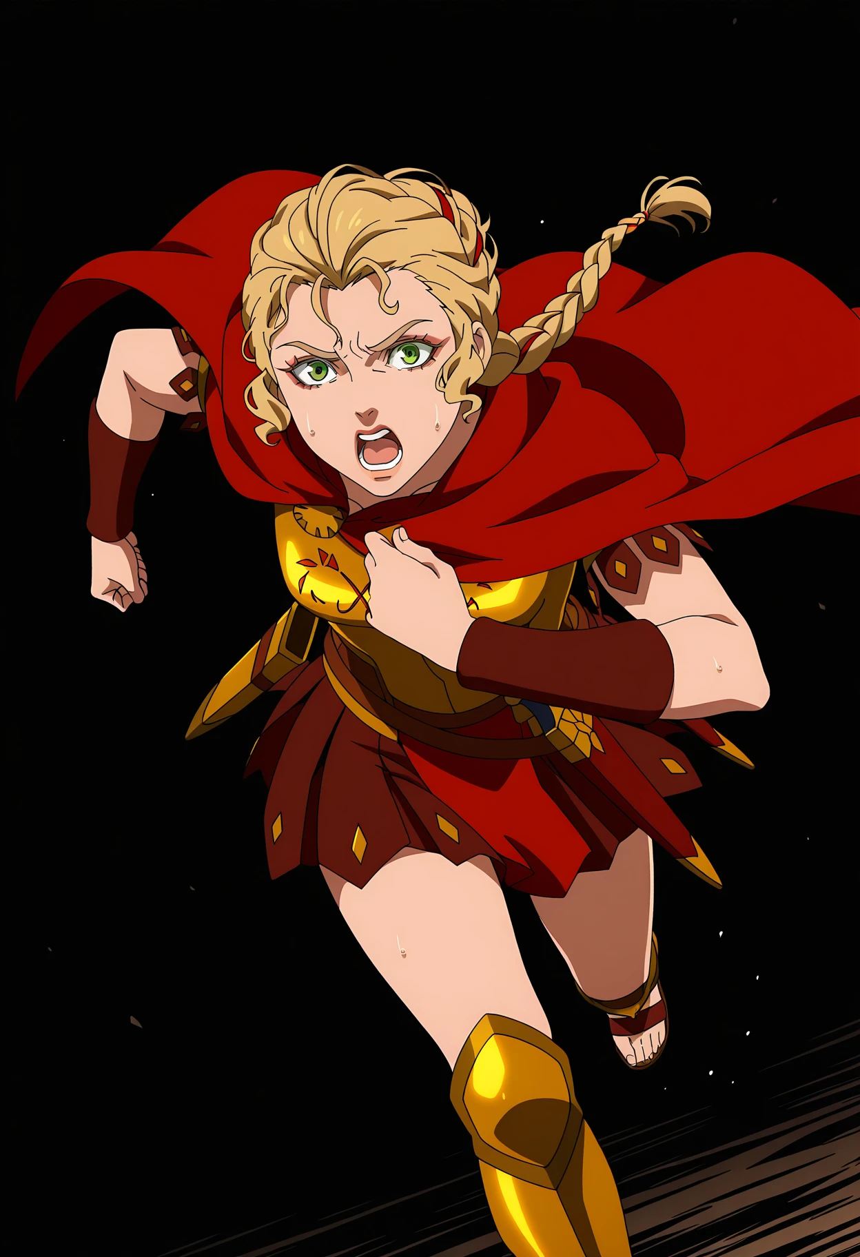 gold armor, shoulder armor, pauldrons, breastplate, red cape, bracer, vambraces, belt, , skirt, greaves, sandals