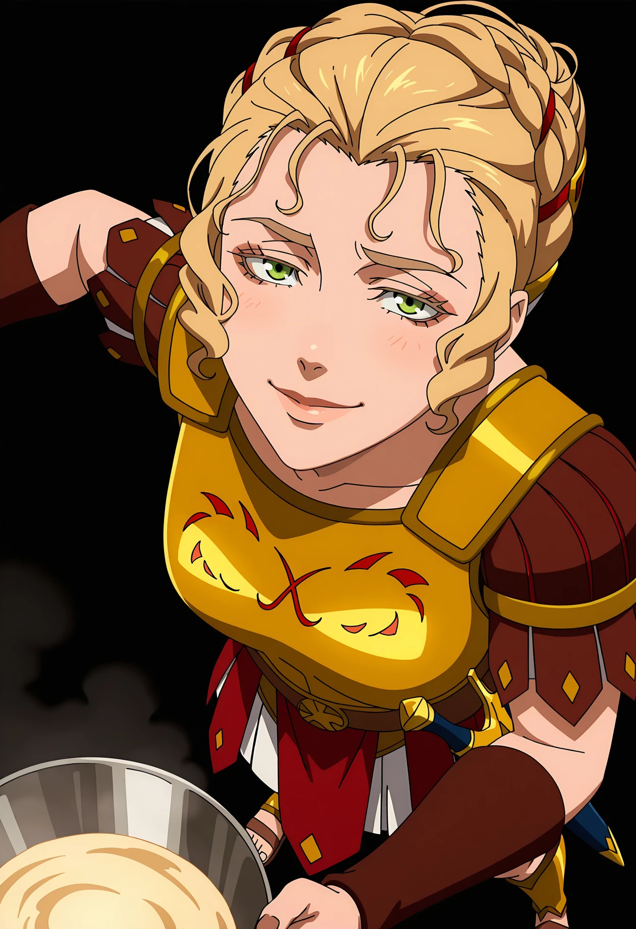 1girl, alexia, blonde hair, green eyes, short hair, makeup, lipstick, lips, braided bun