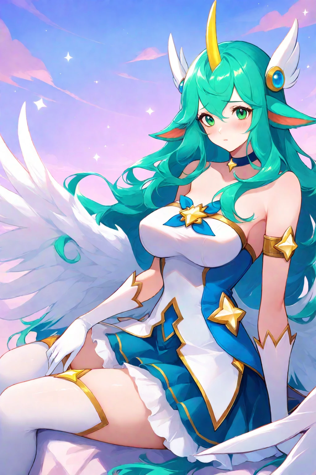 1girl,green hair,horns,long hair,singe horn,soraka_star,star guardian \(league of legends\),bare shoulders,green eyes,animal ears,gloves,magical girl,white gloves,breasts,very long hair,skirt,alternate costume,armlet,choker,alternate hair color,pointy ears,elbow gloves,white thighhighs,wings,hair between eyes,bangs,feathered wings,large breasts,hair ornament,
