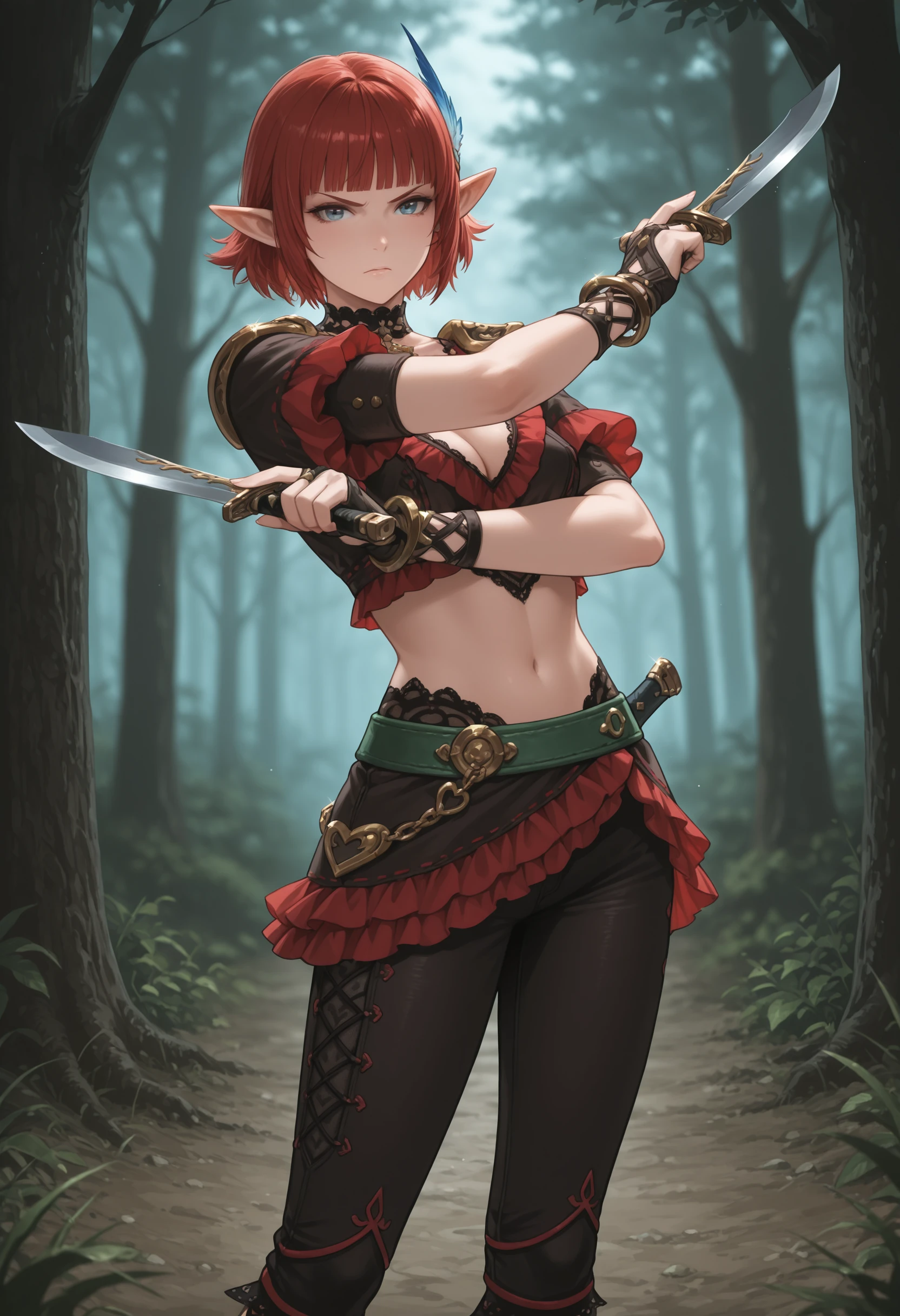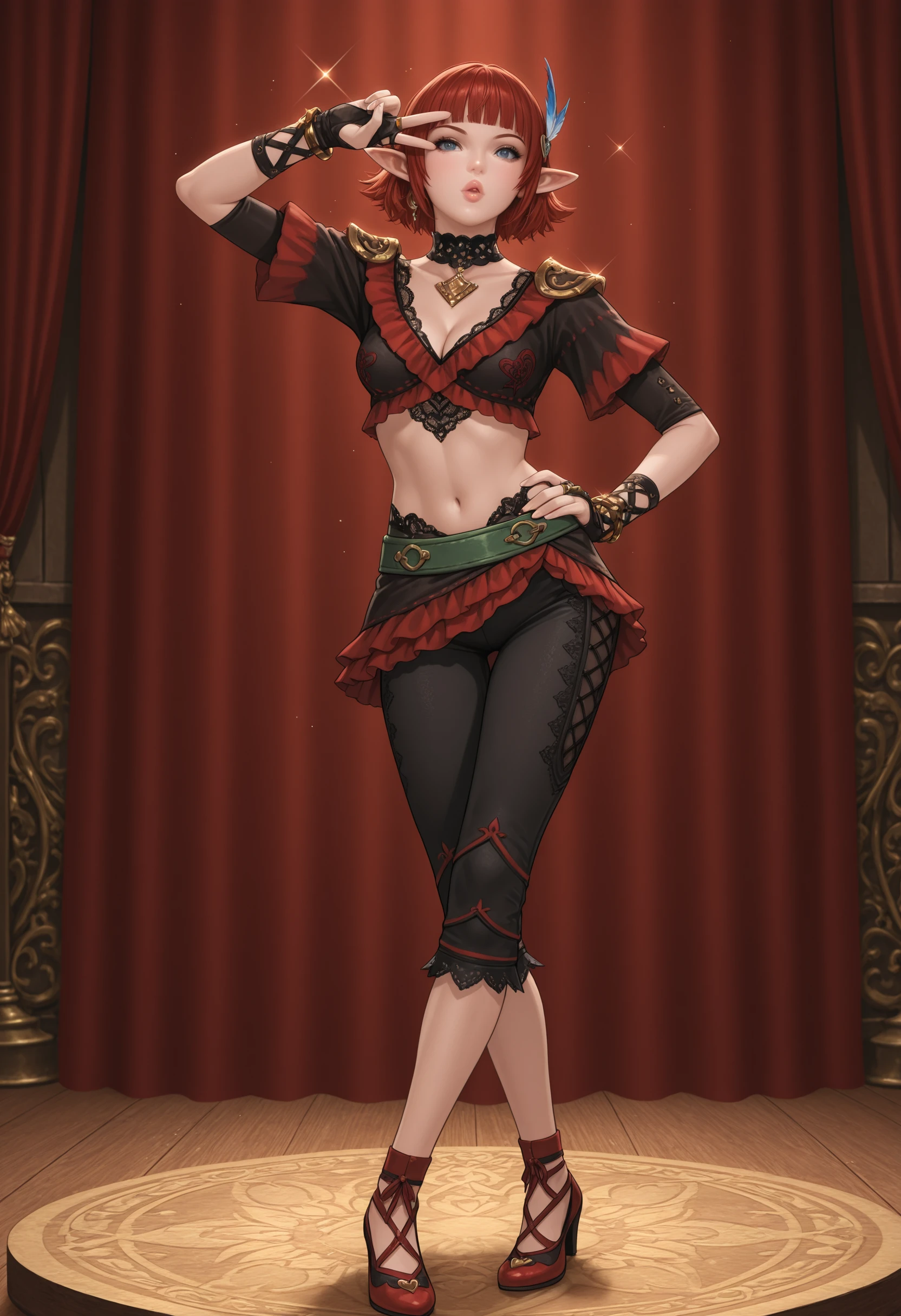 lili5ette, pointy ears, elf, blue eyes, red hair, short hair, flipped hair, blunt bangs, feather hair ornament, single earring, The full Dancer ensemble: