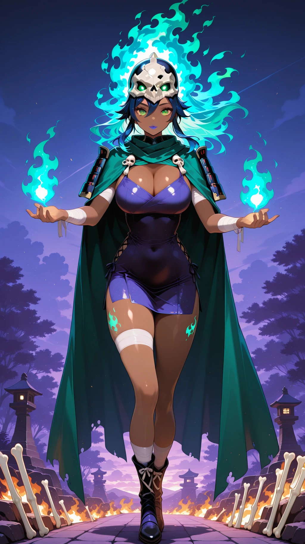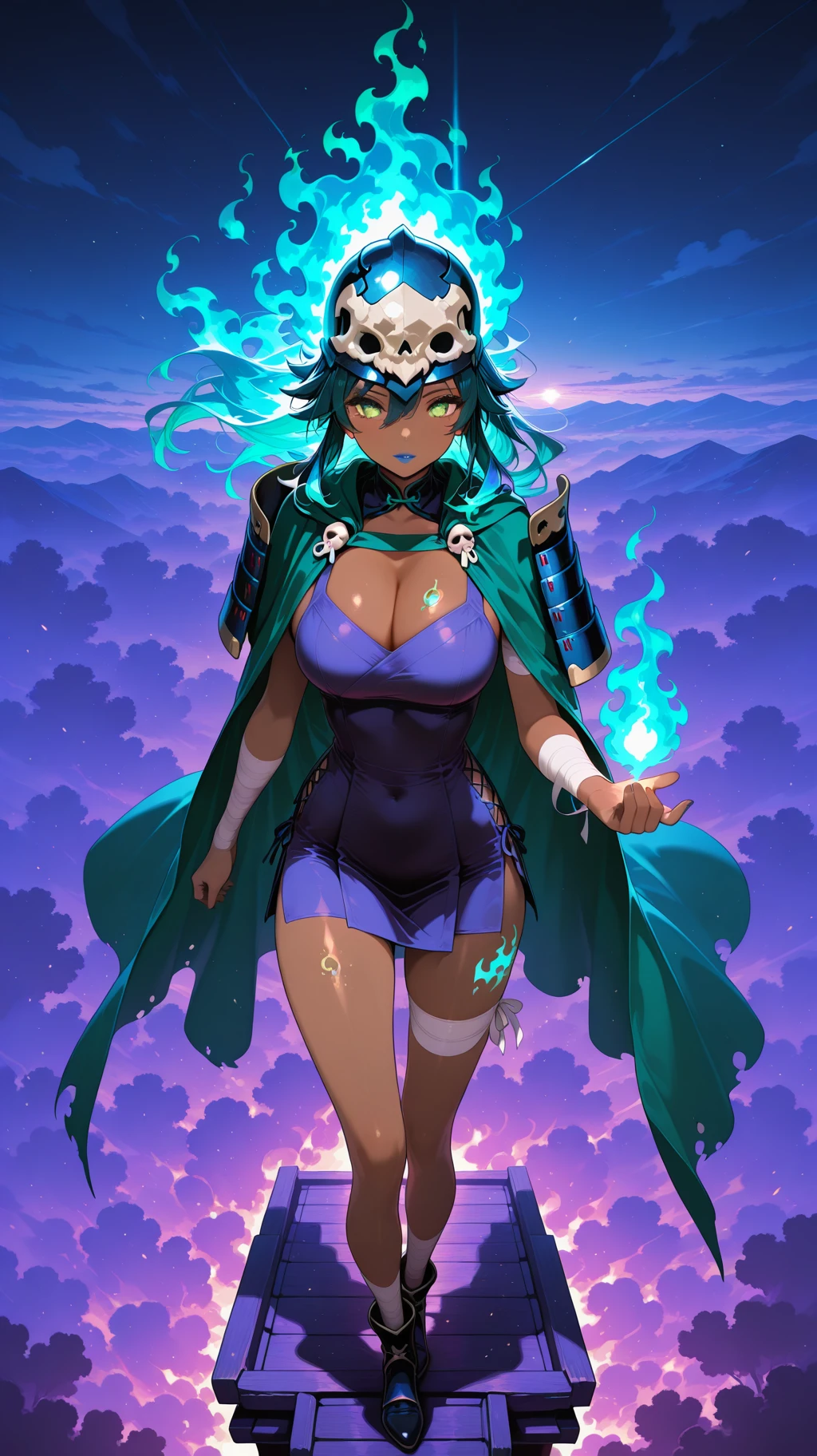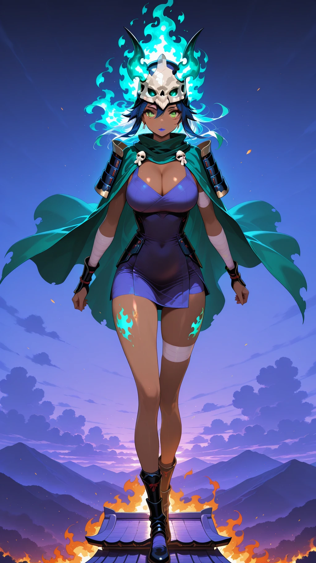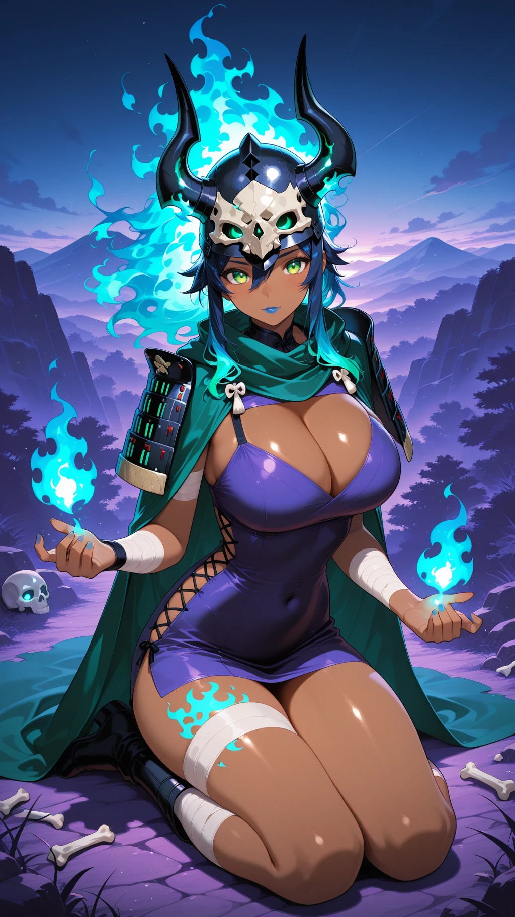 bandages, dark skin, dark-skinned female, green eyes, long hair, half skull helmet, green cloak, bandages, bandage dress, cleavage, bandaged arms, bandaged legs ,bone japanese armor, bone, yellow eyes, blue hair,( fiery hair, ):2, colored skin,blue lips, large breasts, tan skin,dark-skinned female, green eyes, long hair, half skull helmet, green cloak, bandages, bandage dress, cleavage, bandaged arms, bandaged legs,horned_helmet