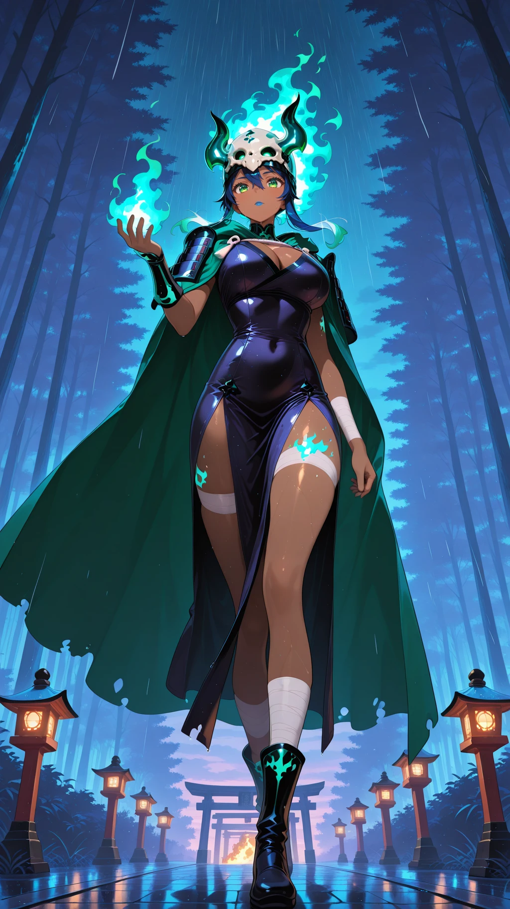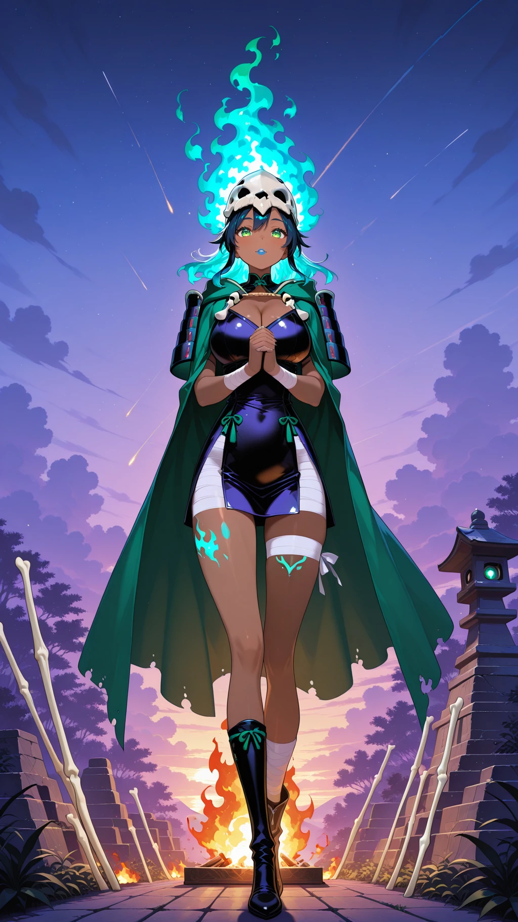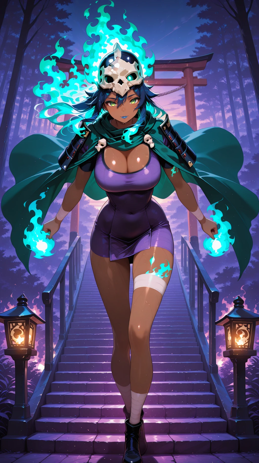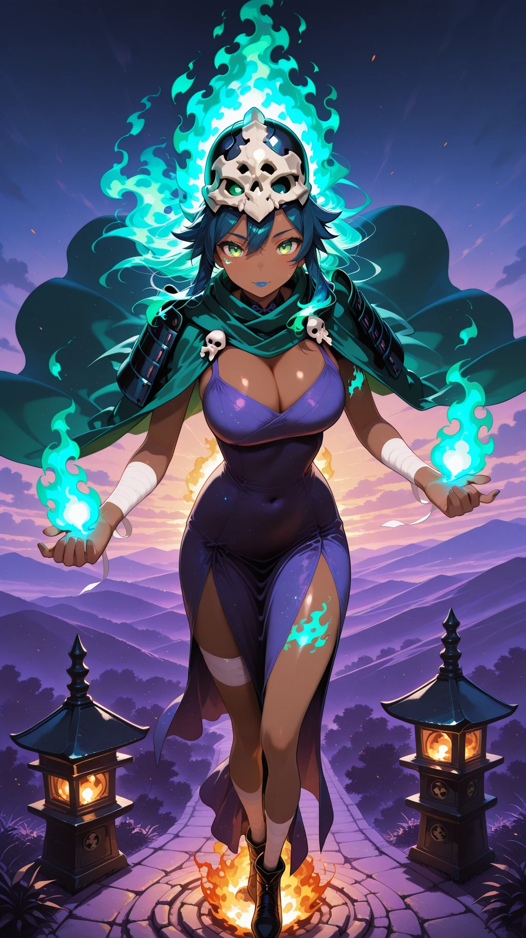bandages, dark skin, dark-skinned female, green eyes, long hair, half skull helmet, green cloak, bandages, bandage dress, cleavage, bandaged arms, bandaged legs ,bone japanese armor, bone, yellow eyes, blue hair,( fiery hair, ):2, colored skin,blue lips, large breasts, tan skin,dark-skinned female, green eyes, long hair, half skull helmet, green cloak, bandages, bandage dress, cleavage, bandaged arms, bandaged legs,horned_helmet