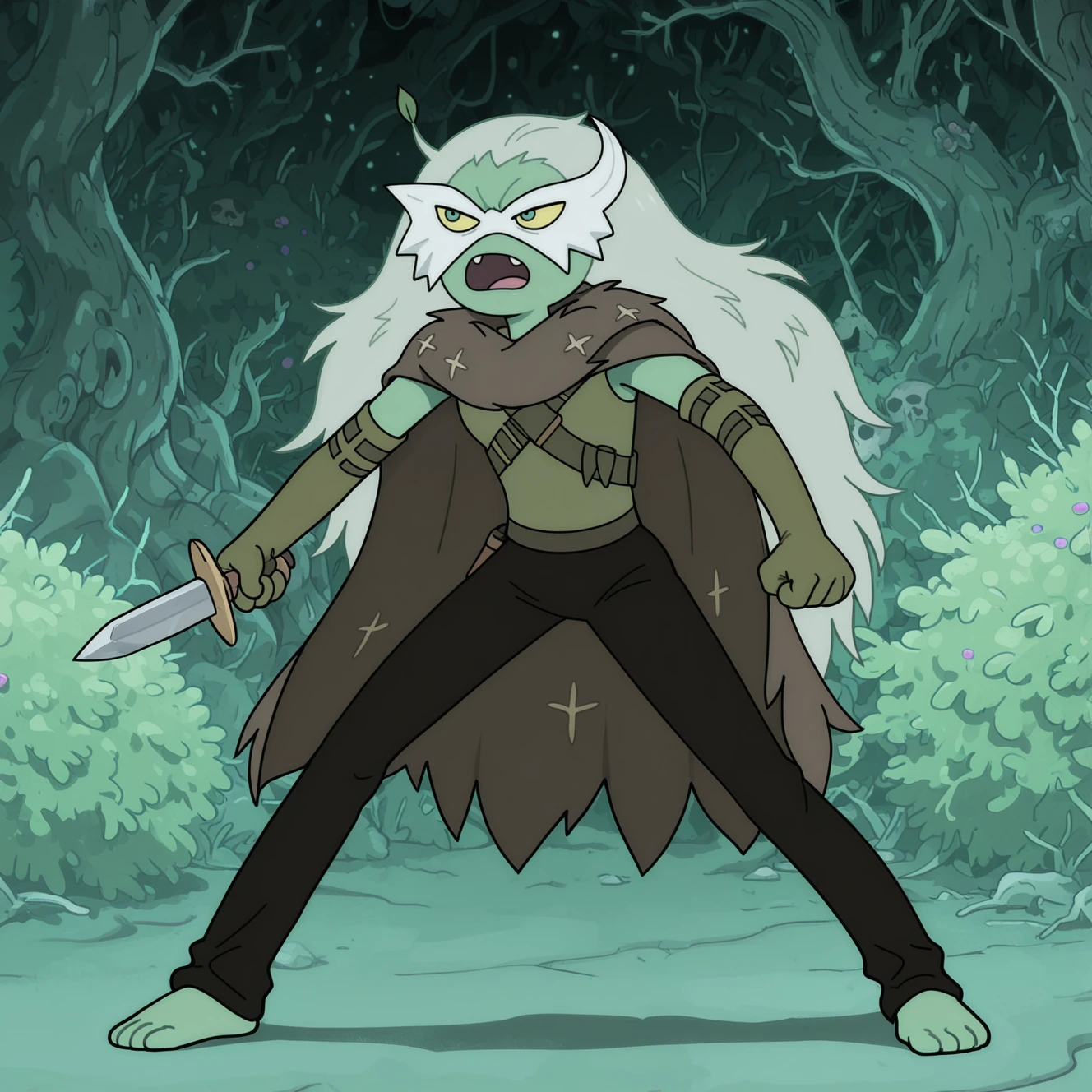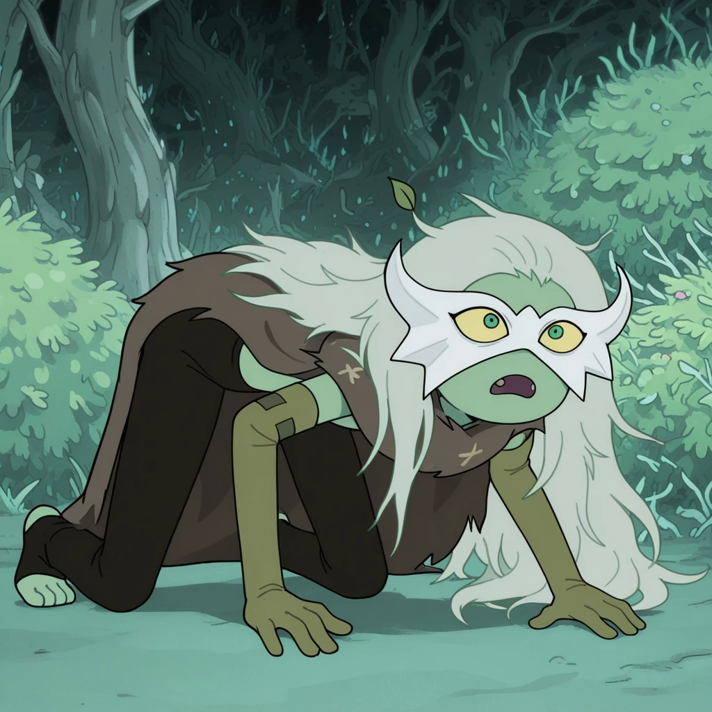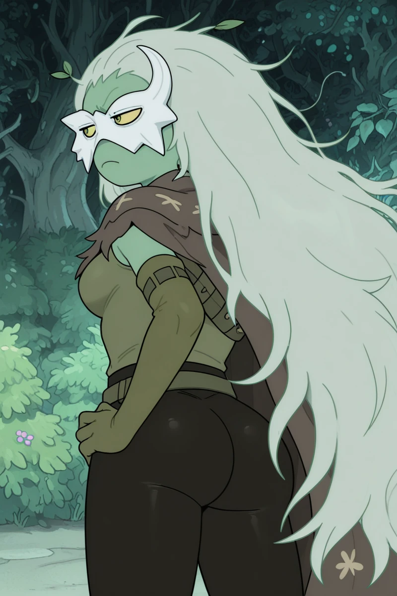WW_gr33nl4dy_AT, flat colors, solo, female, noseless, humanoid, eyemask, white eyewear, grey hair, long long hair, messy hair, hair on shoulder, 4 fingers, yellow sclera, green eyes, green body, green skin, brown cloak, green elbow gloves, black pants, green topwear, bandolier, animal skin