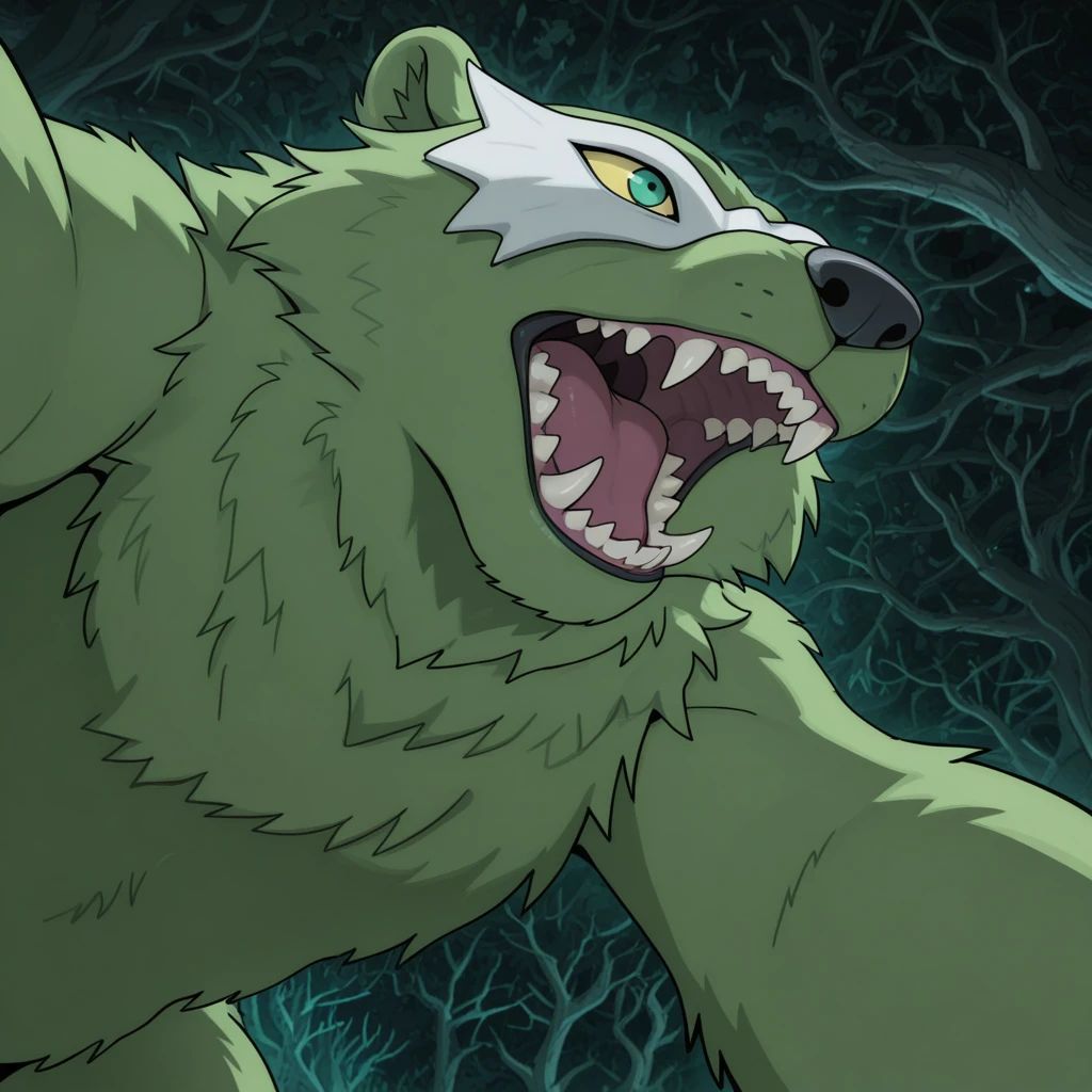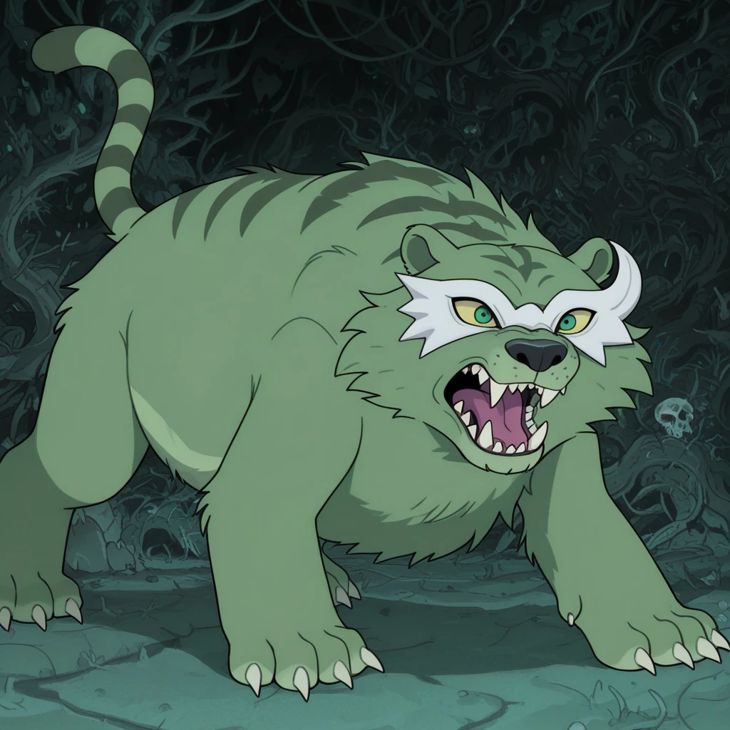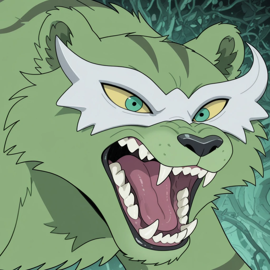 WW_gr33nl4dy_AT, flat colors, solo, female, noseless, humanoid, eyemask, white eyewear, grey hair, long long hair, messy hair, hair on shoulder, 4 fingers, yellow sclera, green eyes, green body, green skin, brown cloak, green elbow gloves, black pants, green topwear, bandolier, animal skin