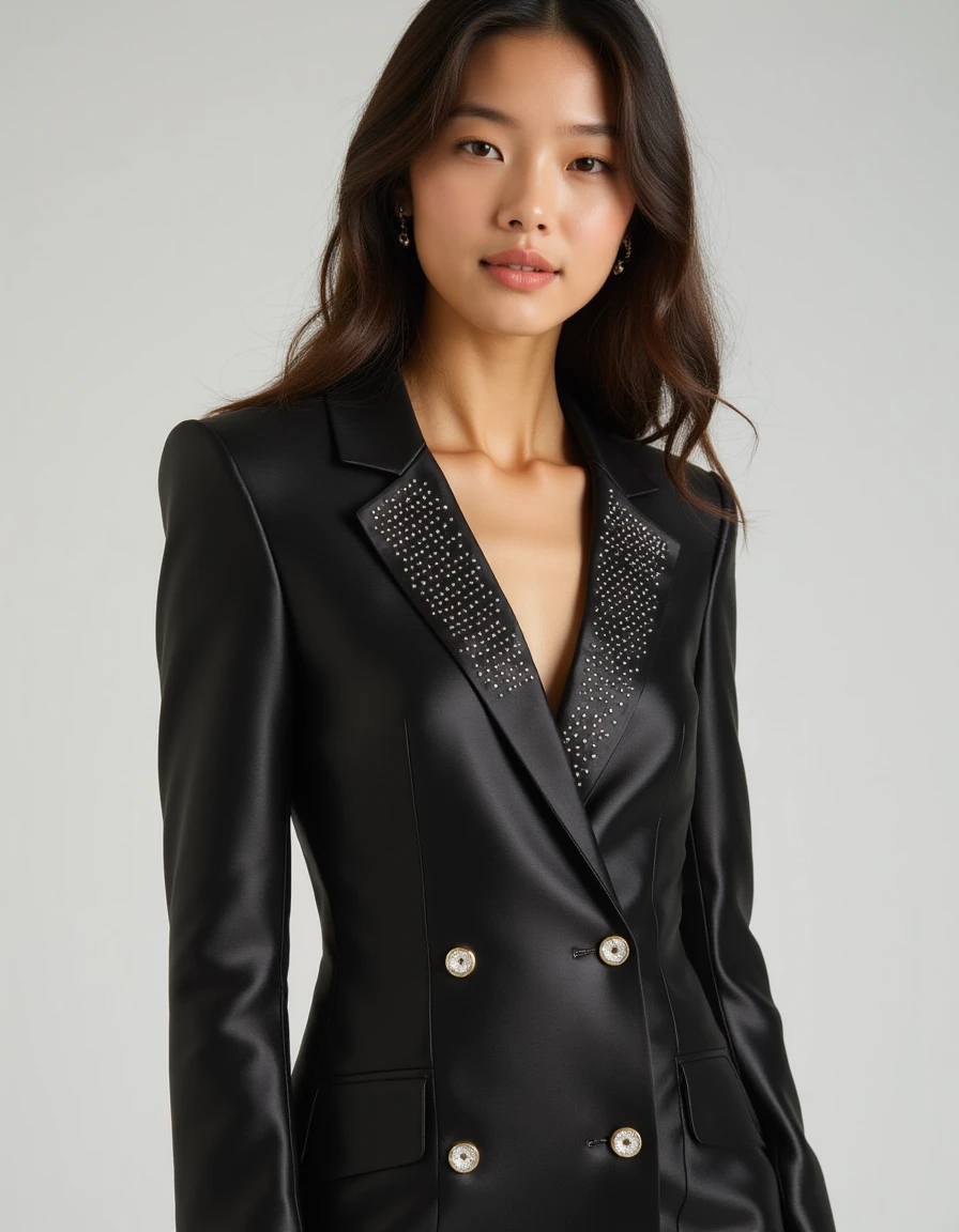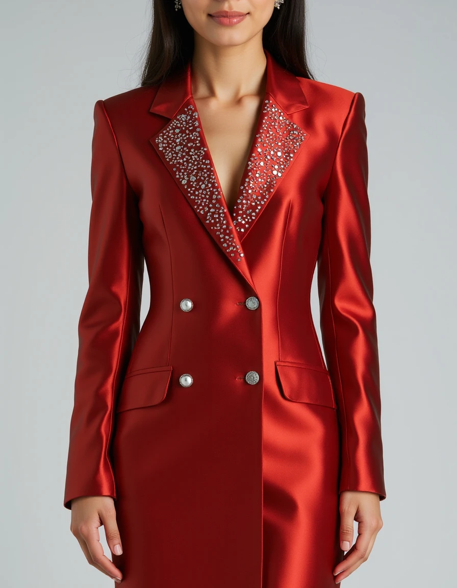 HWEG Dress, shiny silk blazer dress, decorated with silver stones on the collar and the end of the sleeves, 4 buttons on the dress,