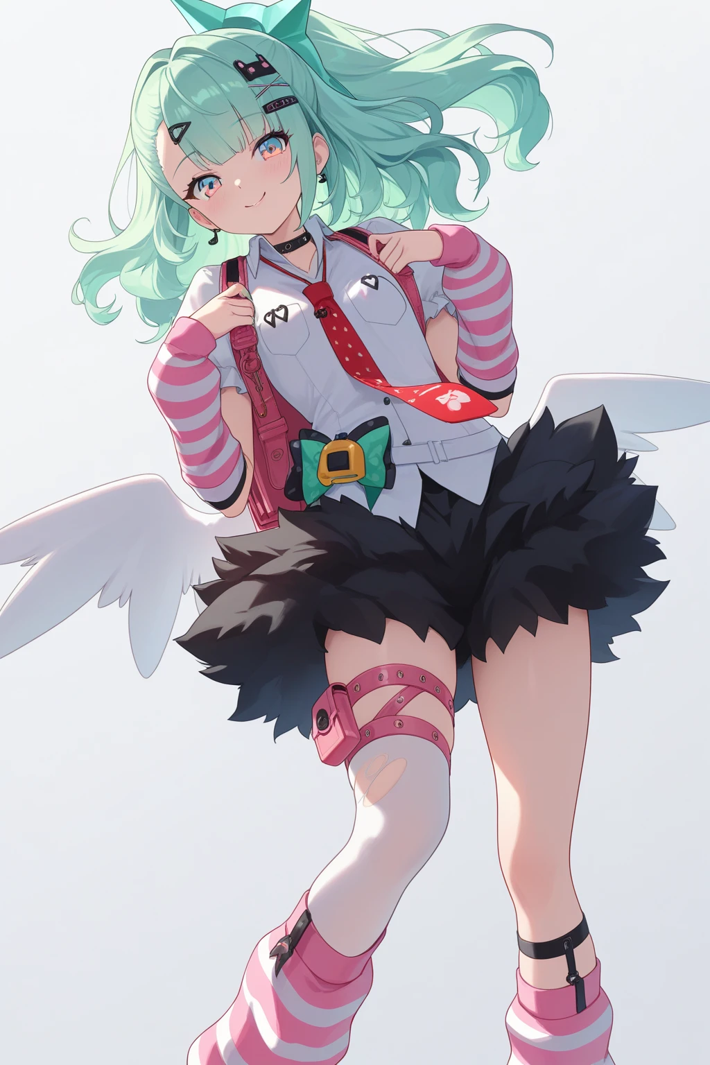 white_dress_shirt, short_sleeves, puffy_short_sleeves, detached_sleeves,loose_necktie, red_necktie,_pocket,striped_clothes, polka_dot, torn_clothes,hair_ornament, cat_ornament,