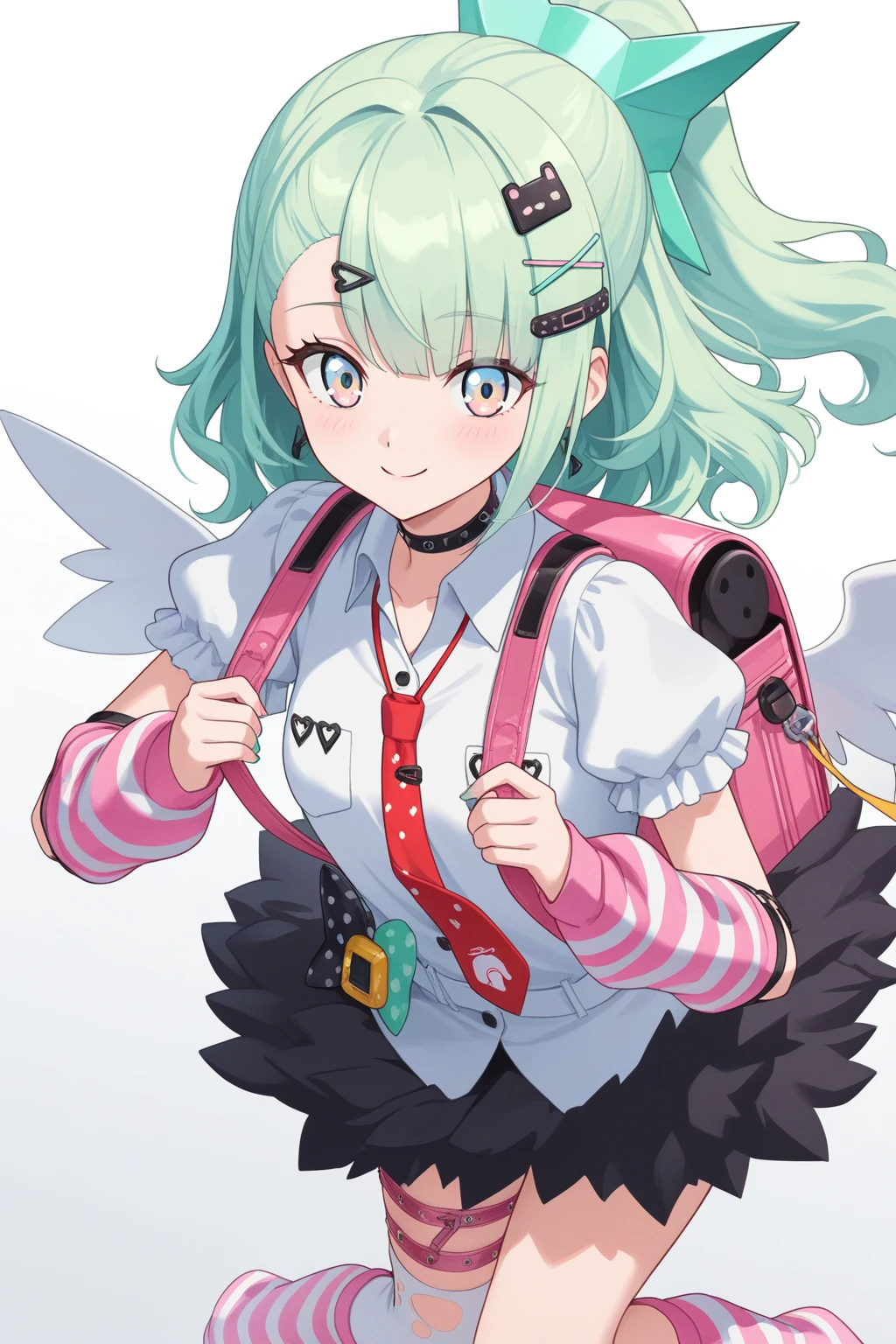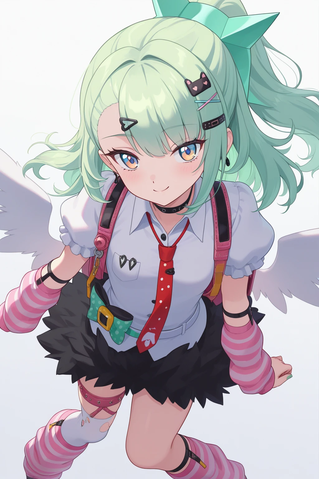 multicolored_eyes,green_hair, long_hair, ponytail,wings,nail_polish,