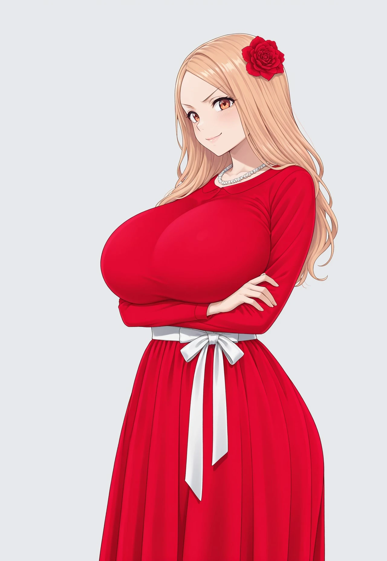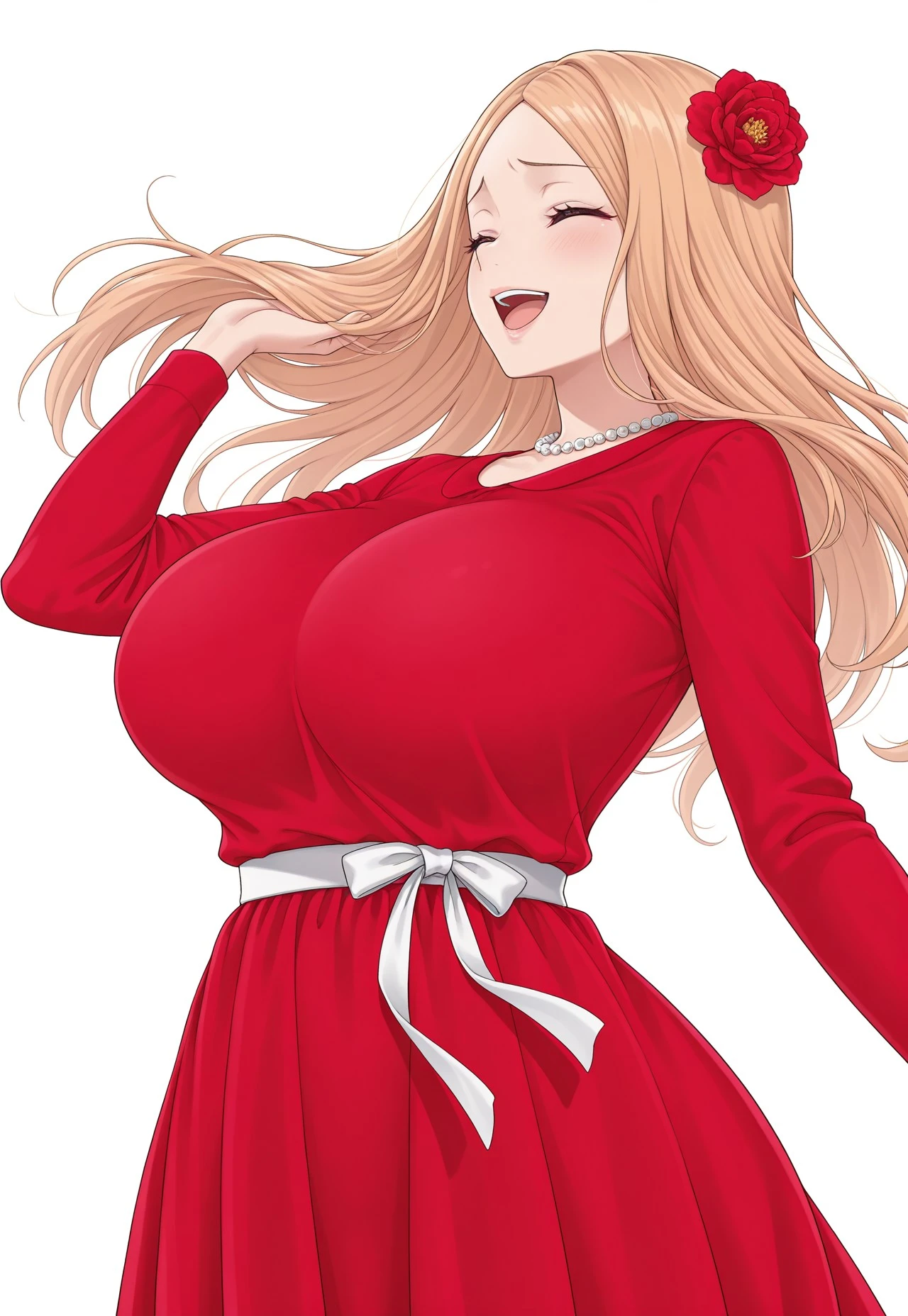 2nd outfit: red flower, hair flower, pearl necklace, medium dress, red dress, long sleeves, belt ribbon, white ribbon