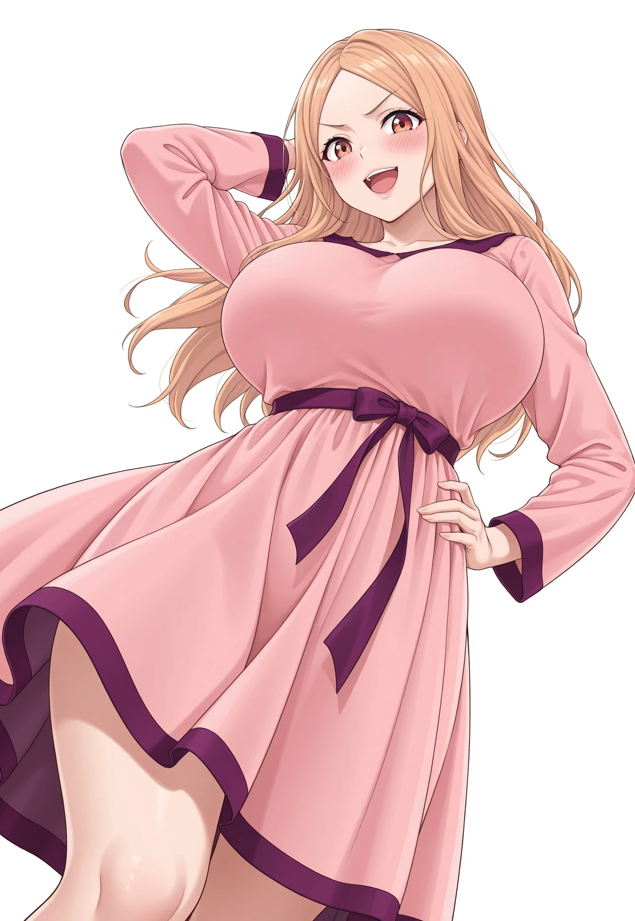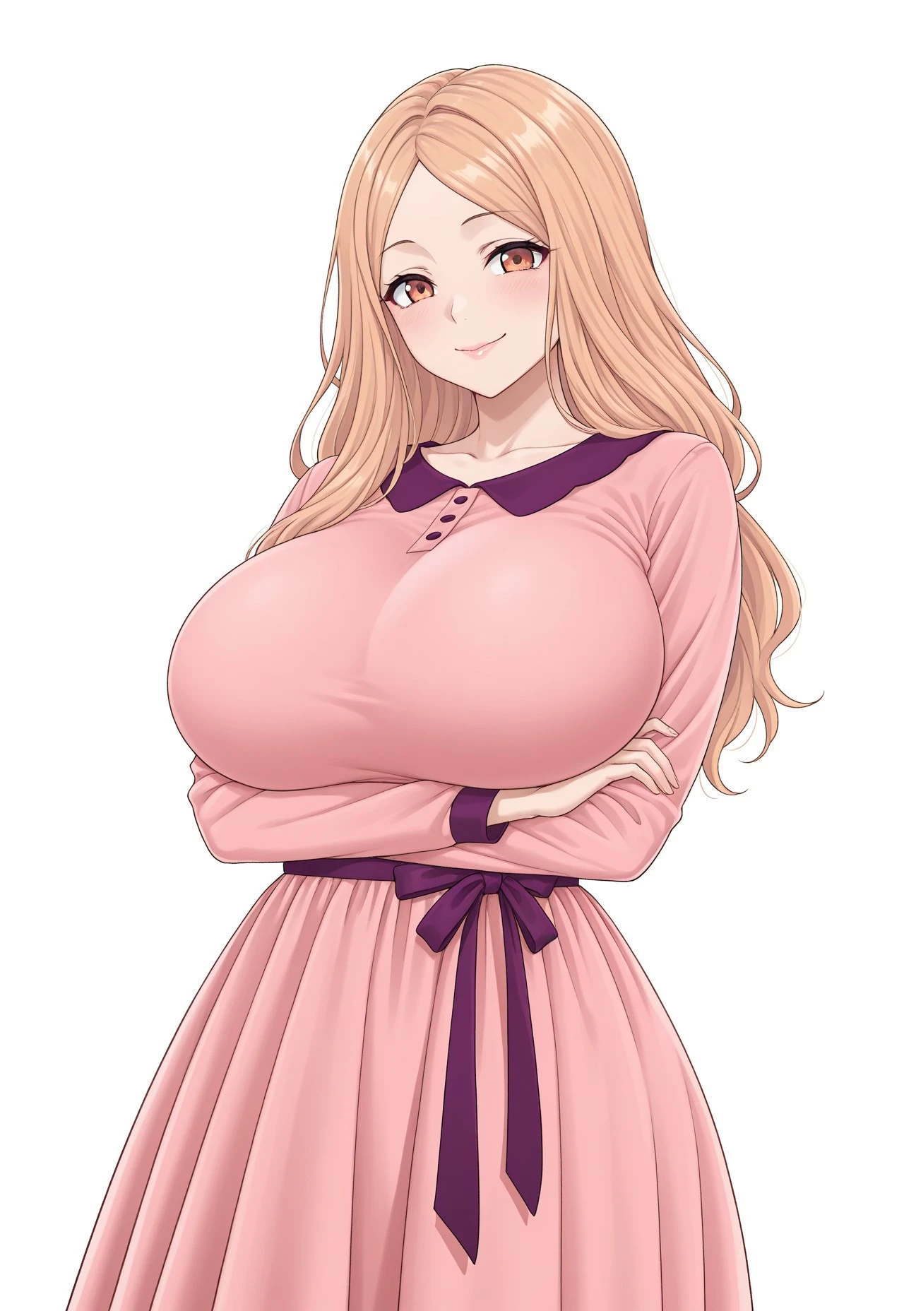 Tags: 1girl, saijo midori, curvy, long hair, orange hair, parted bangs, orange eyes, lips, huge breasts