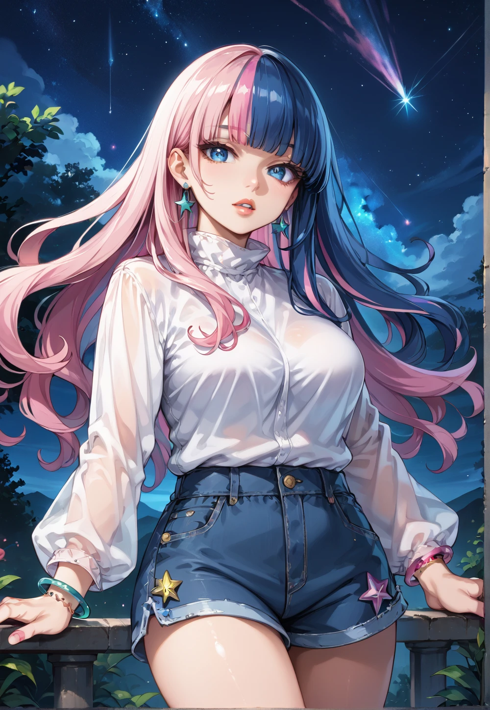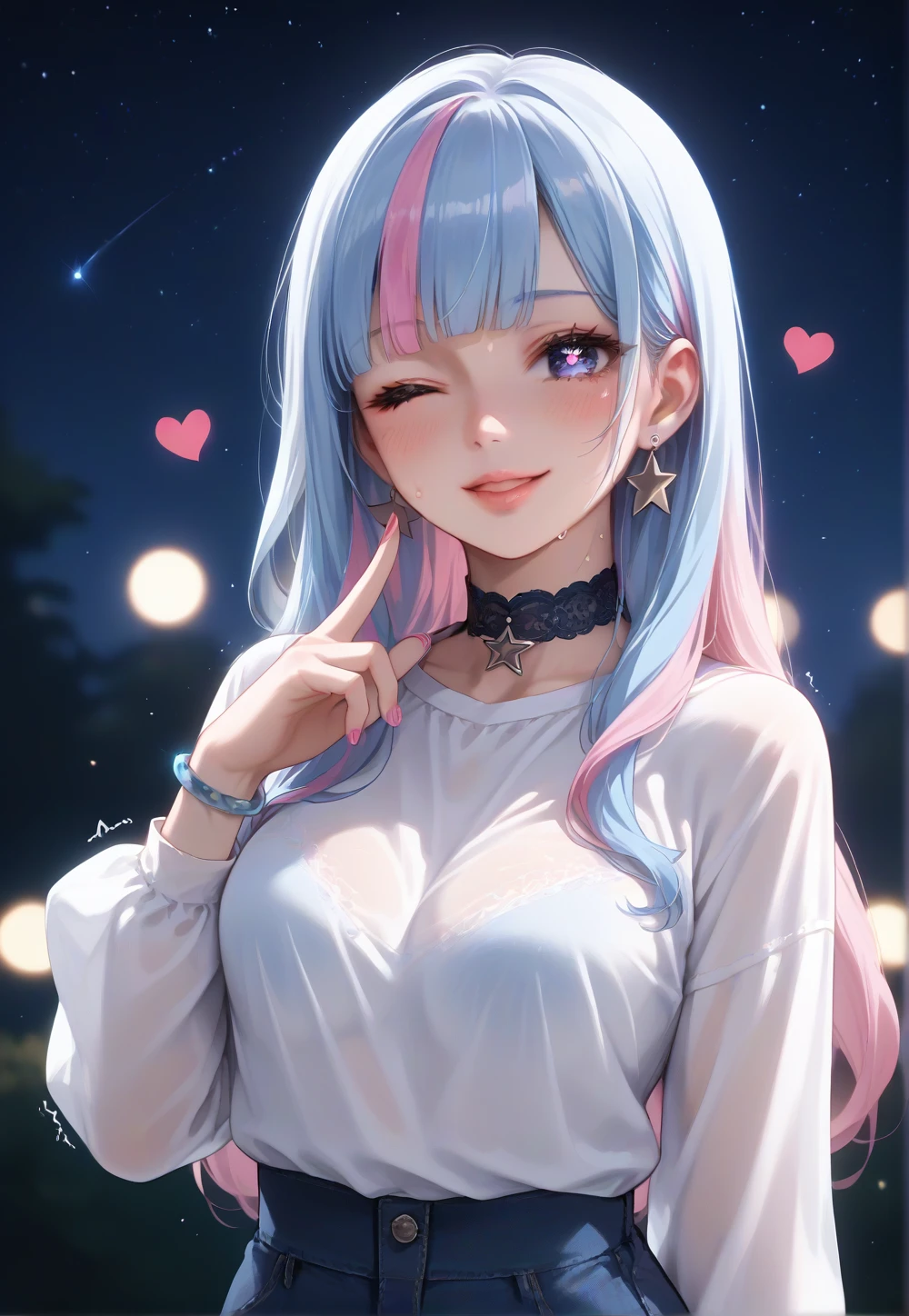 1girl, solo, multicolored hair, long hair, blue hair, pink hair, two tones hair, jewelry, bangs, earrings, blue eyes, blunt bangs, straked hair, pink nails
