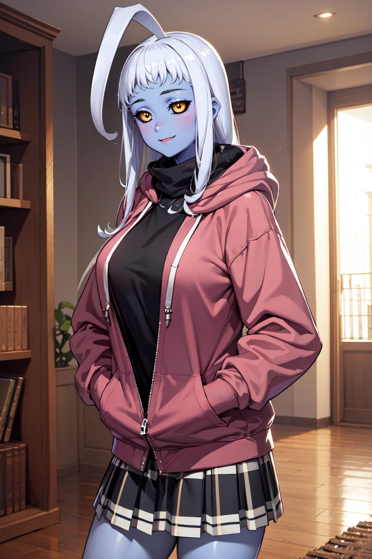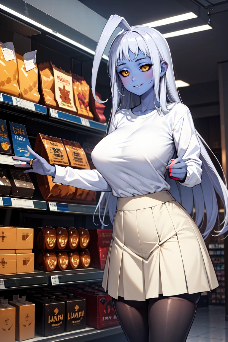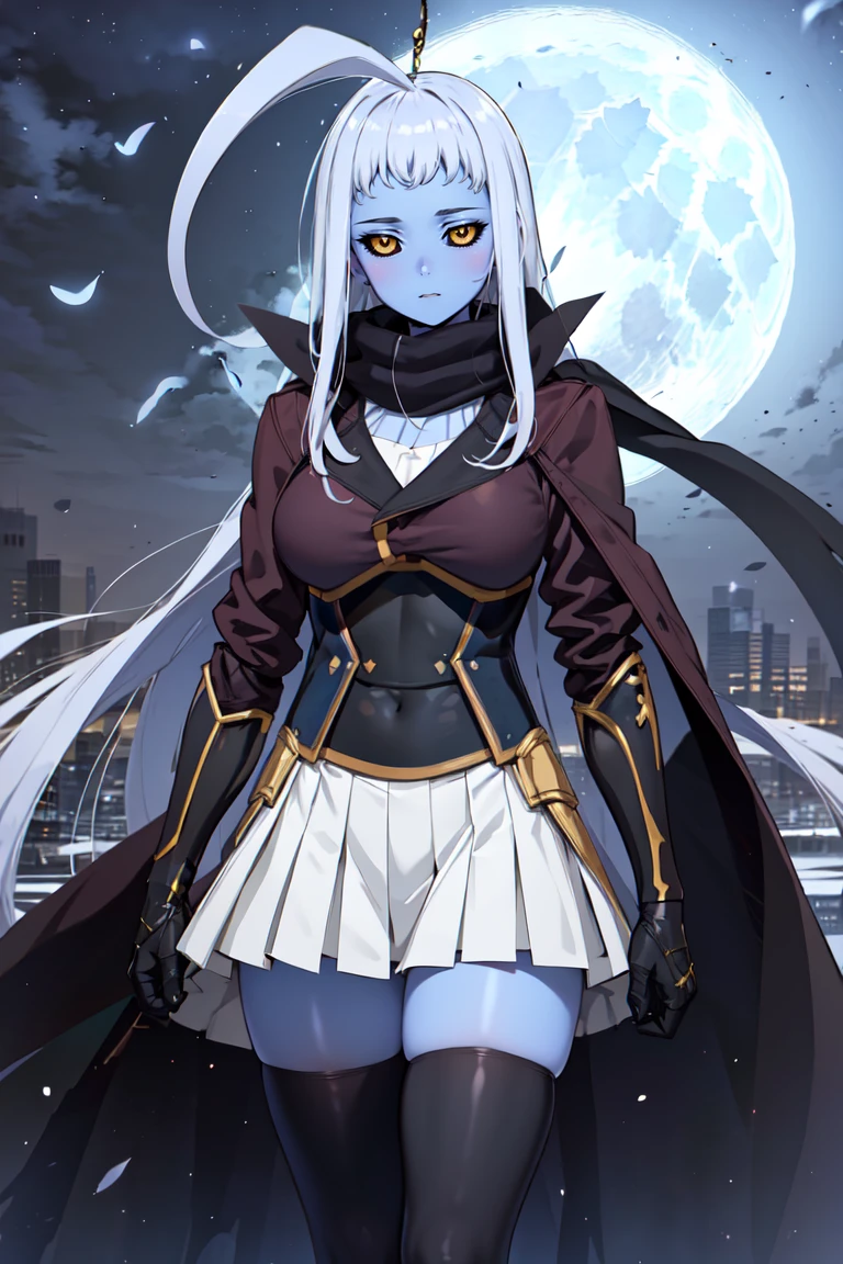 "LalaBase, black sclera, colored skin, huge ahoge, scarf, black coat, armored waist, white skirt, black gauntlets, black thighhighs"