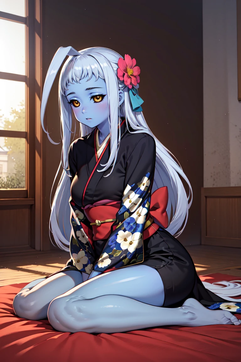 Add "black sclera, colored skin, huge ahoge" for her standard appearance.